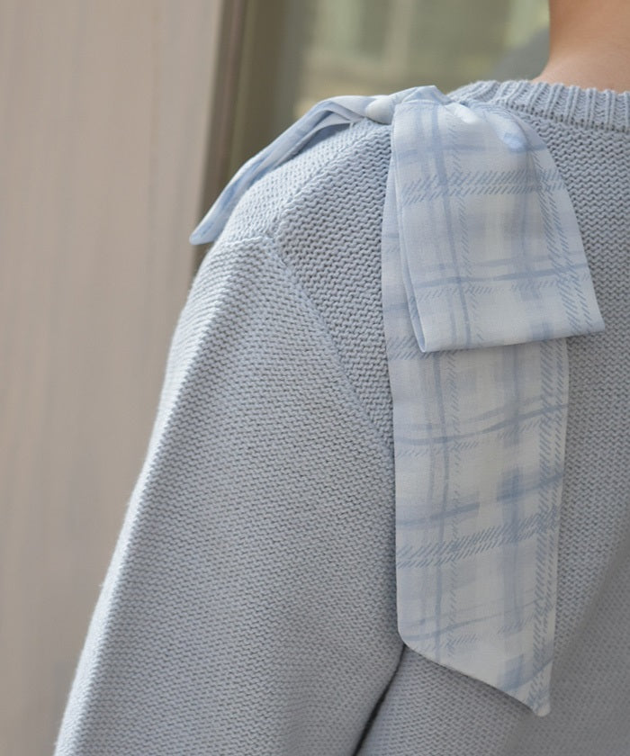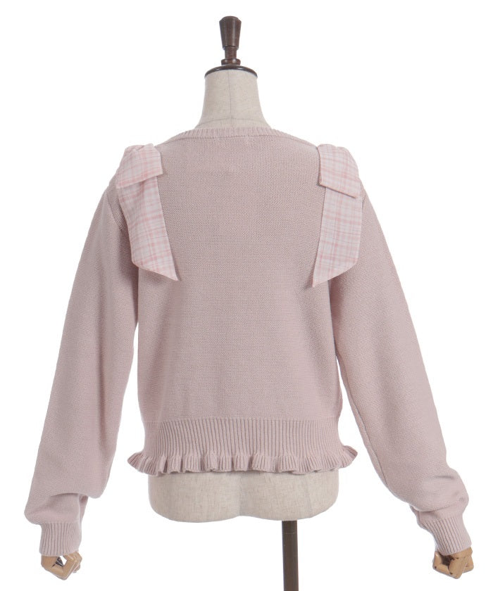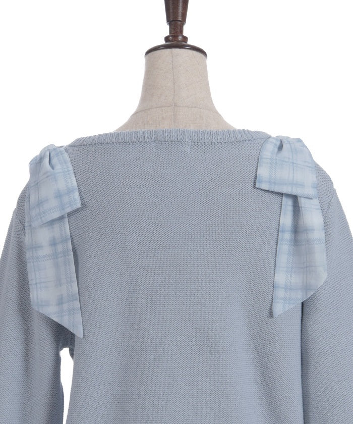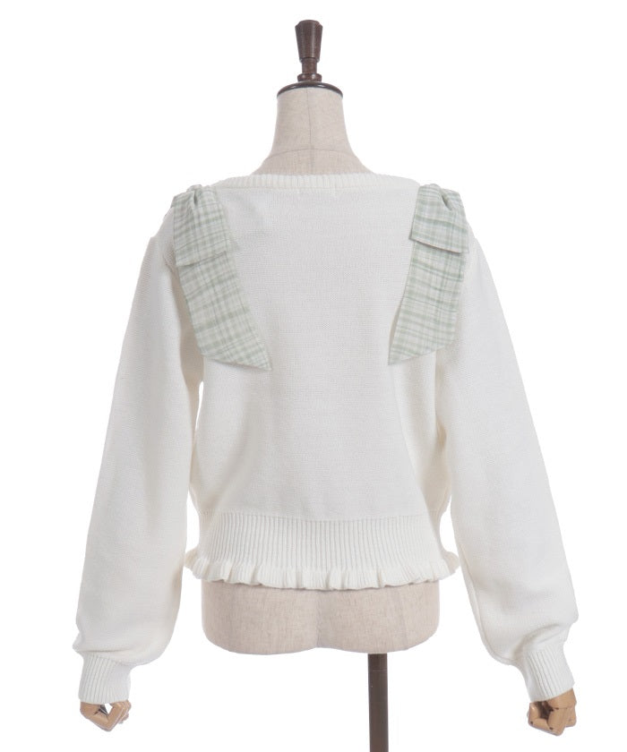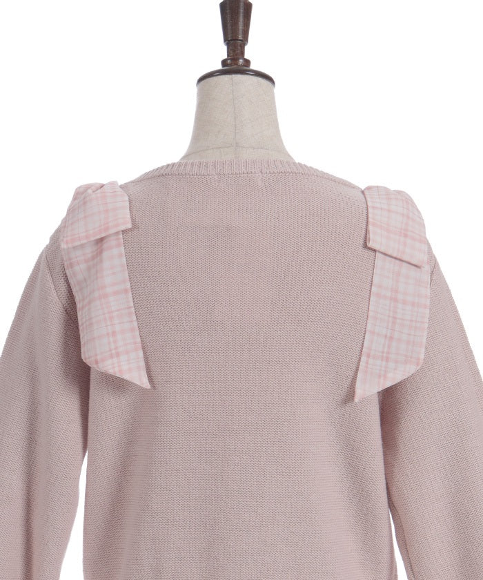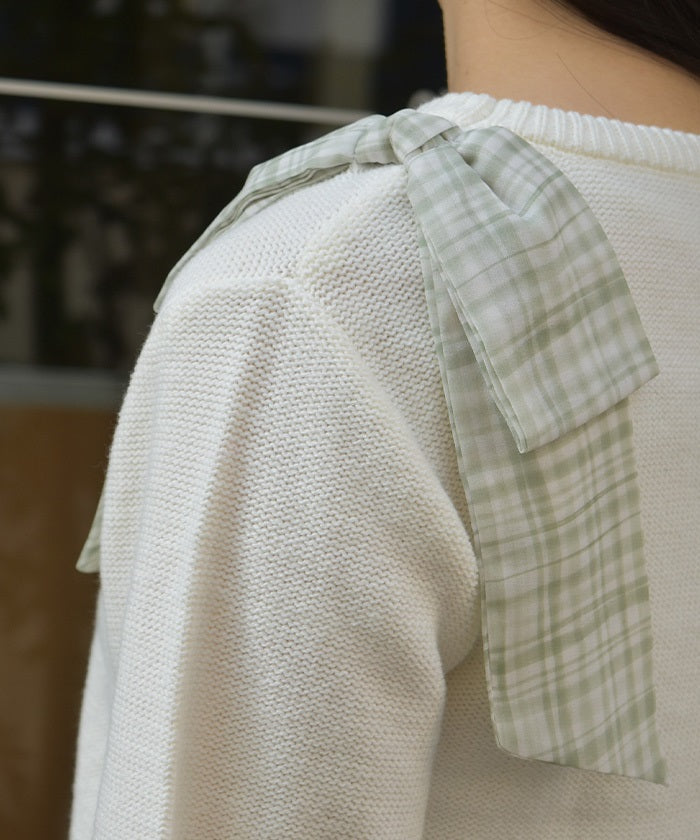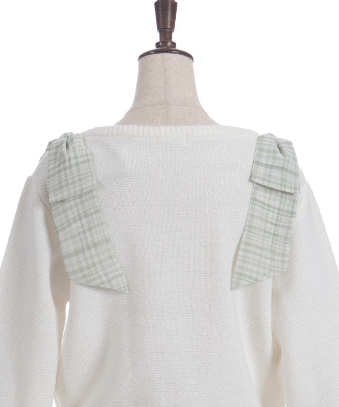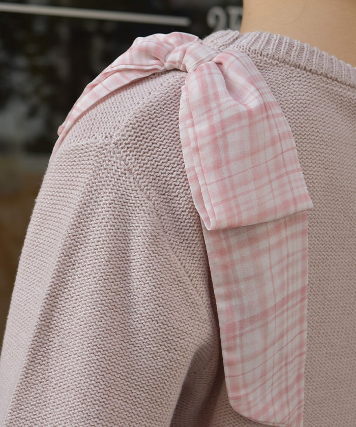 This knit features a checkered shoulder ribbon design.