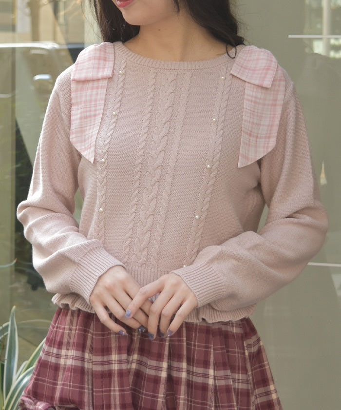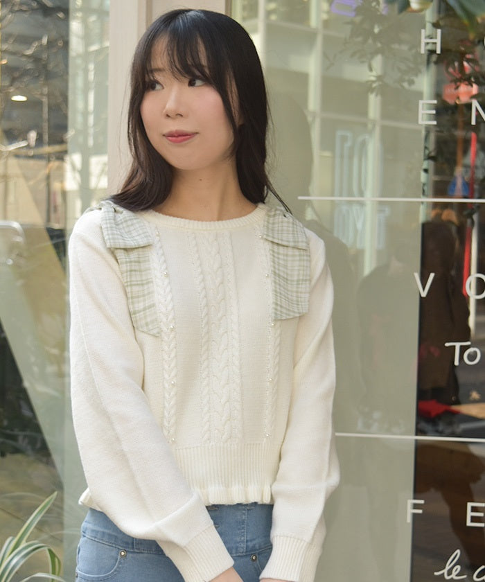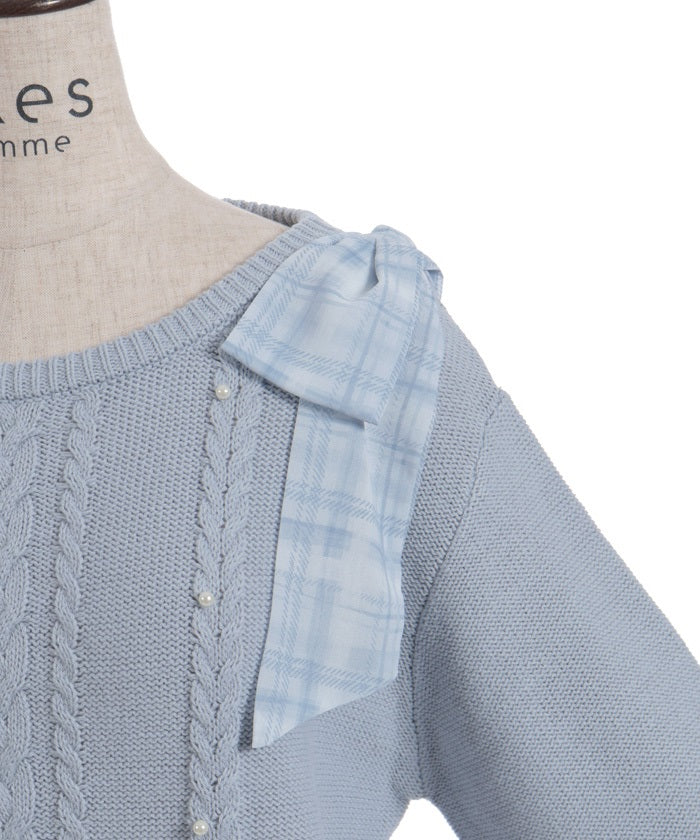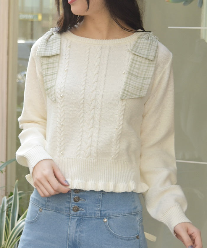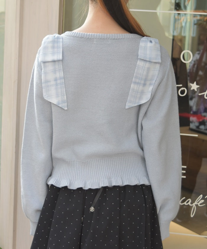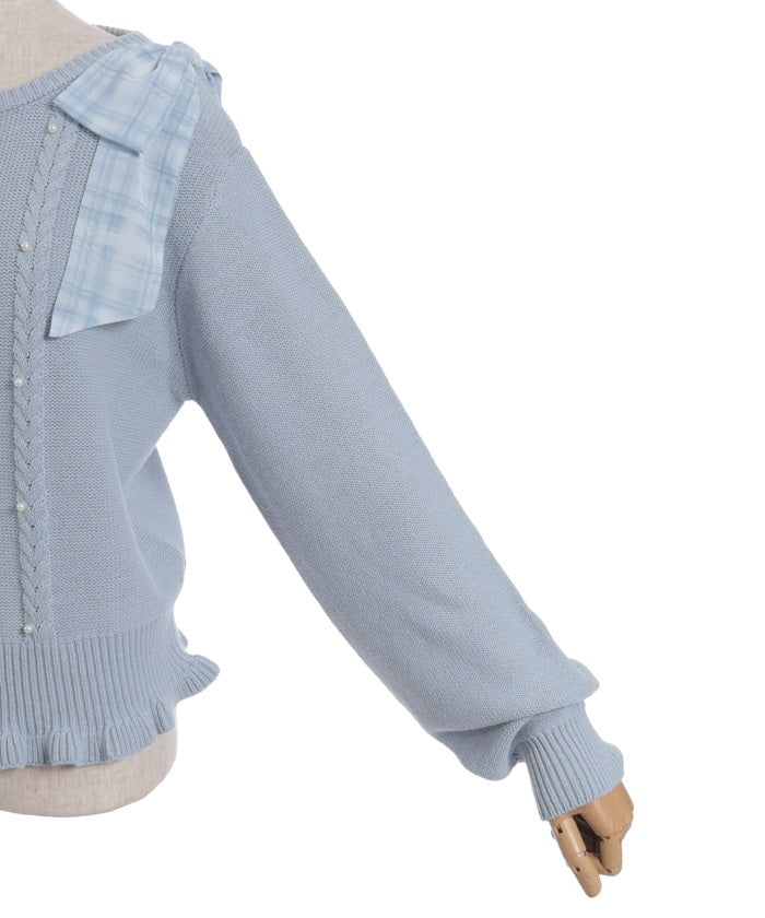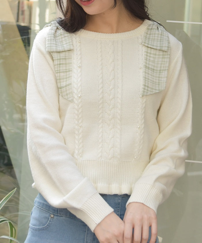 This knit features a checkered shoulder ribbon design.