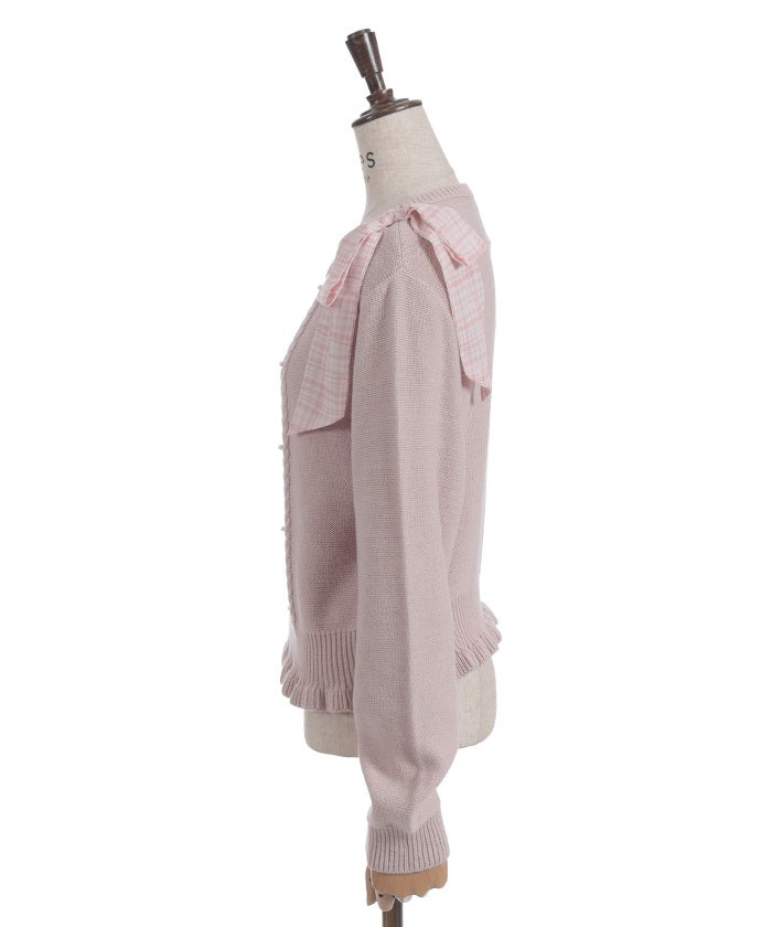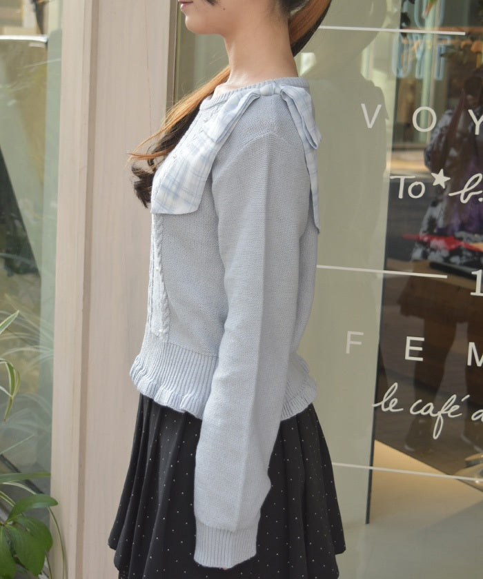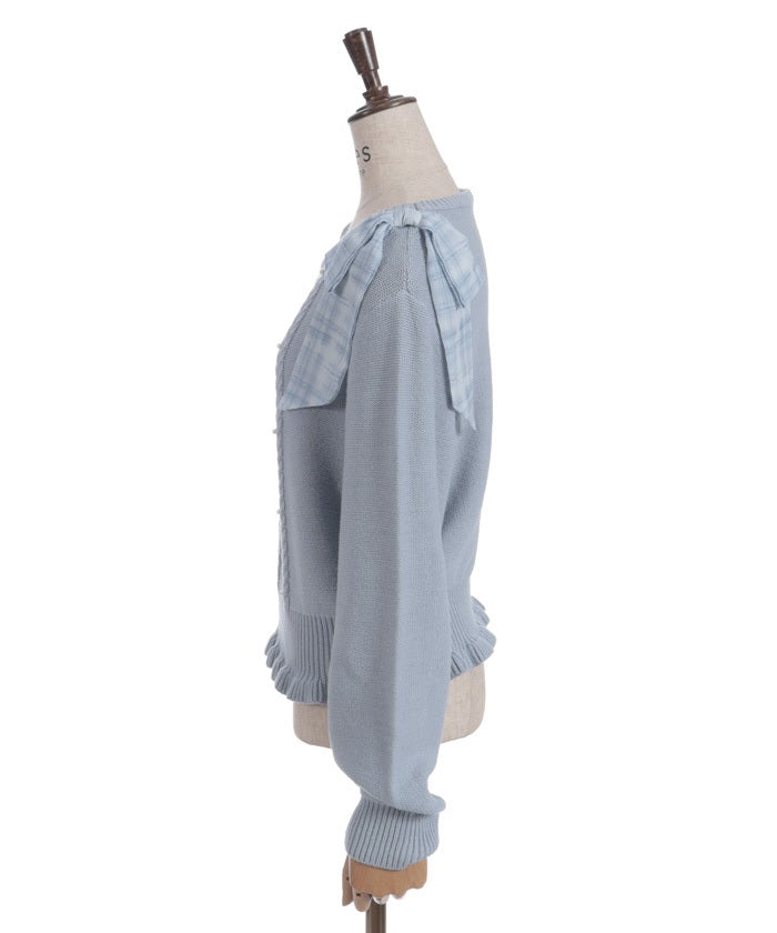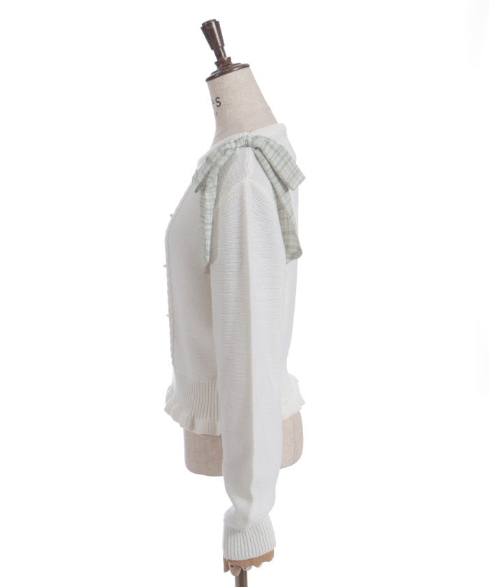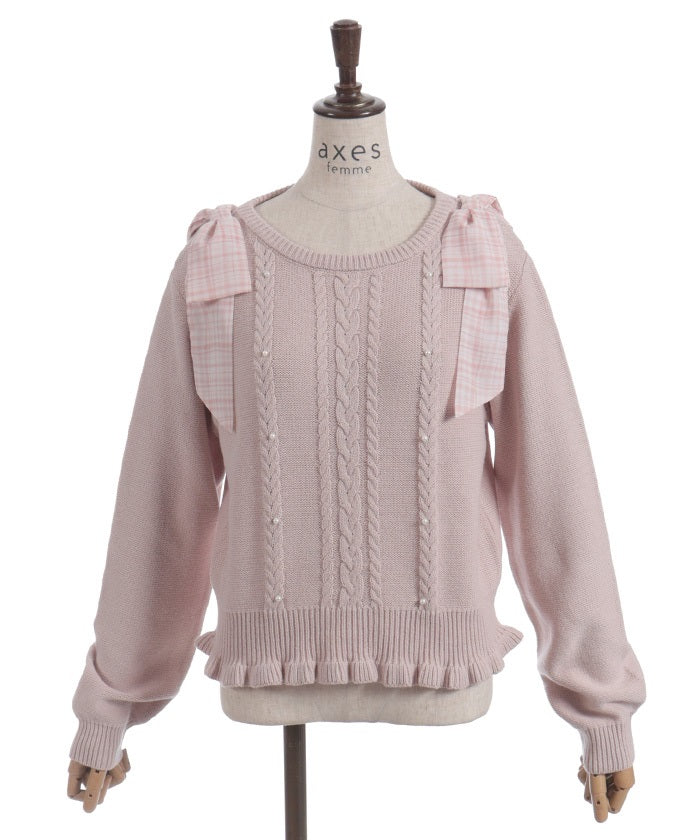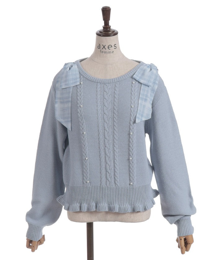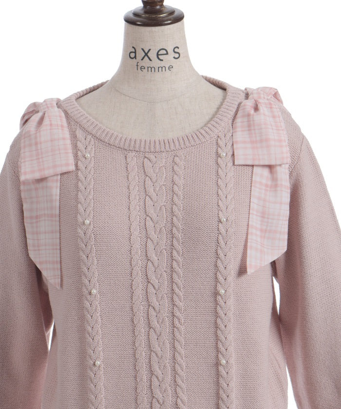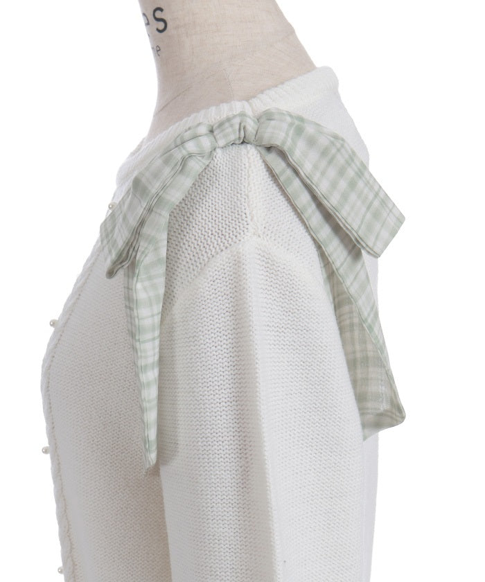 This knit features a checkered shoulder ribbon design.