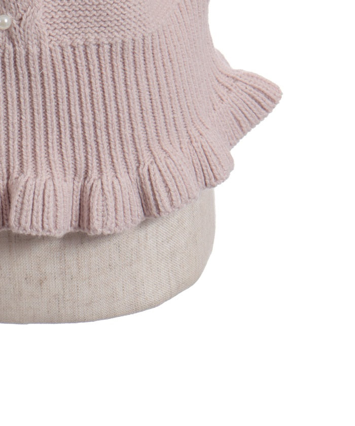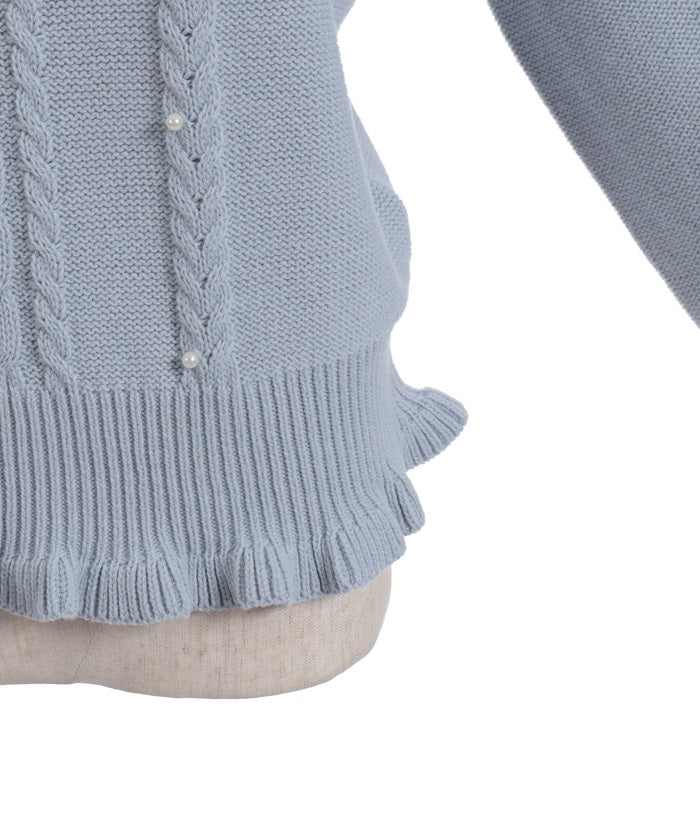 The knit body features a simple cable design embellished with pearls for a feminine touch.