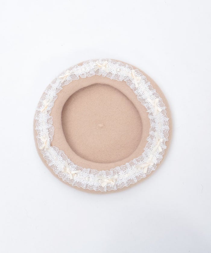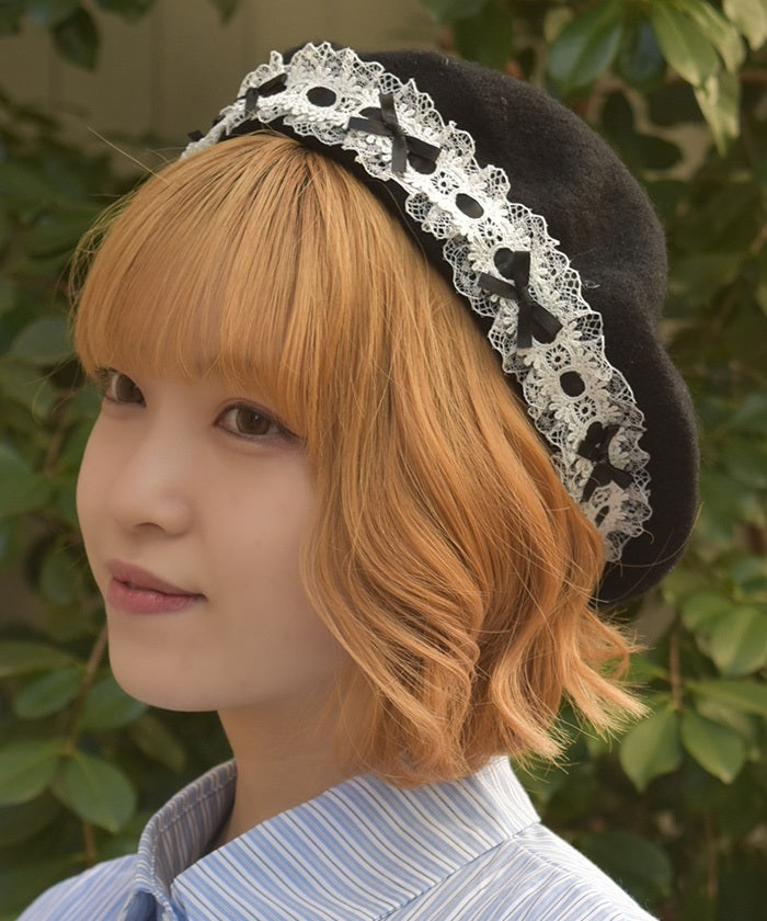 This beret features ladder lace and ribbon accents.
