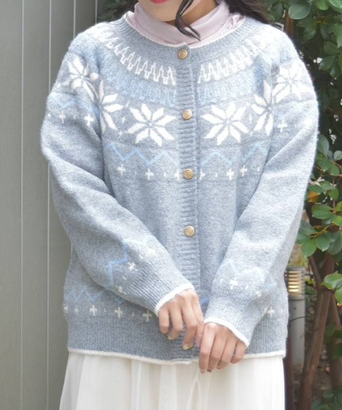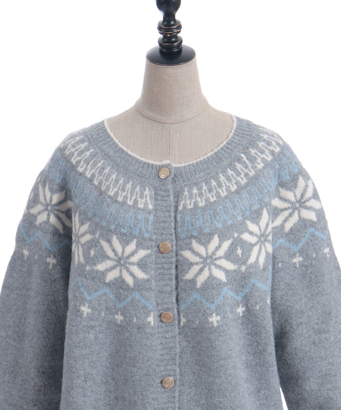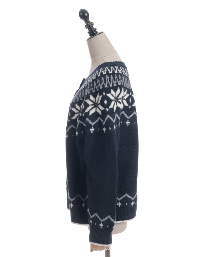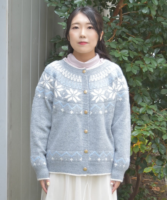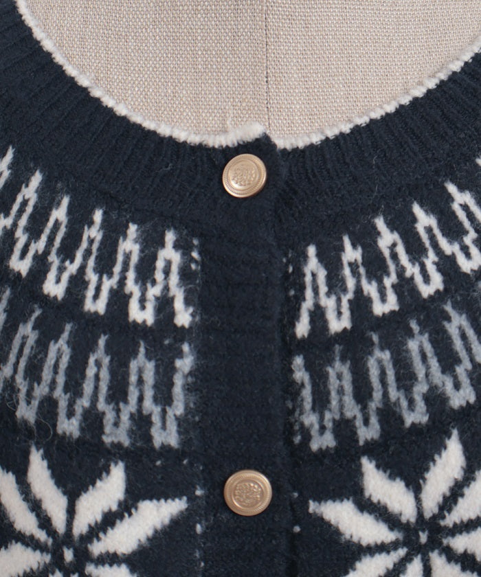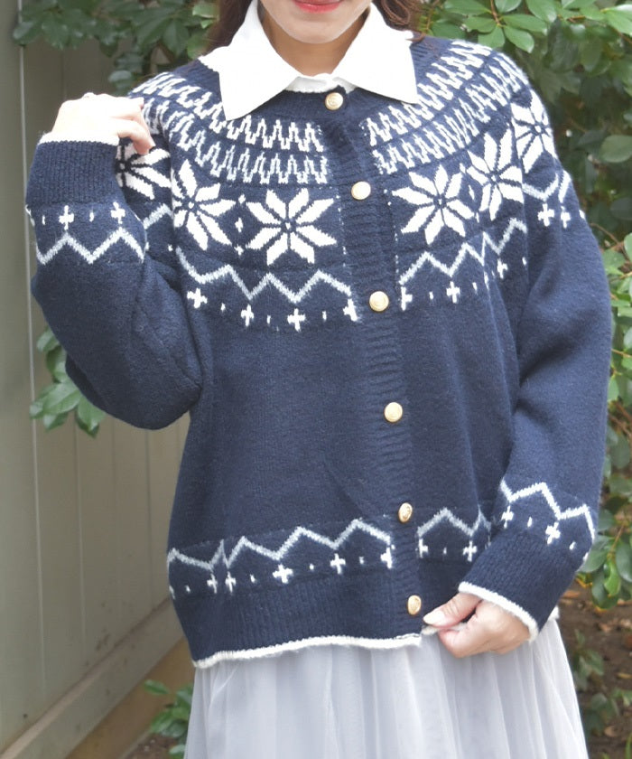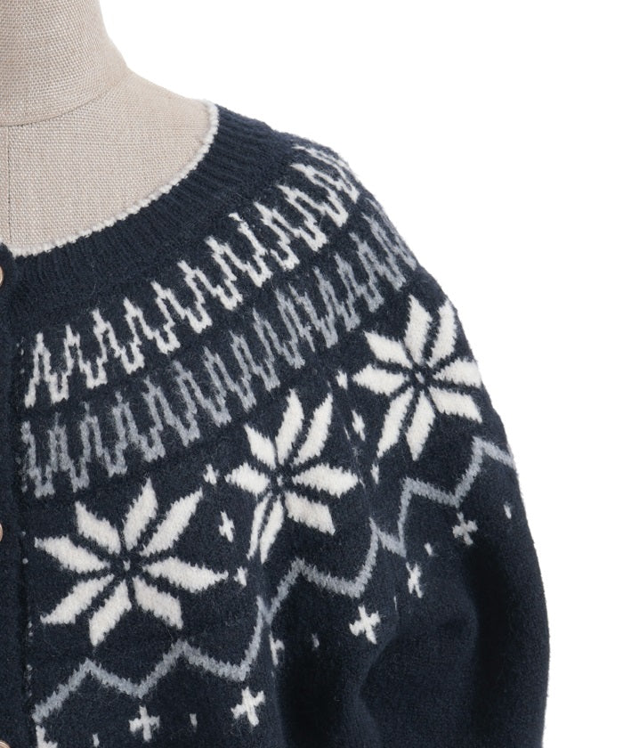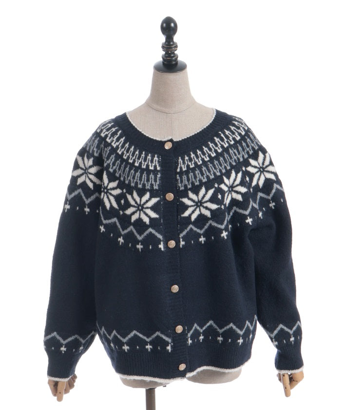 A jacquard cardigan featuring an eye-catching Nordic-inspired pattern.