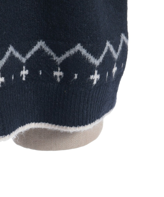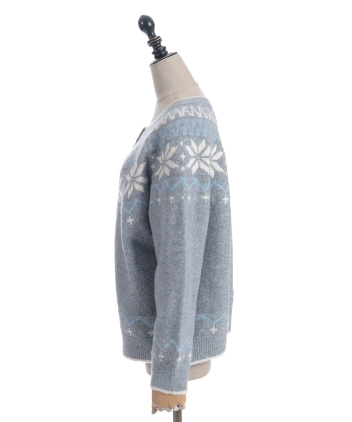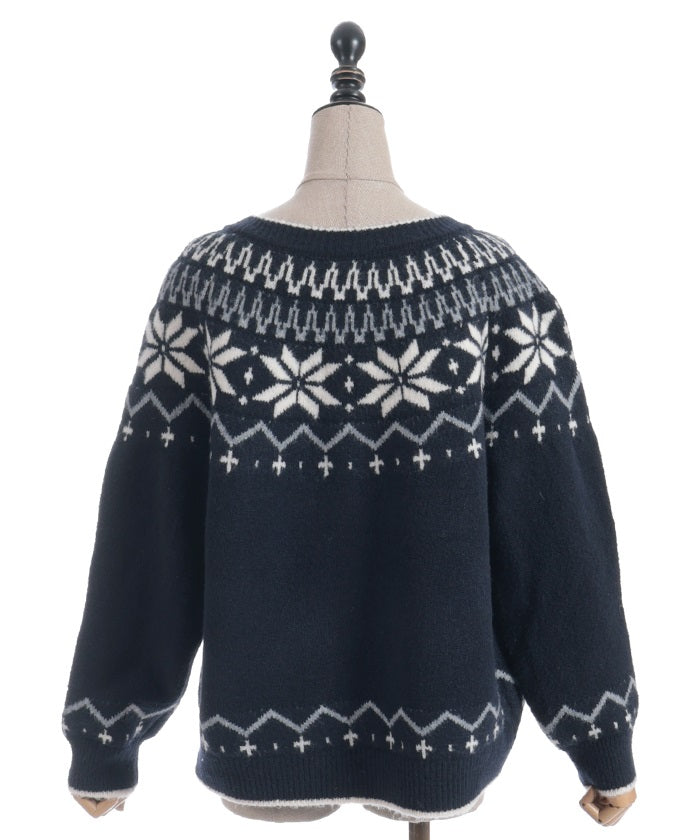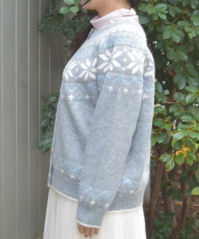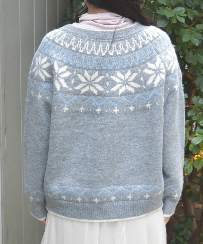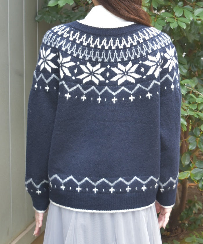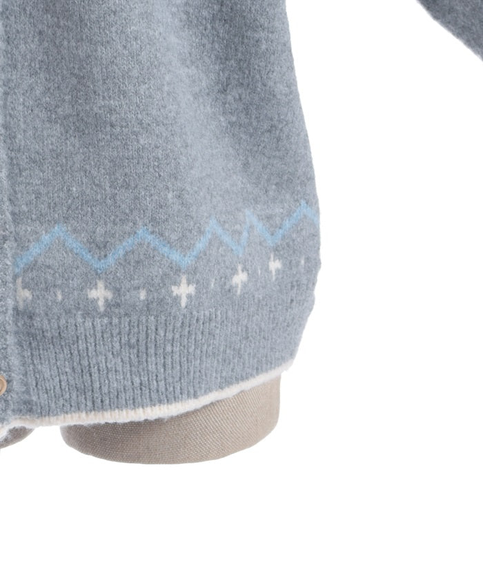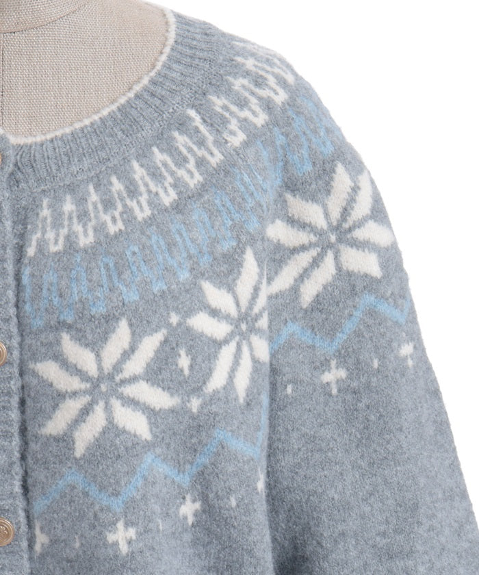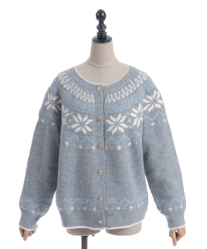 A jacquard cardigan featuring an eye-catching Nordic-inspired pattern.