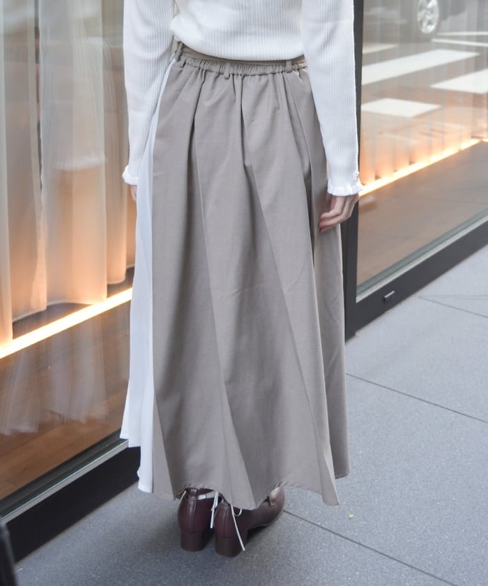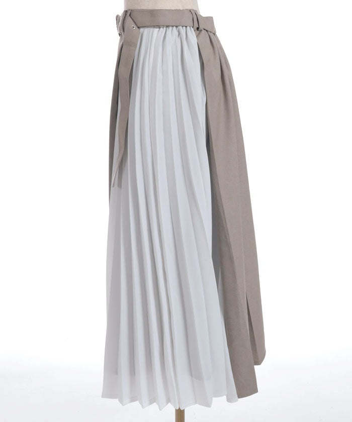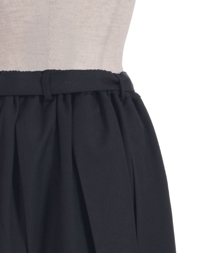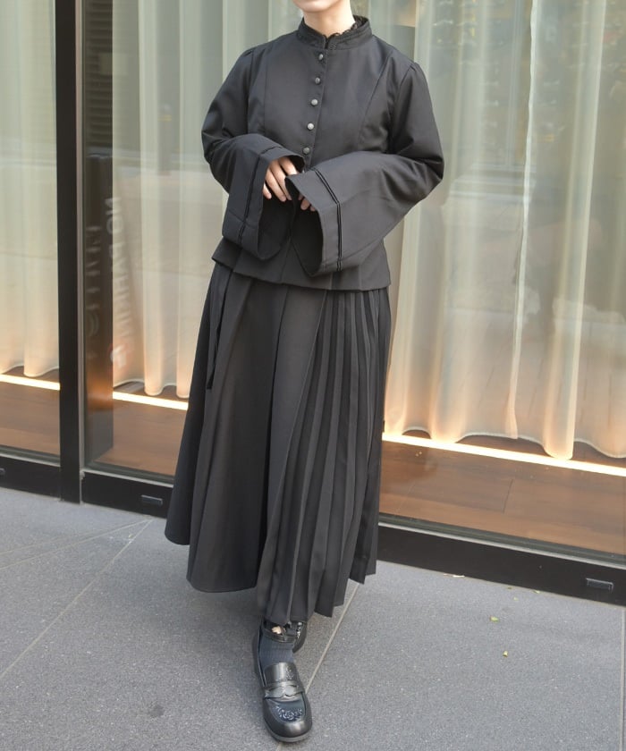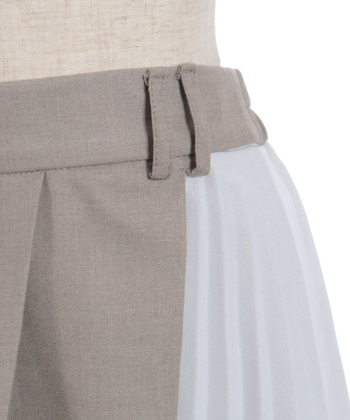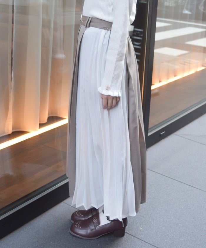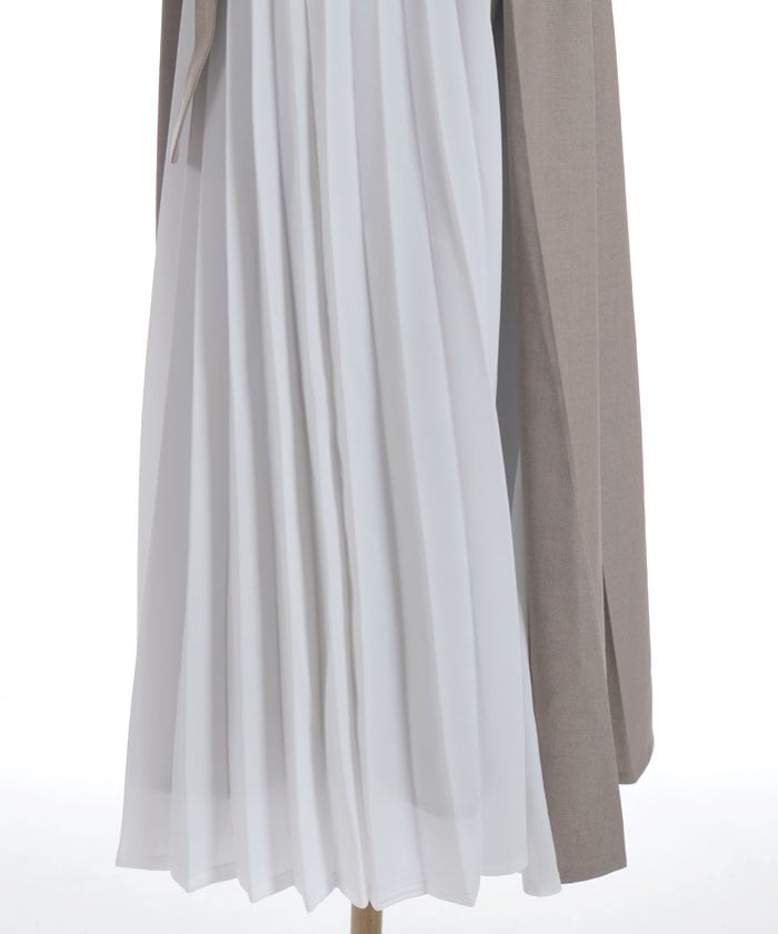 The tuck details create a sleek waistline, while the asymmetrical chiffon pleats create a sense of light movement. This piece has a subdued yet elegant look, and changes its appearance with every step.