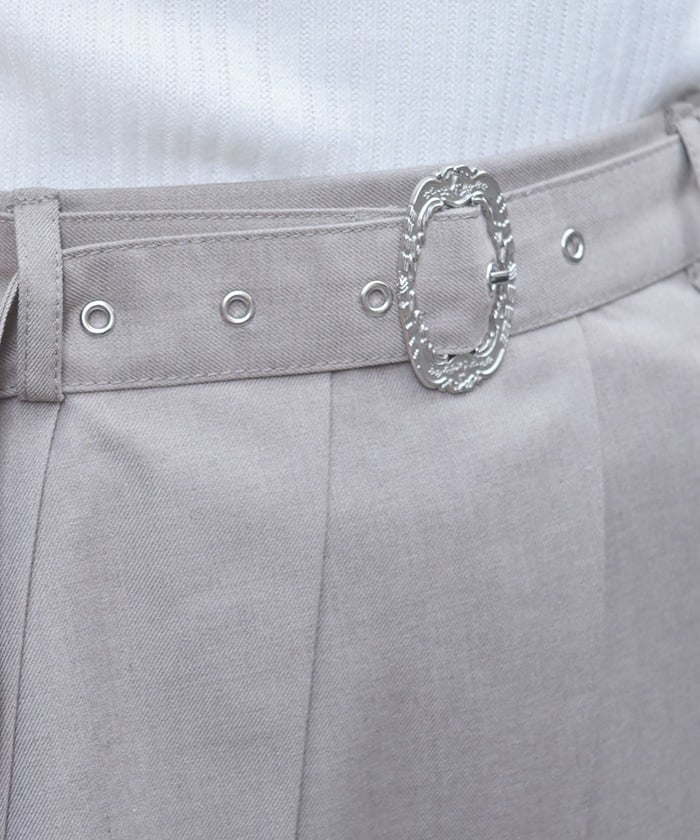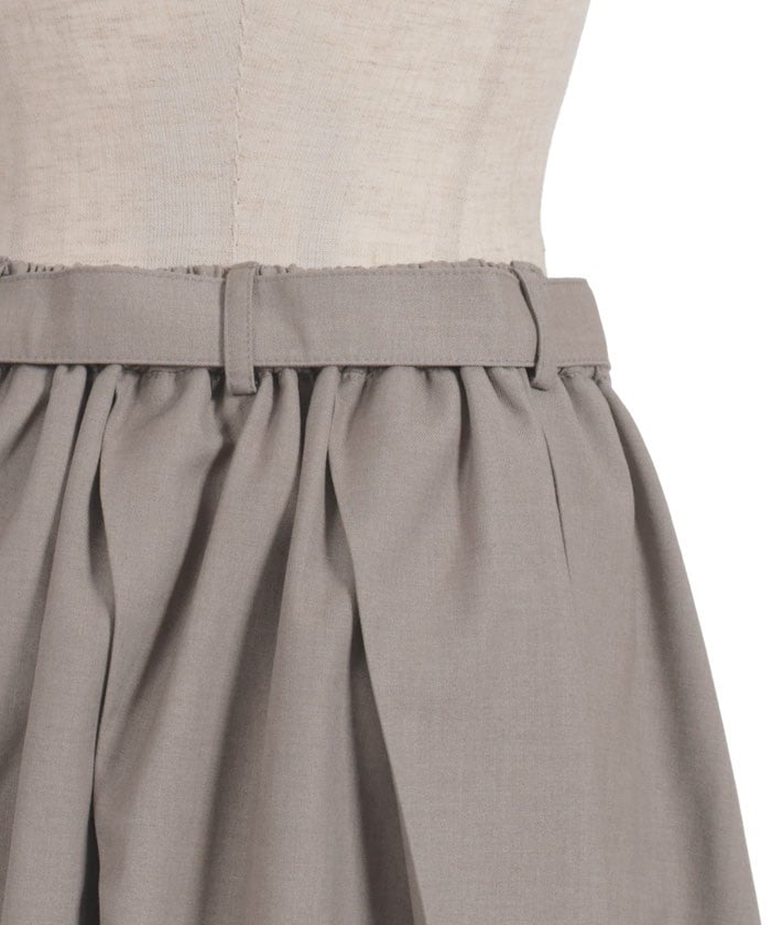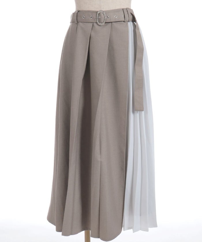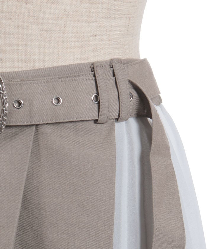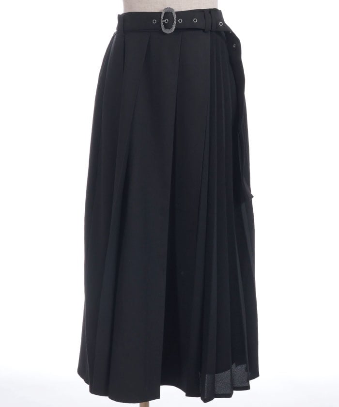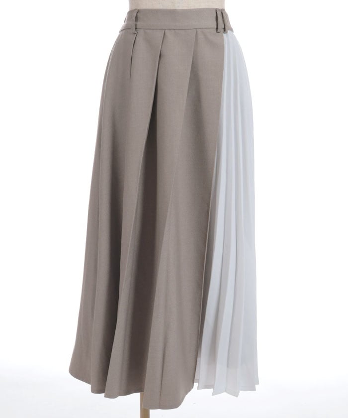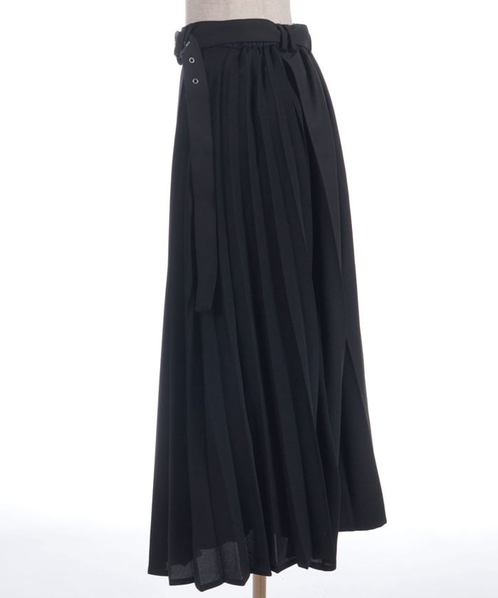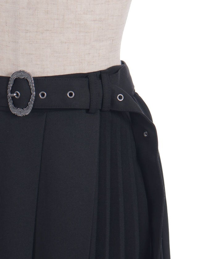 The tuck details create a sleek waistline, while the asymmetrical chiffon pleats create a sense of light movement. This piece has a subdued yet elegant look, and changes its appearance with every step.