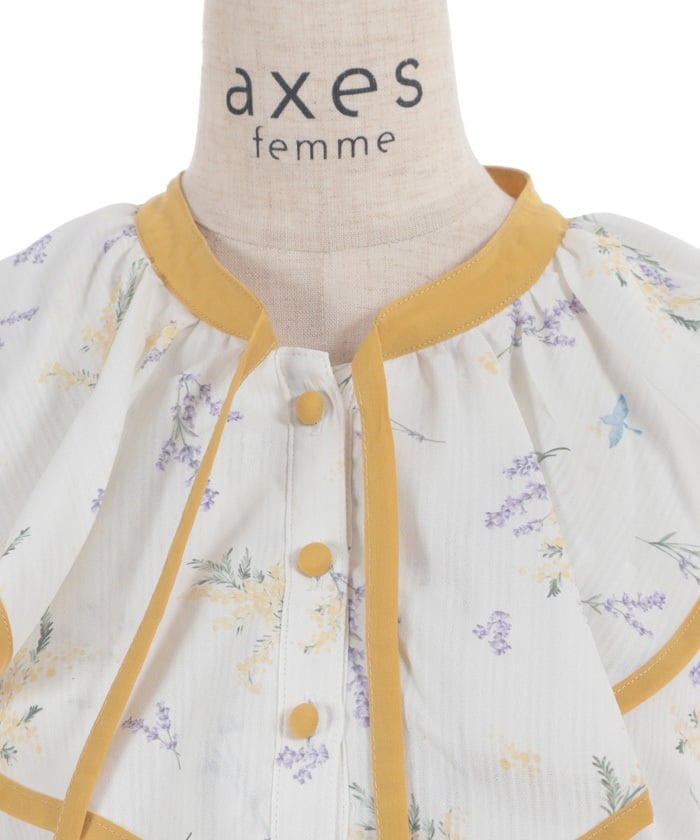 The ruffled collar features contrasting piping for a trendy two-tone design.