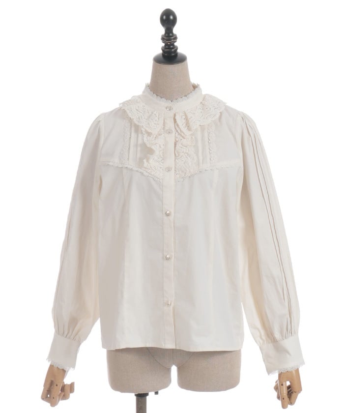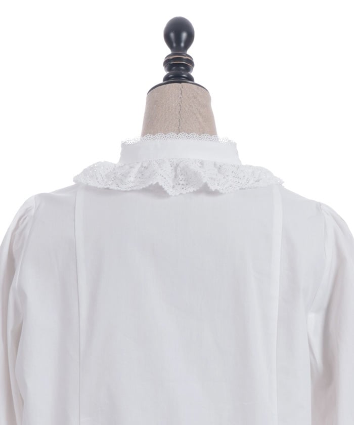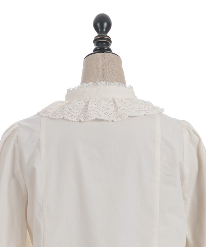 A classic design with a stand-up collar accented with torsion lace, pin tucks, and matte satin ribbon.
