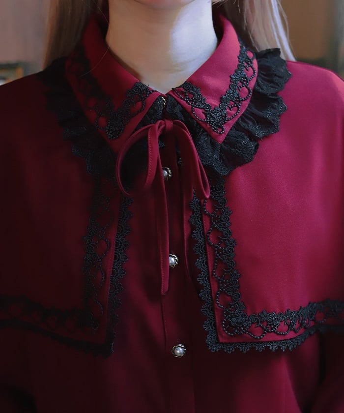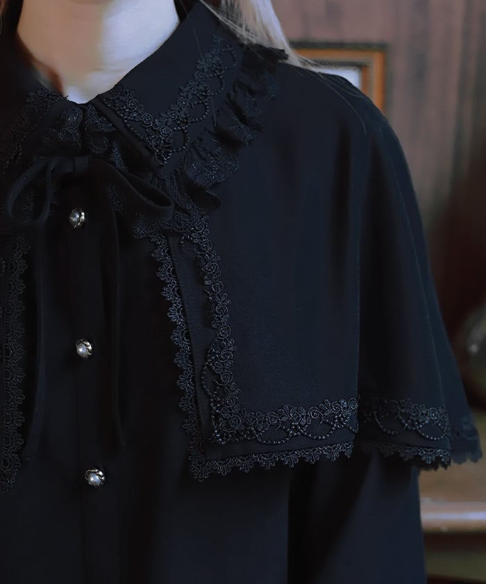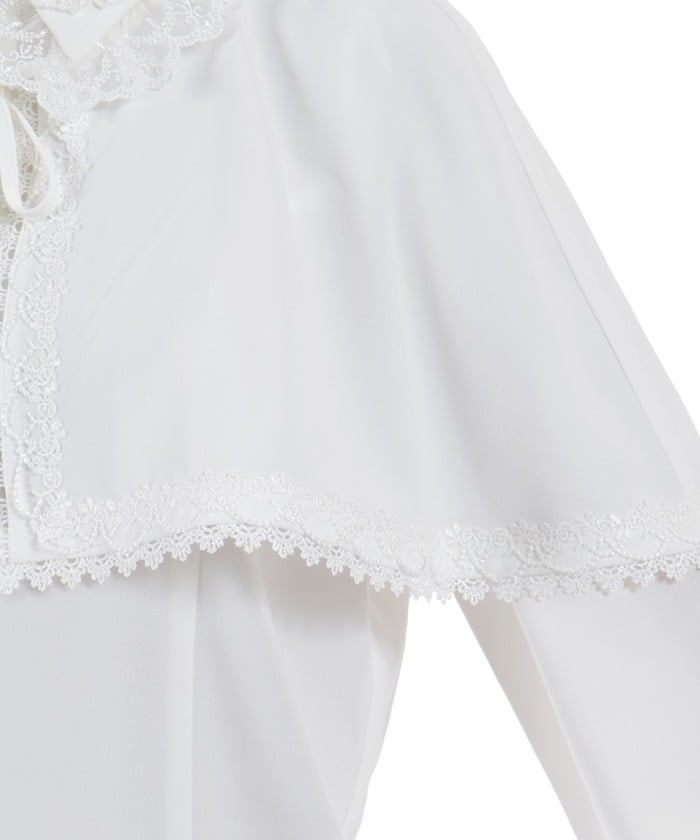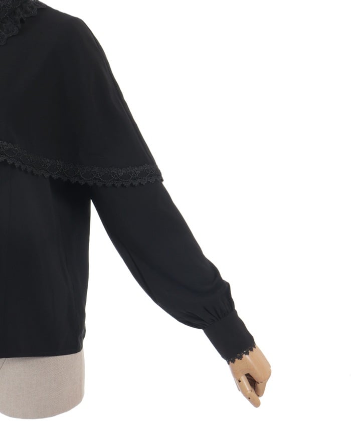 This blouse exudes elegance with its soft georgette fabric. The design features delicate tulle and synthetic lace. The cape is removable, so it can be worn on its own.