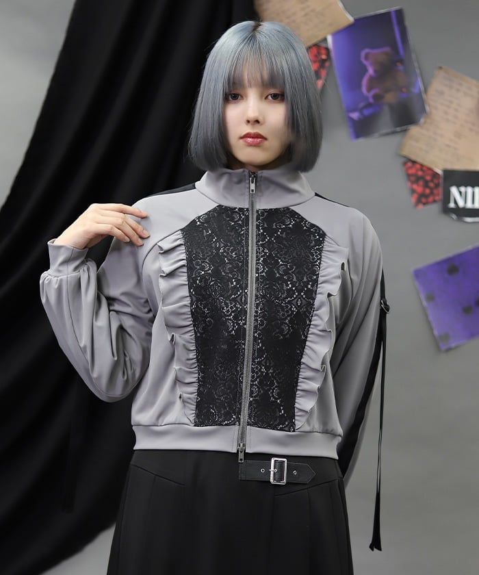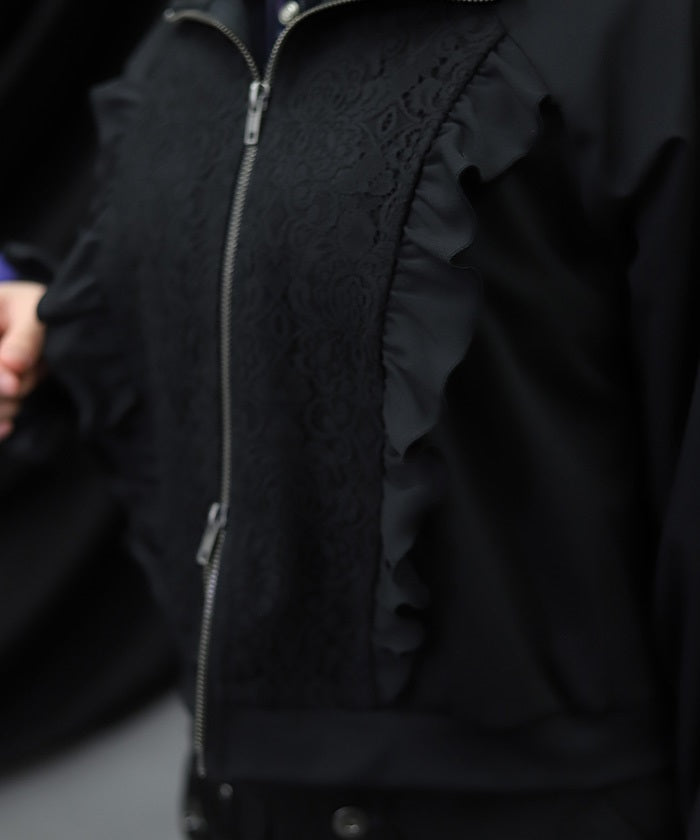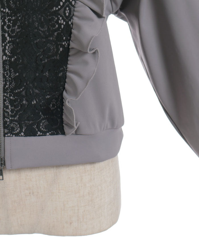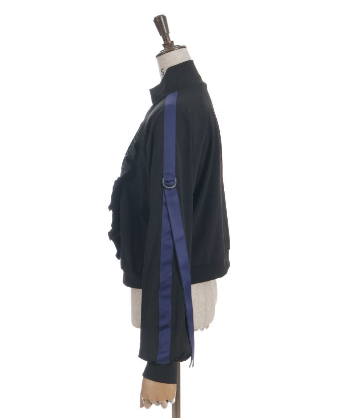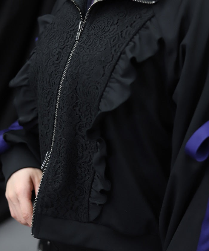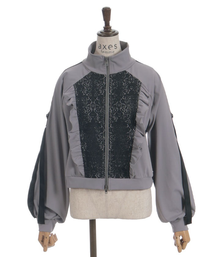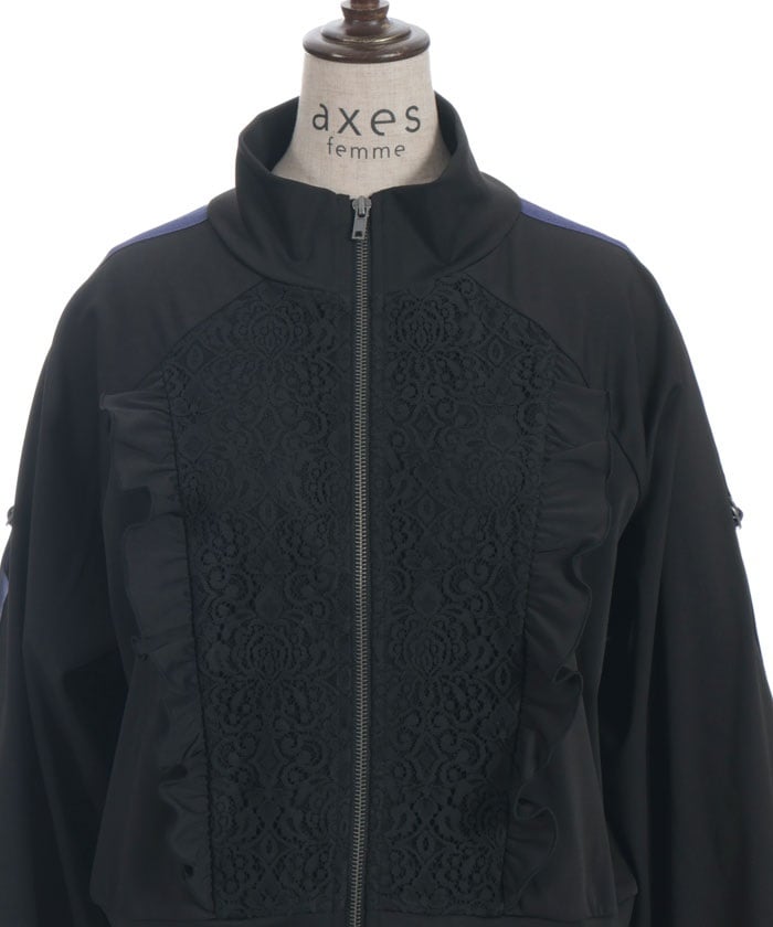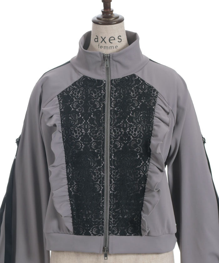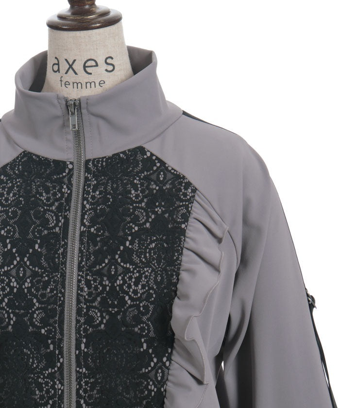 This track jacket features a sophisticated design with lace and contrasting tape.