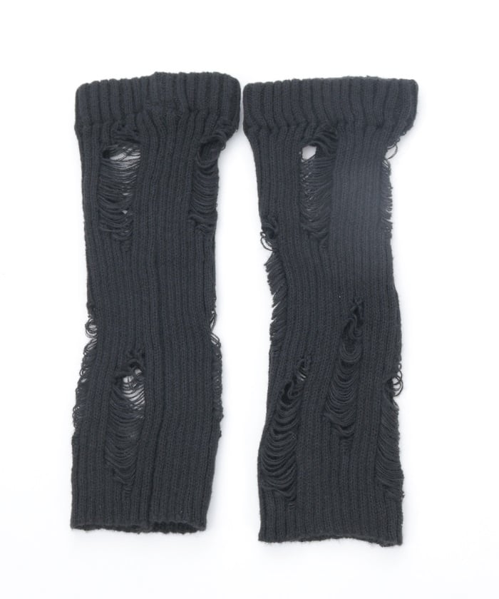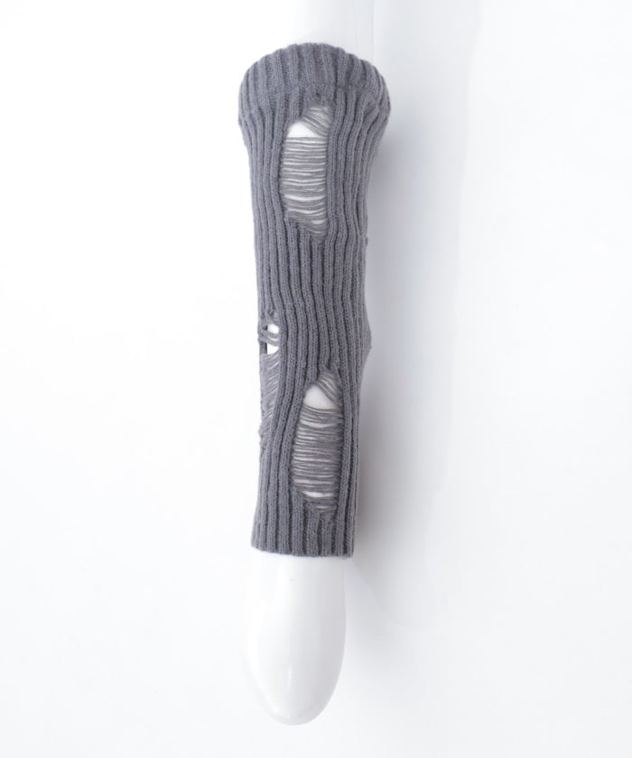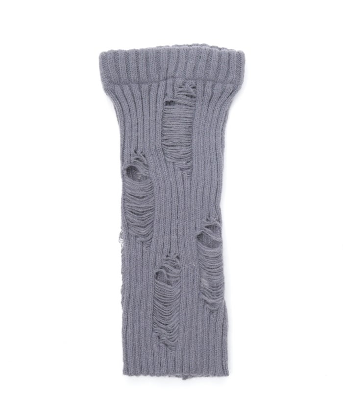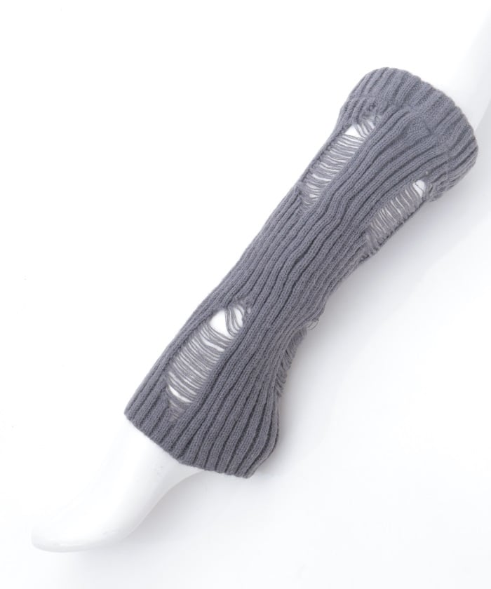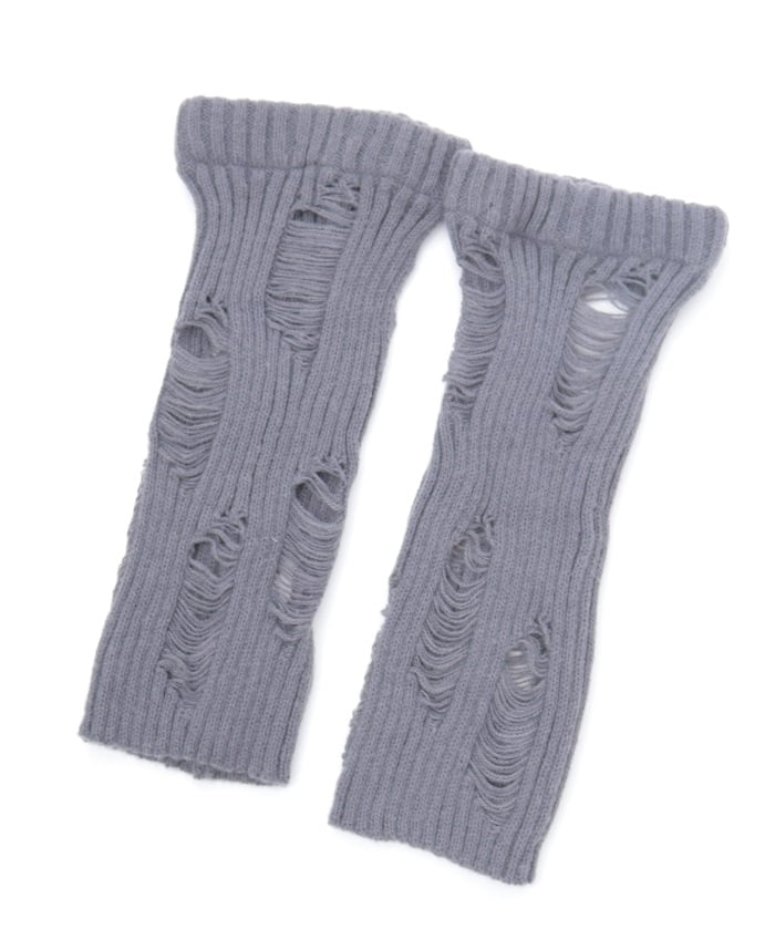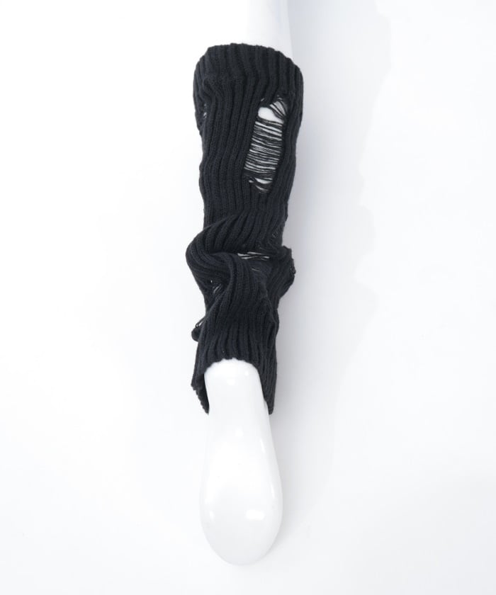A pair of leg covers made of boldly distressed knit fabric.
