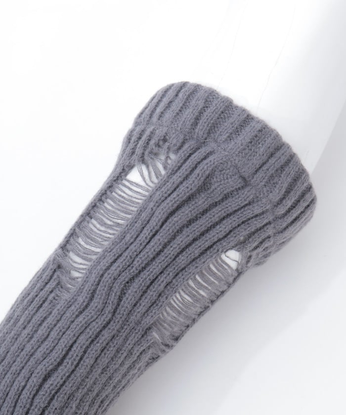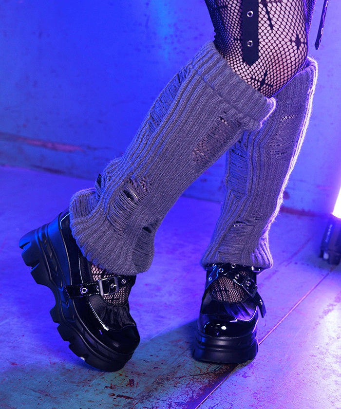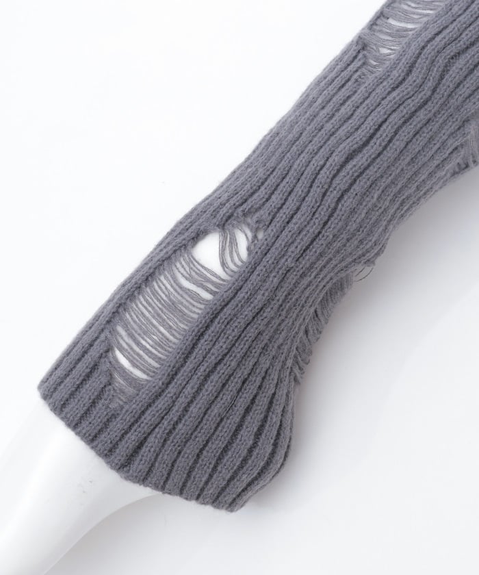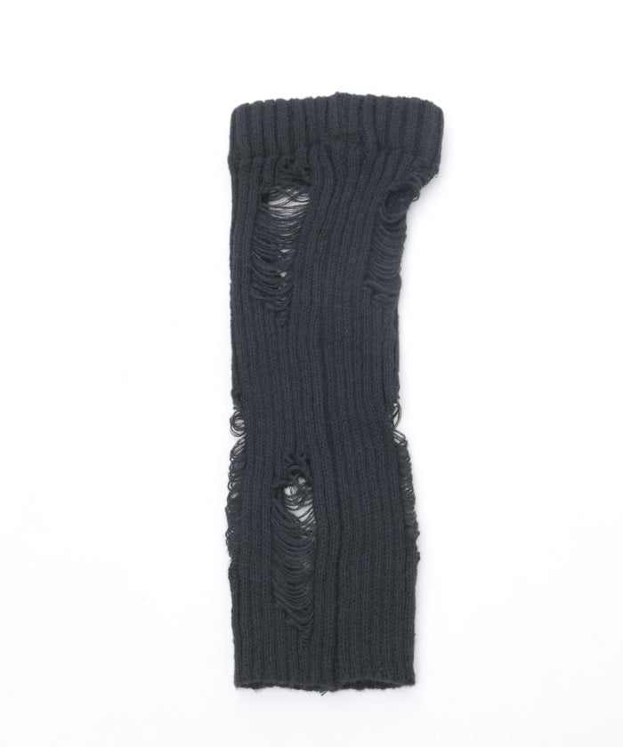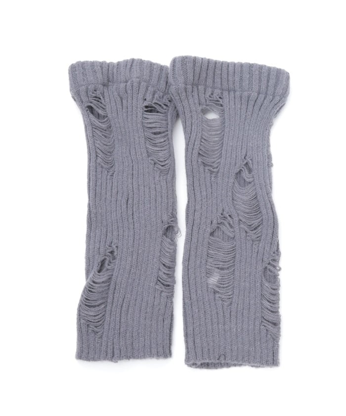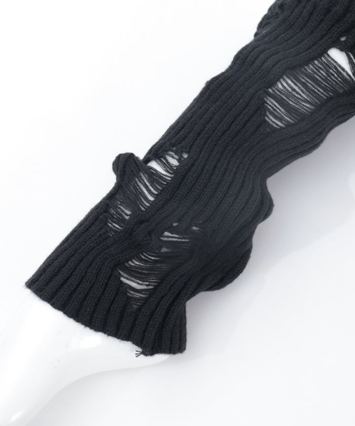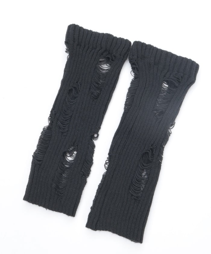 A pair of leg covers made of boldly distressed knit fabric.