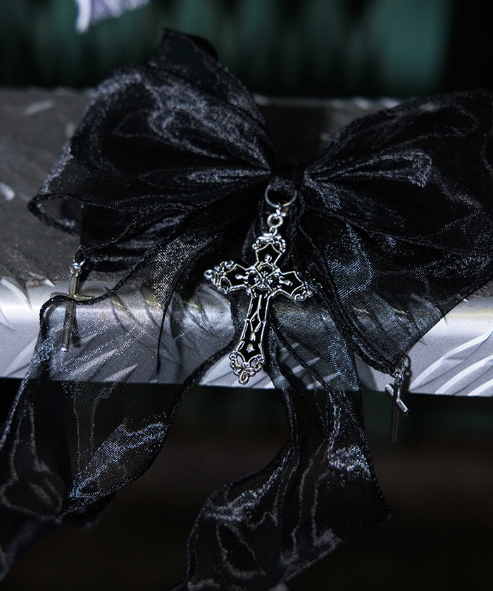 A clip-on hair accessory featuring a large organdy ribbon with a cross charm.