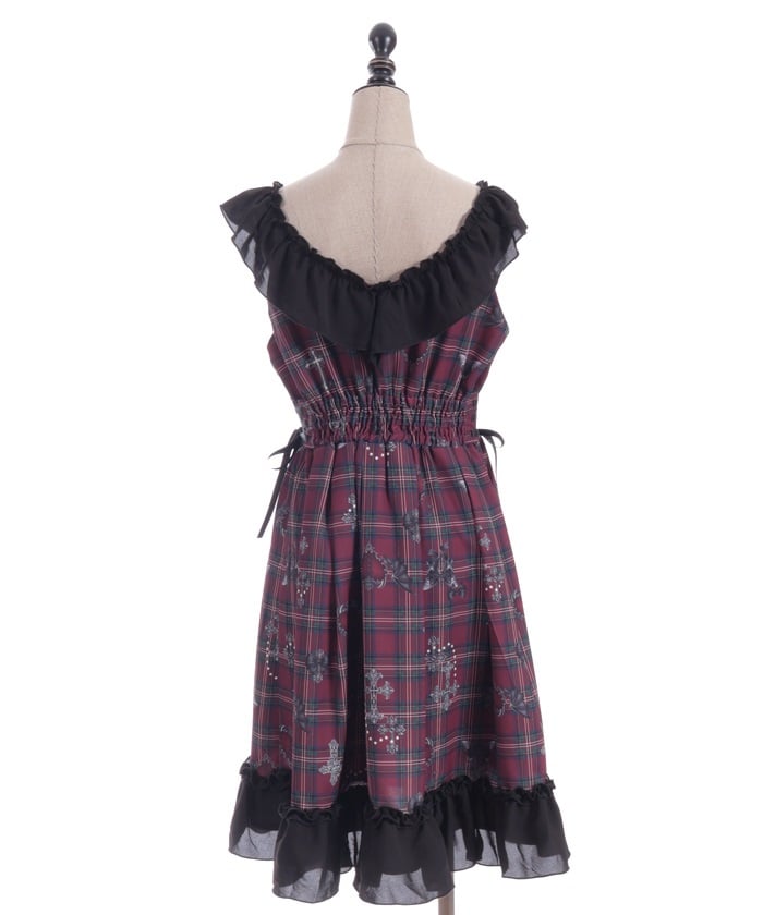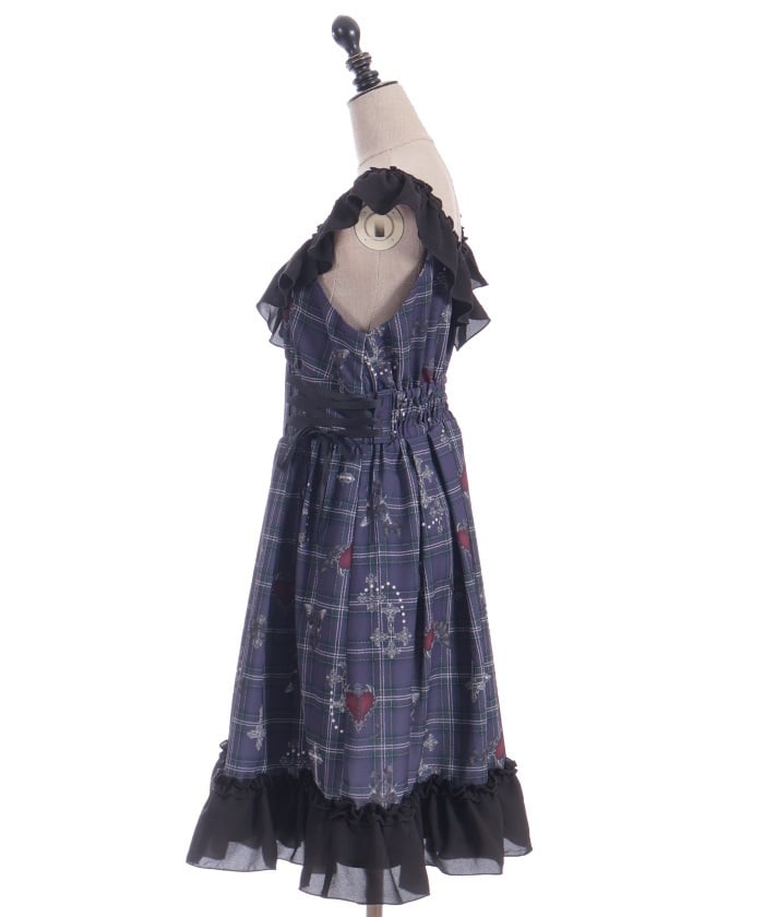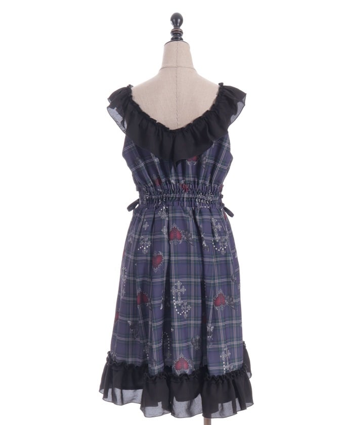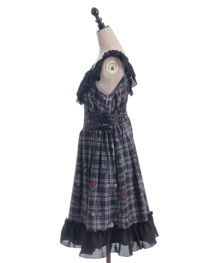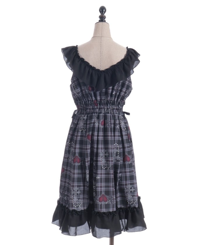 This dress features an original print of dark motifs like devil hearts on a checkered pattern.