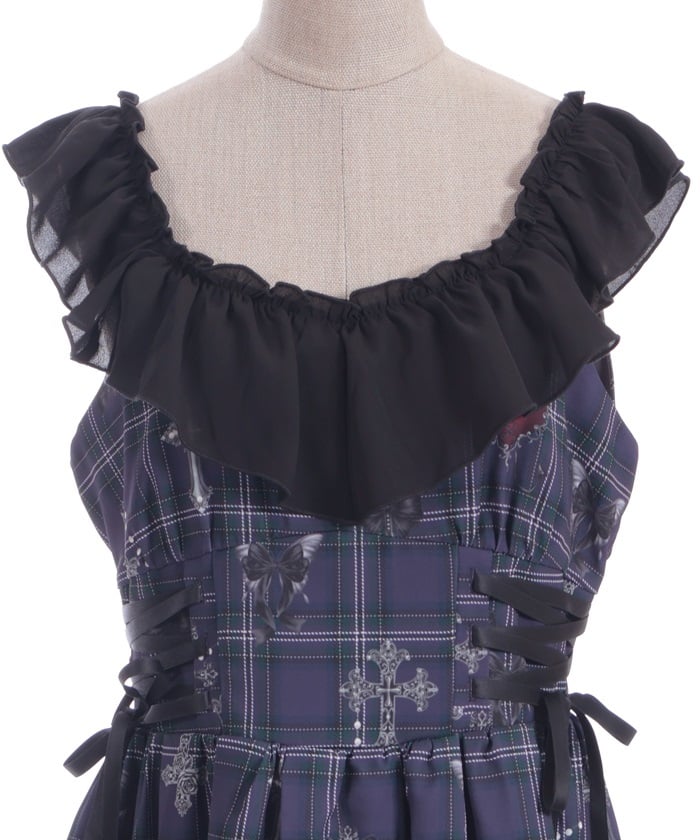 With frills and lace-ups on the collar, this item presents a bold edge within its sweetness.