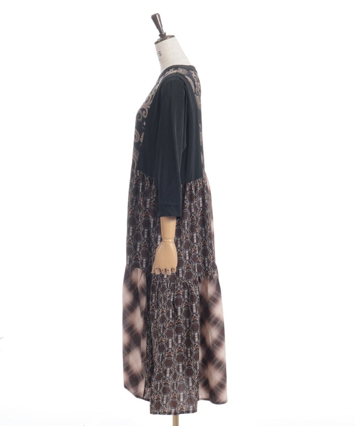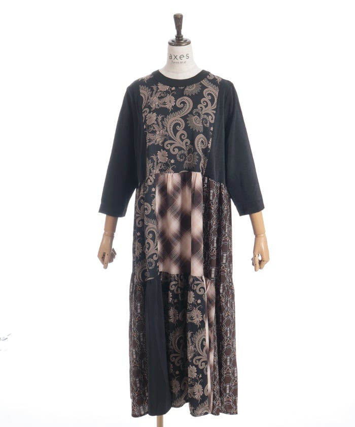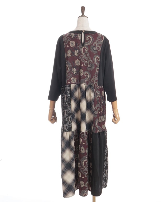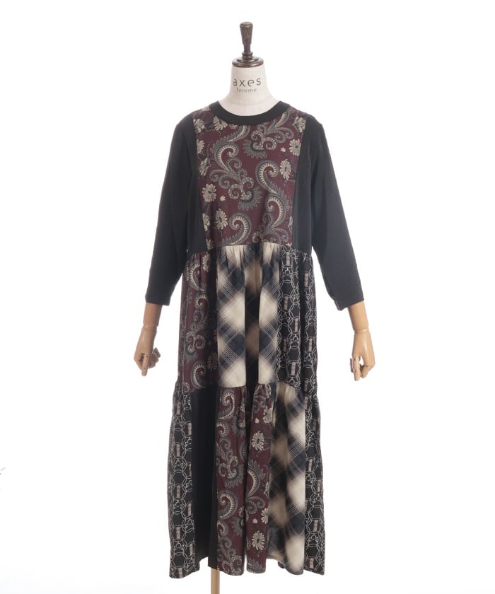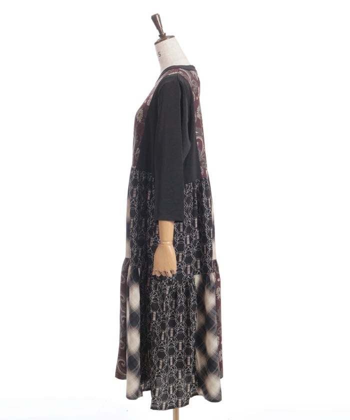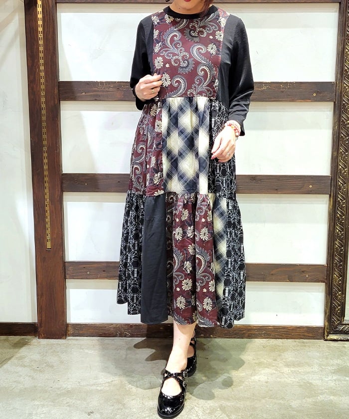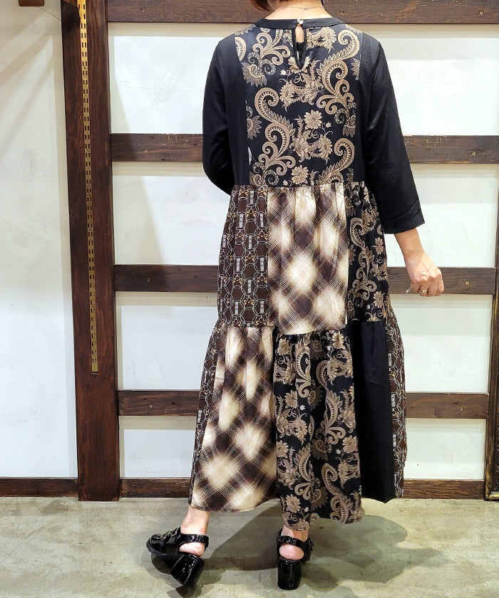 This expressive patchwork tiered dress combines different materials.