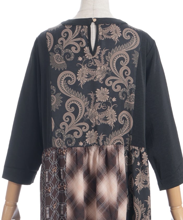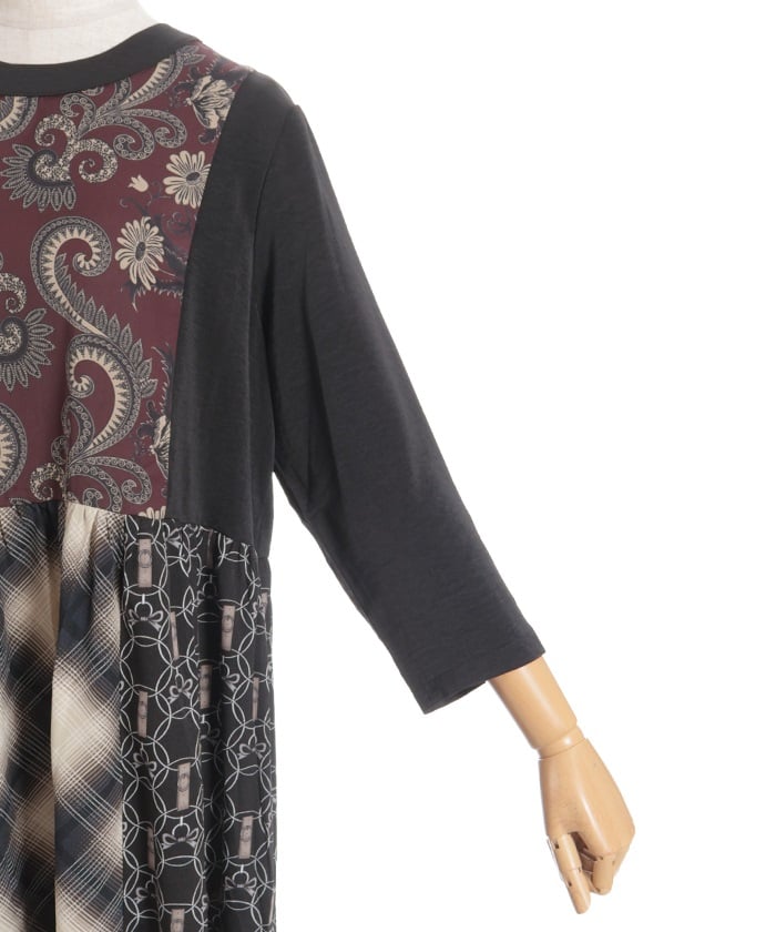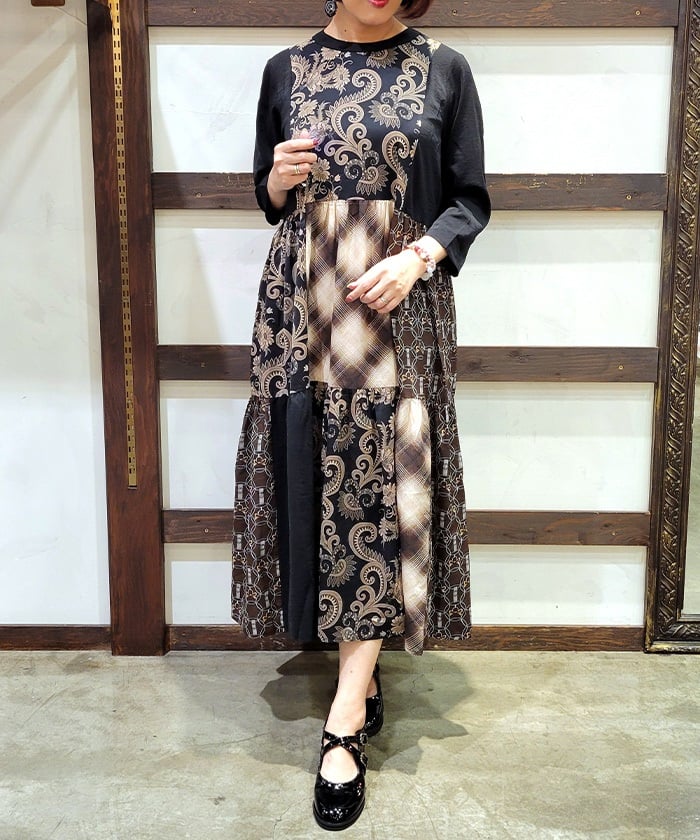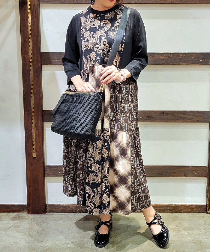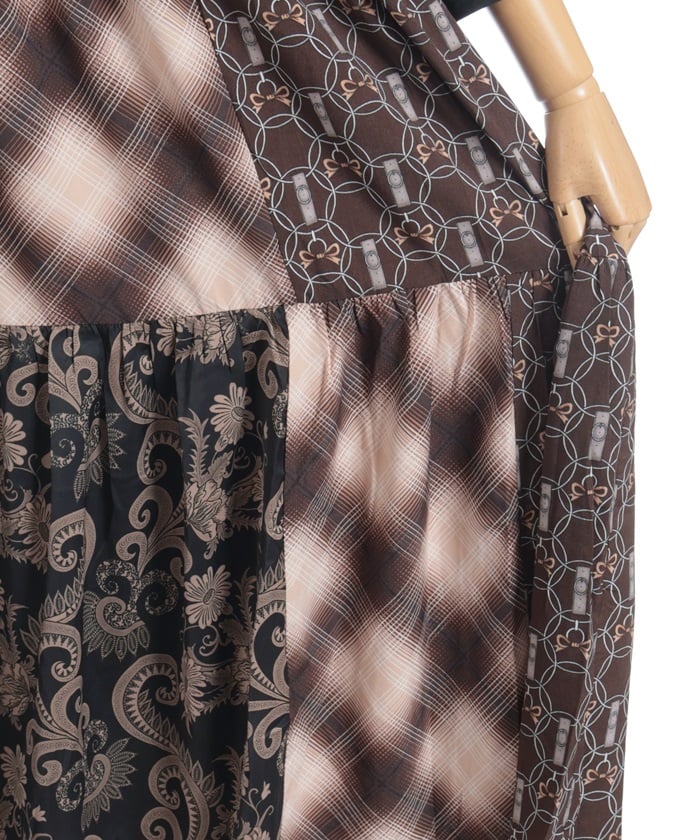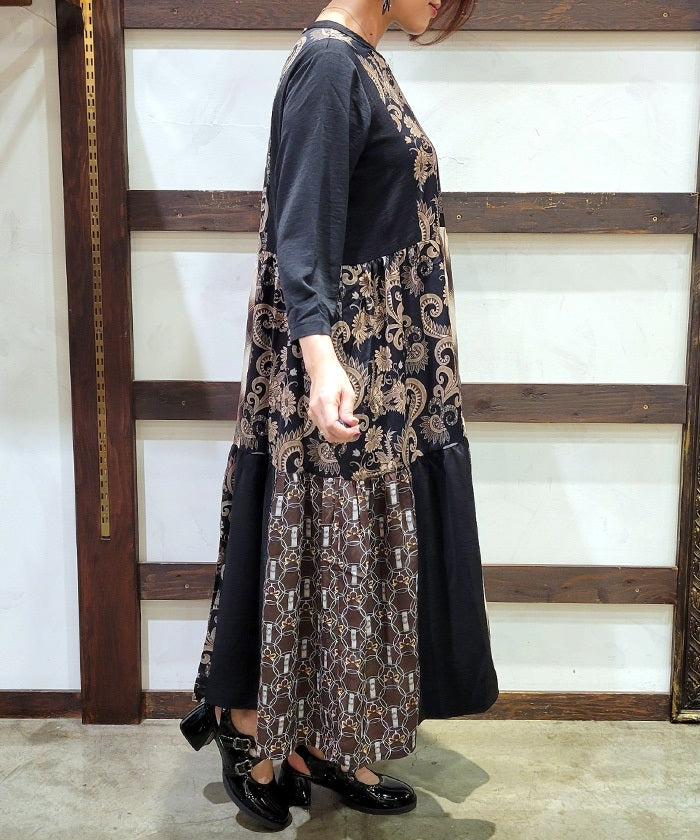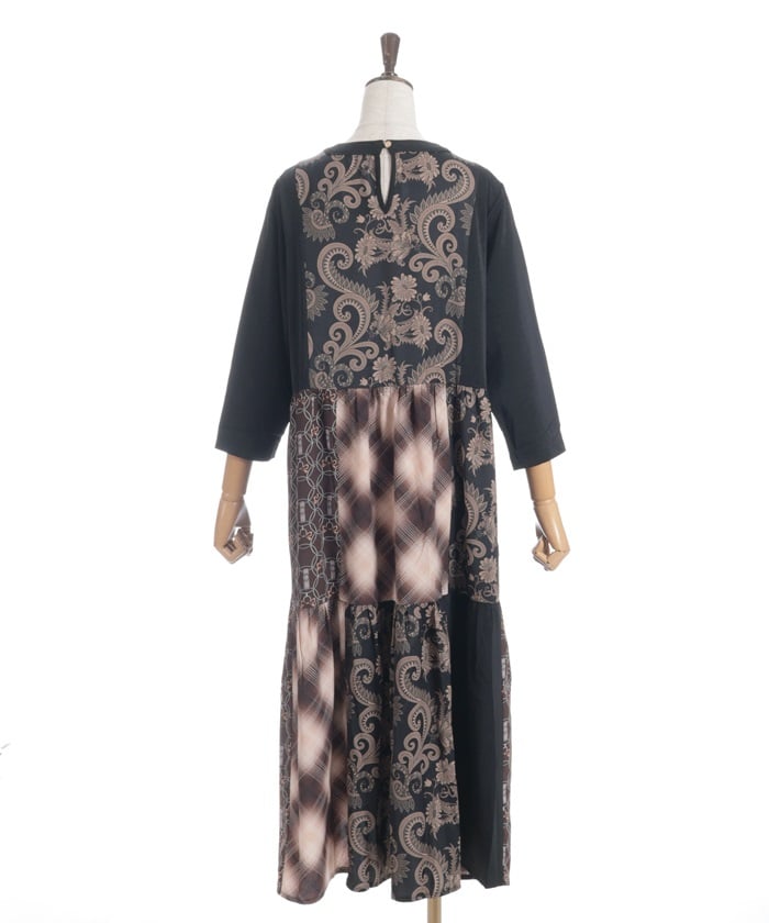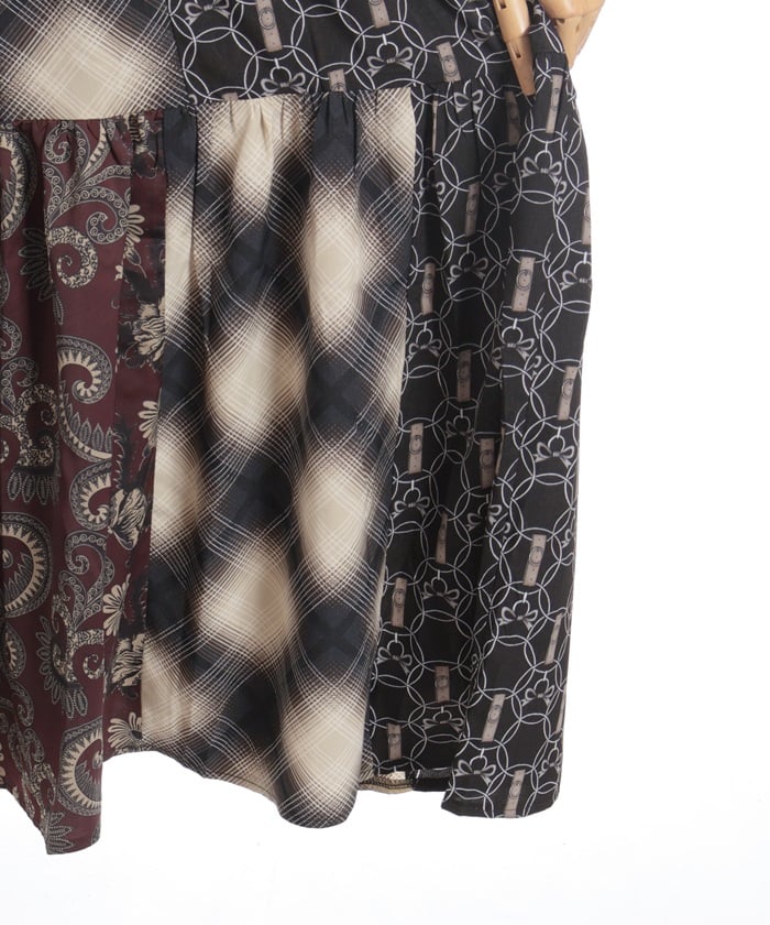This expressive patchwork tiered dress combines different materials.