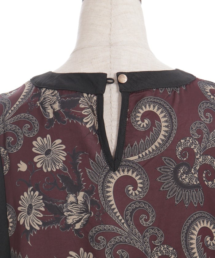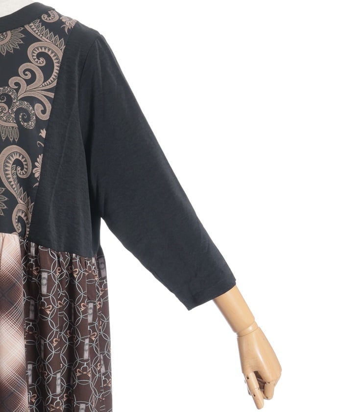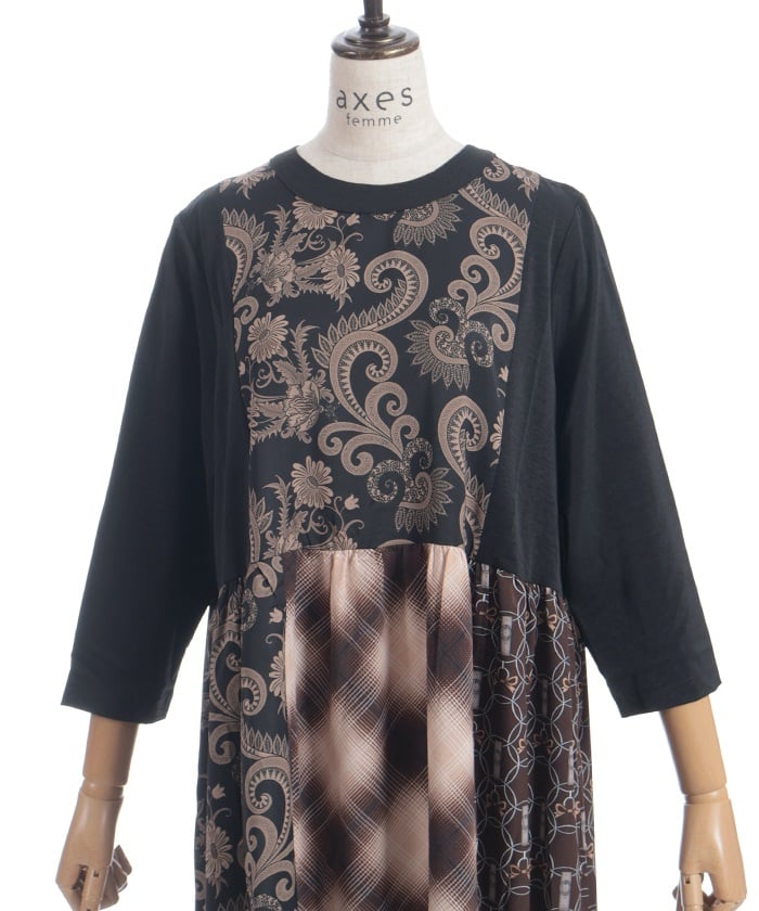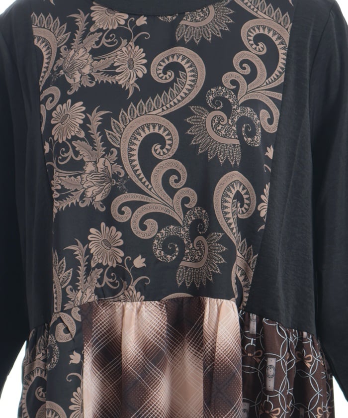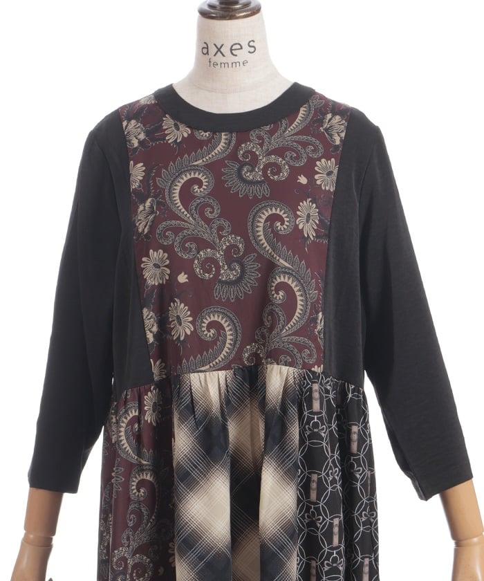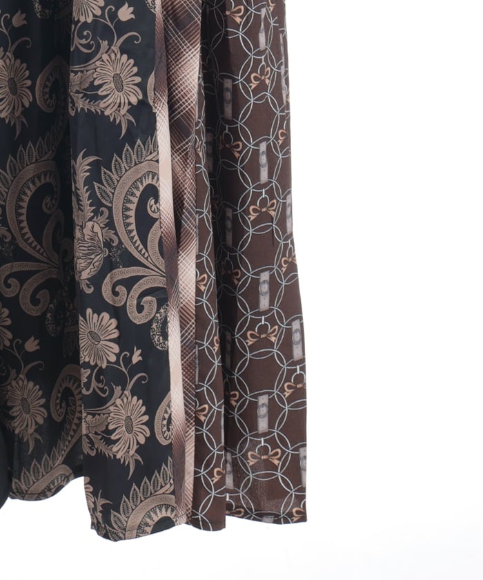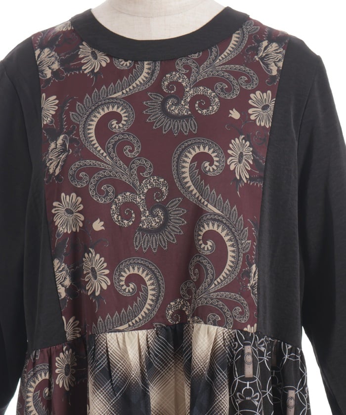 This patchwork design boldly combines different materials, including checks, florals, and jacquard.