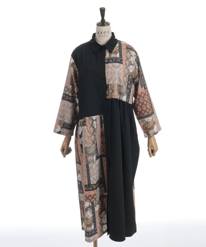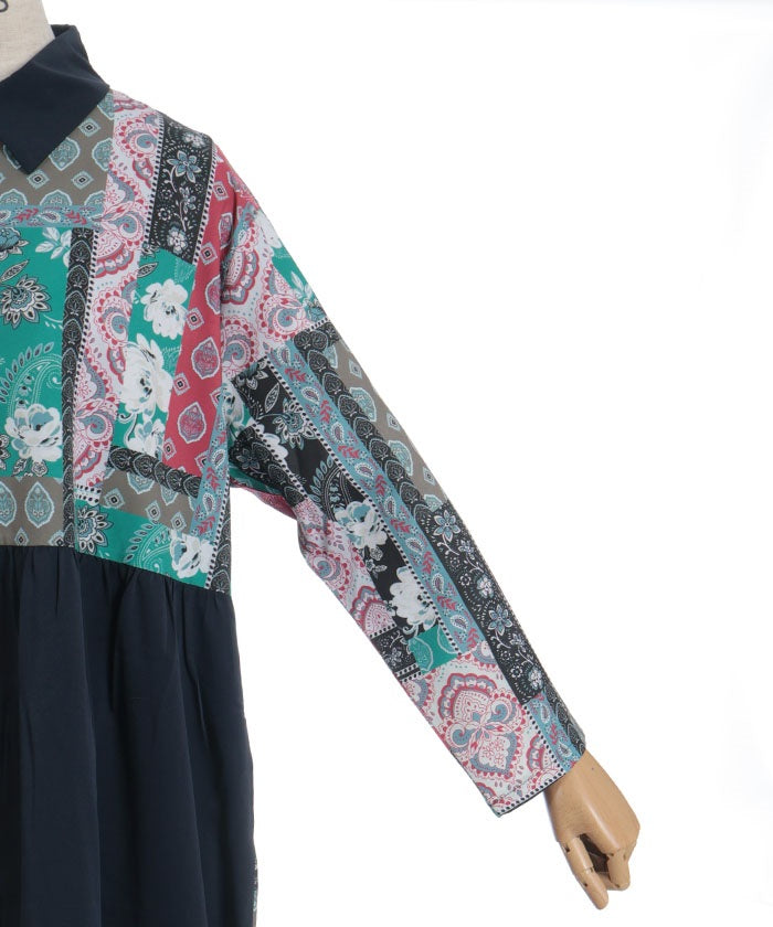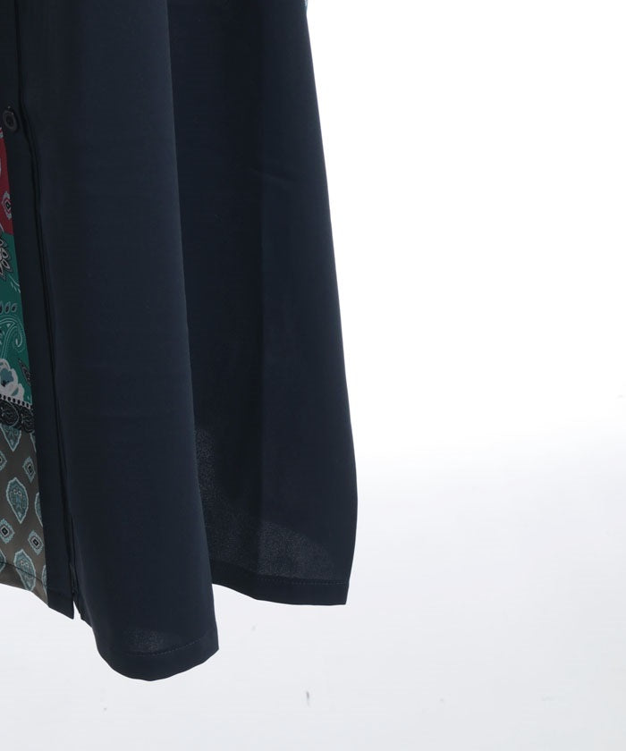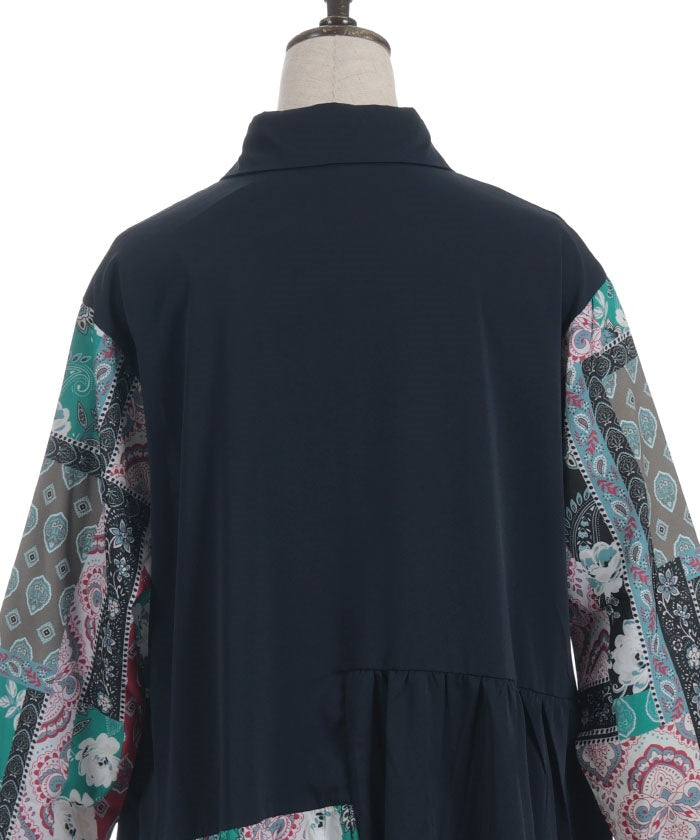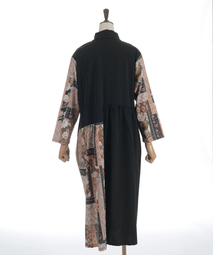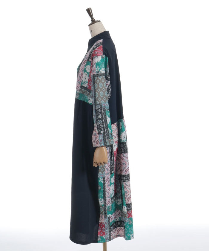The bold contrast between solid and all-over pattern creates a striking design. The vertical blocking creates a clean silhouette. The pattern accents the sleeves and skirt, creating a sophisticated, understated look.