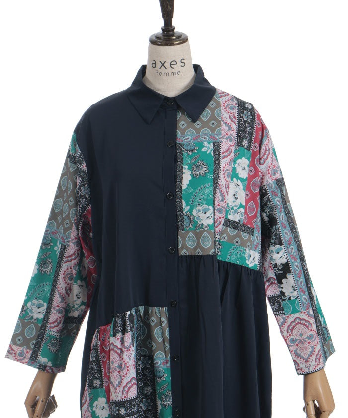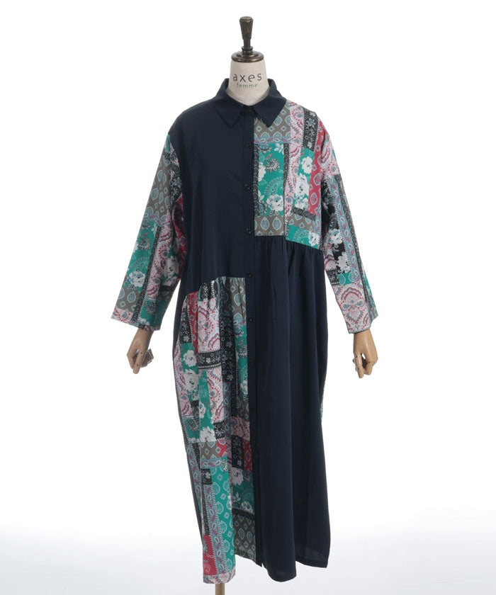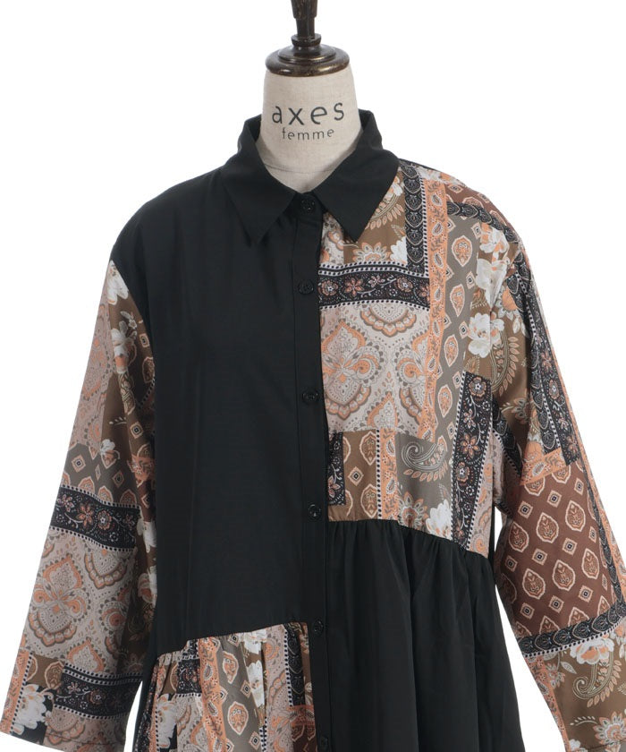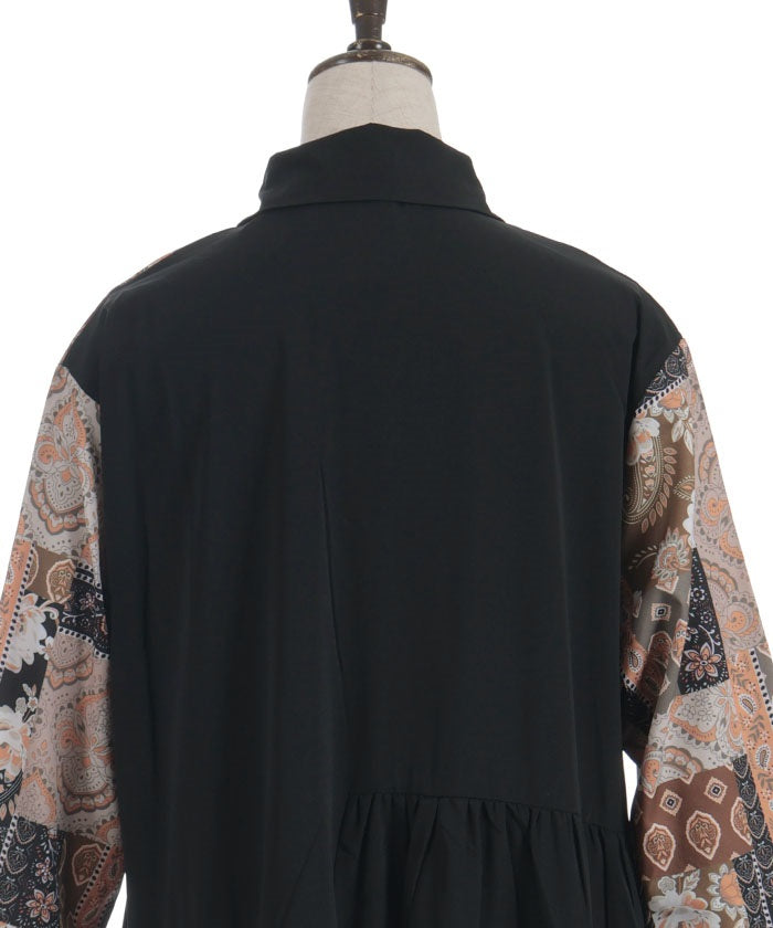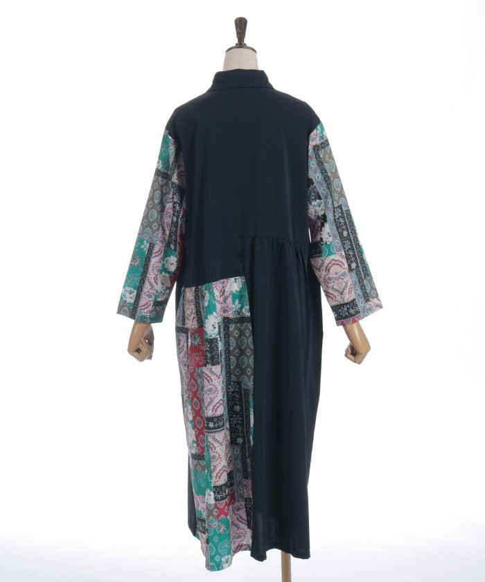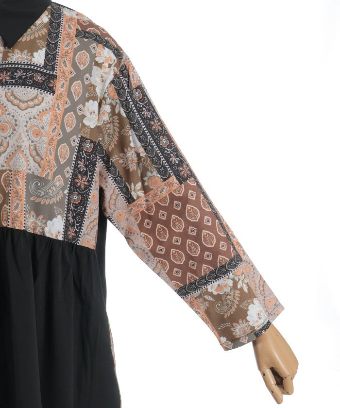 The bold contrast between solid and all-over pattern creates a striking design. The vertical blocking creates a clean silhouette. The pattern accents the sleeves and skirt, creating a sophisticated, understated look.
