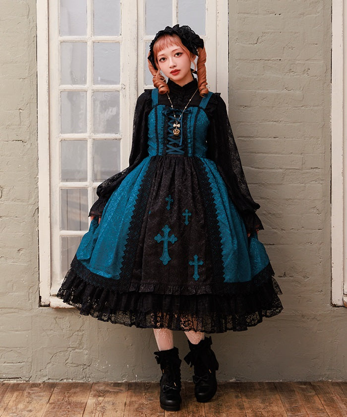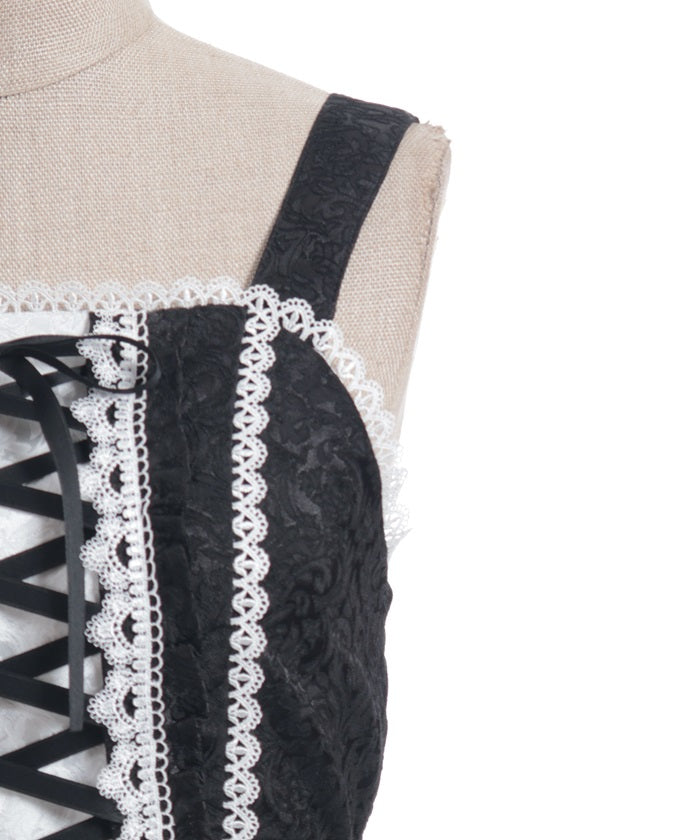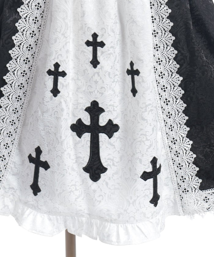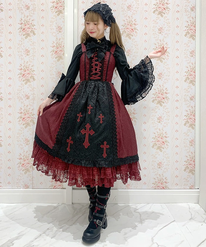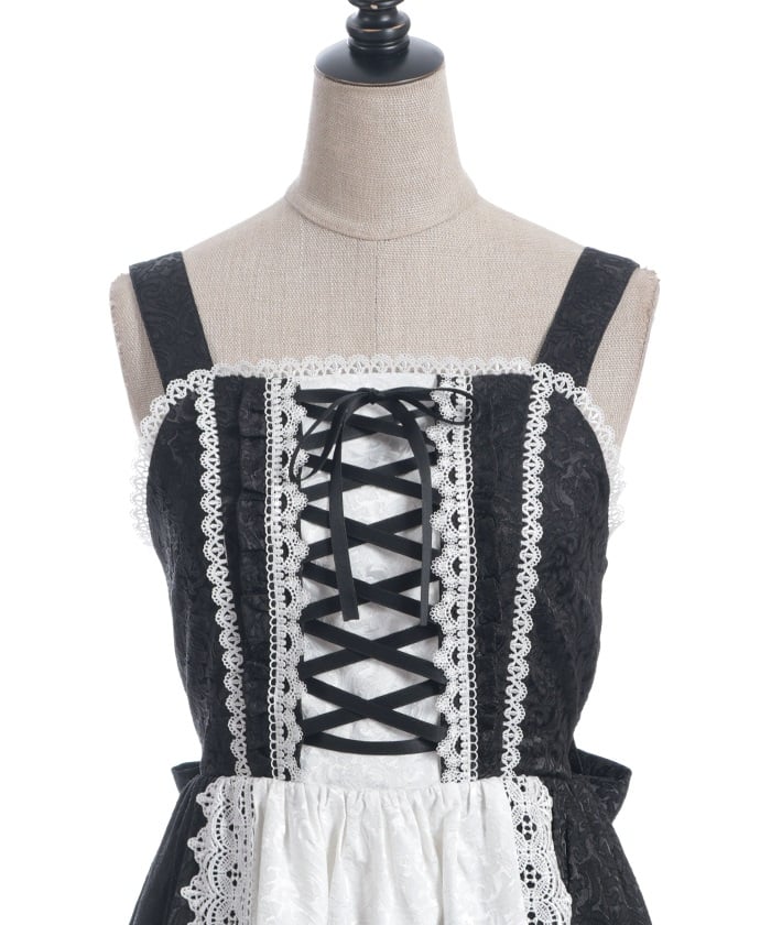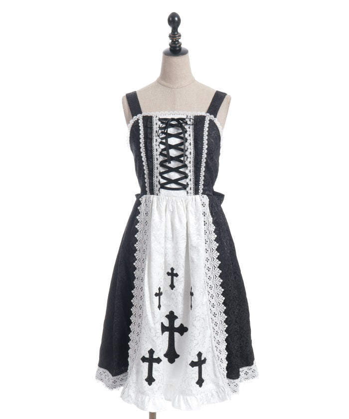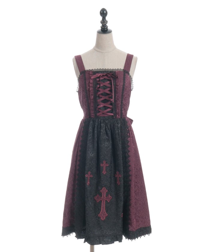 The upper bodice features a lace-up design, while the skirt features a large cross motif. The jumper skirt as a whole is made with a generous amount of elegant, lustrous jacquard fabric.