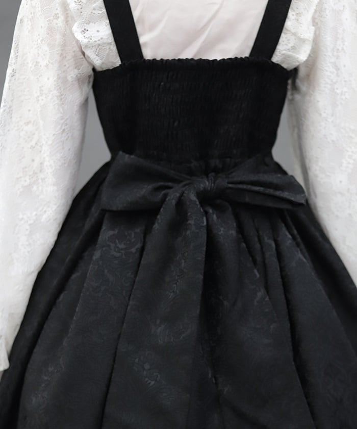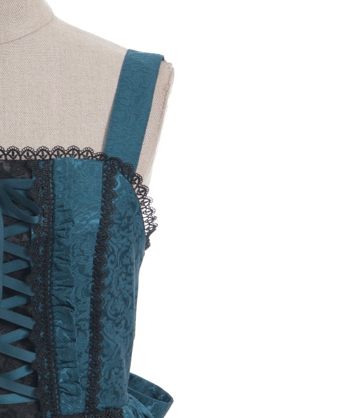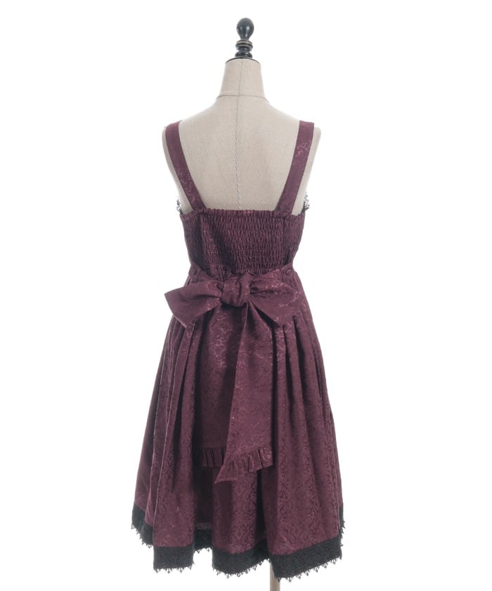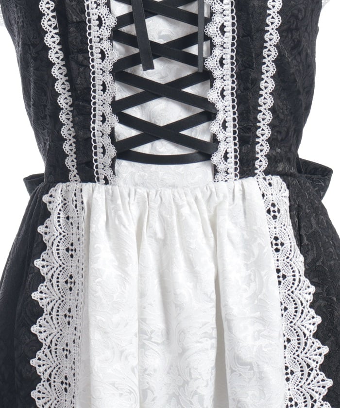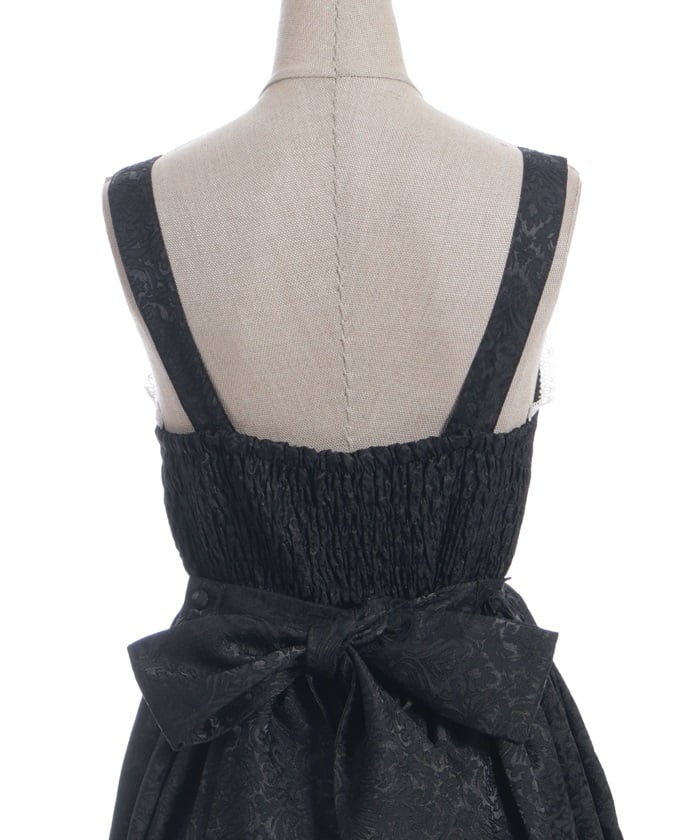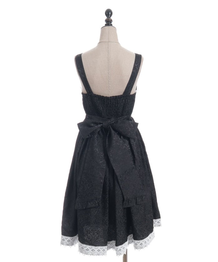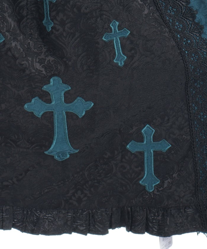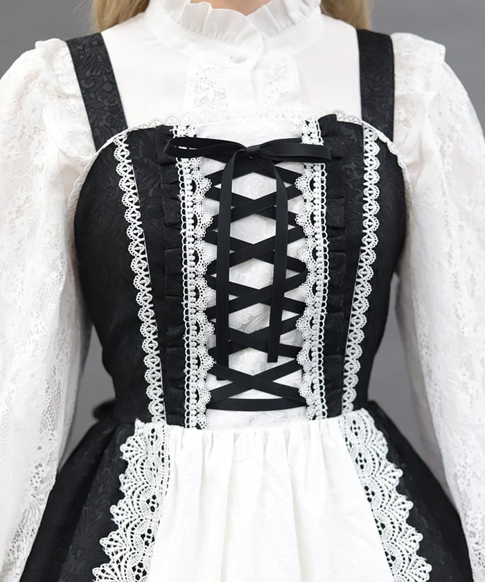 The upper bodice features a lace-up design, while the skirt features a large cross motif. The jumper skirt as a whole is made with a generous amount of elegant, lustrous jacquard fabric.