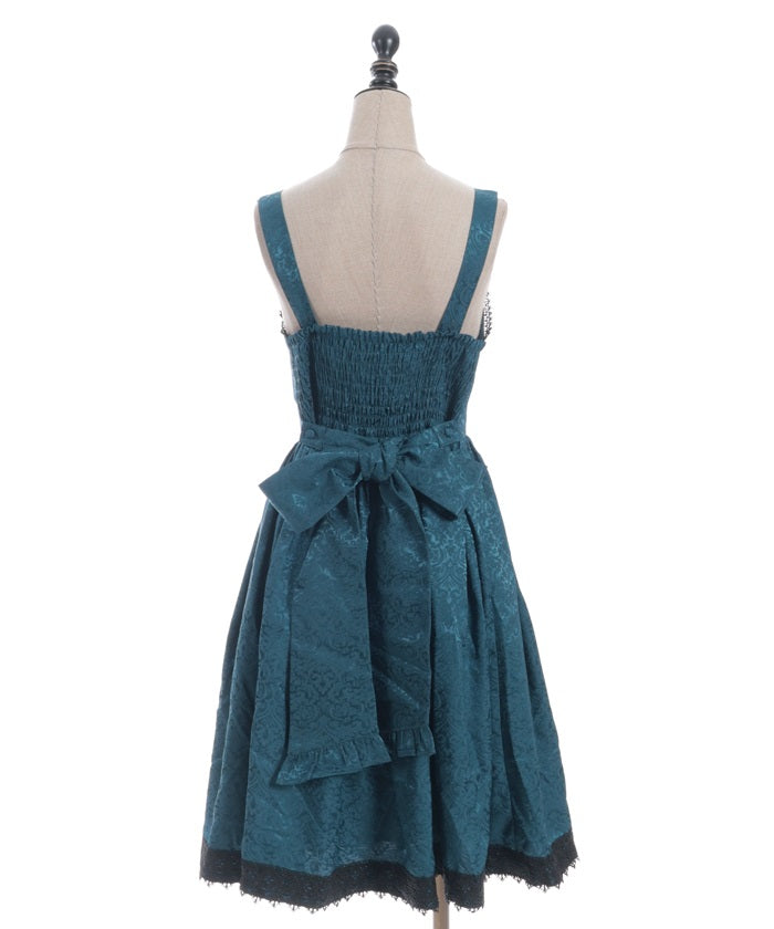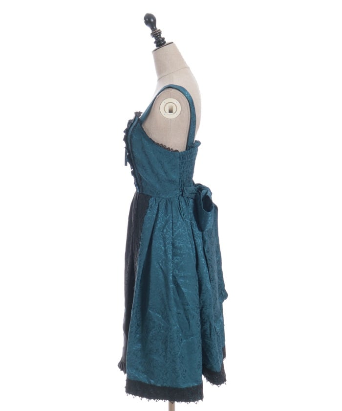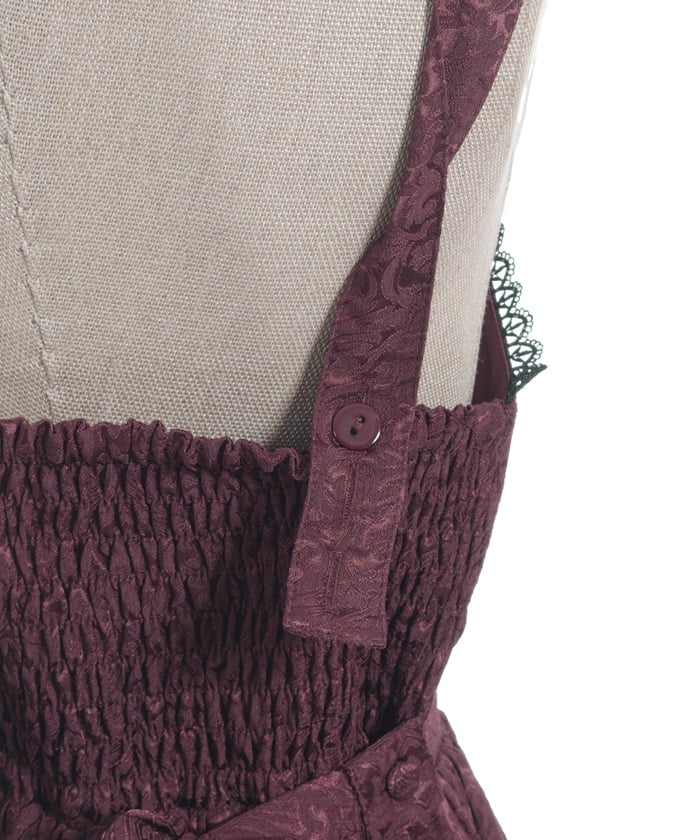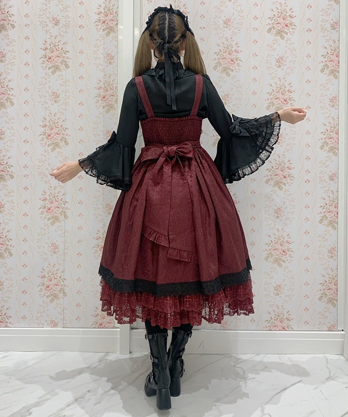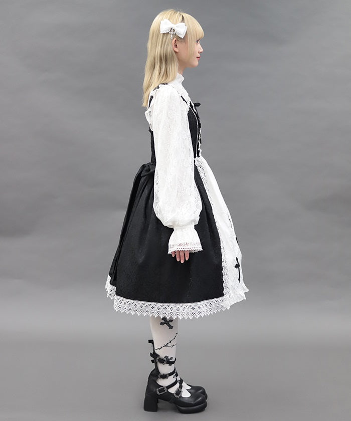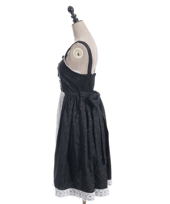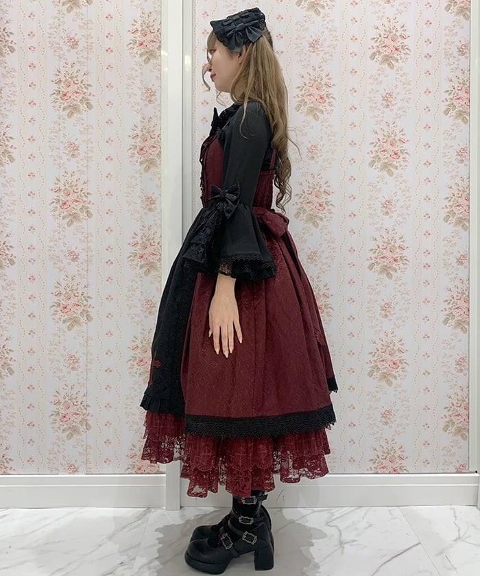 The upper bodice features a lace-up design, while the skirt features a large cross motif. The jumper skirt as a whole is made with a generous amount of elegant, lustrous jacquard fabric.