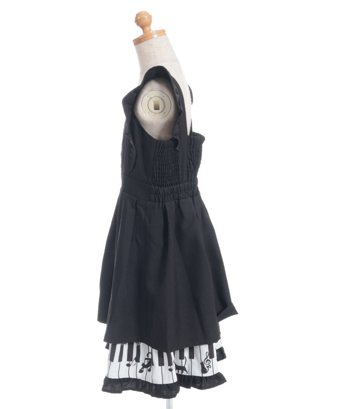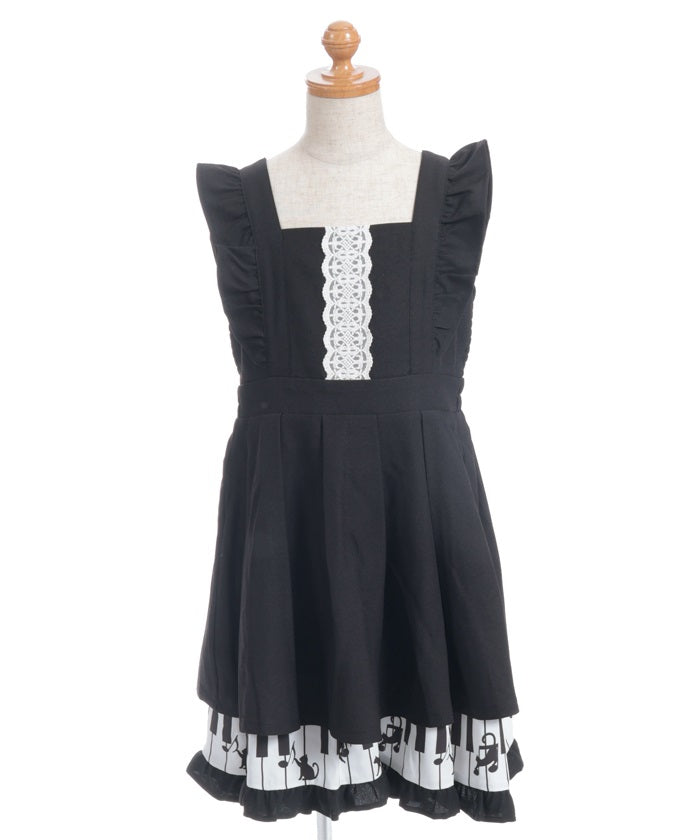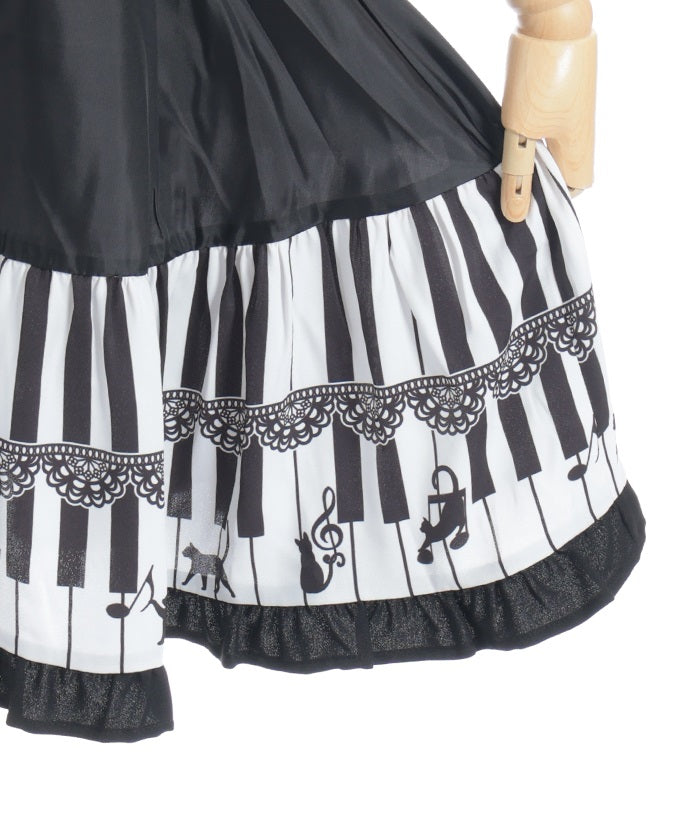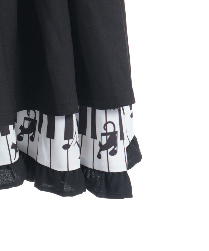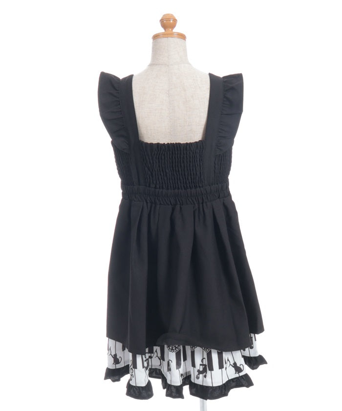 This jumper skirt features a fun, contrasting print of a cat playing with piano keys. It's a sophisticated piece with a playful touch.