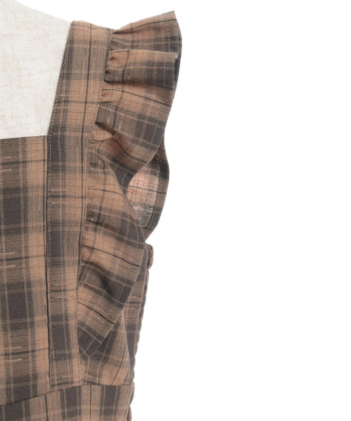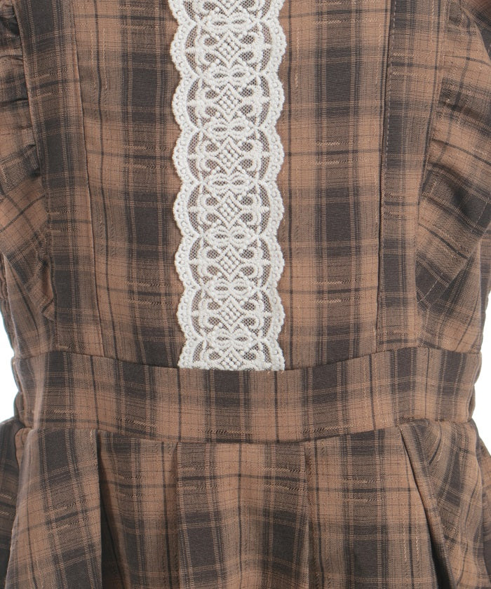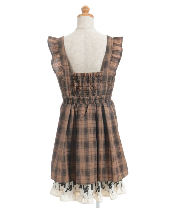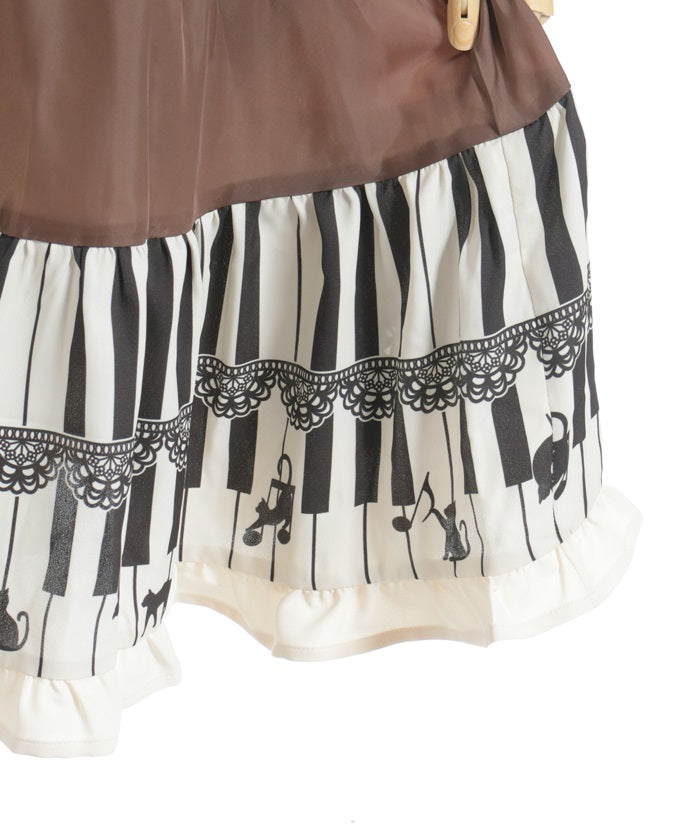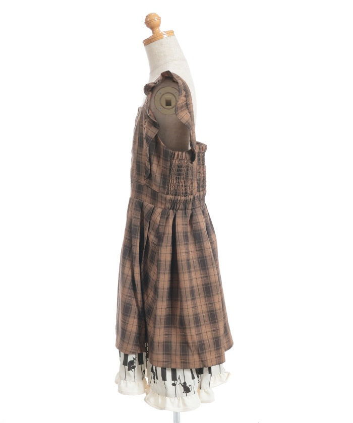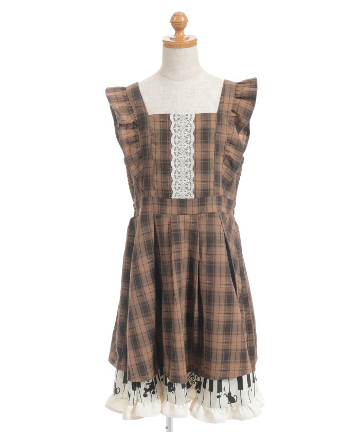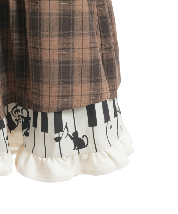 The ruffled shoulders and lace at the chest add a girly touch. The hem features a print of a cat playing with musical notes on the piano keys, making it super cute even from behind. Available in two colors: a classic brown check and a chic, solid black.