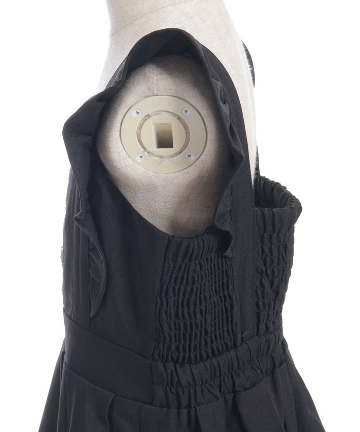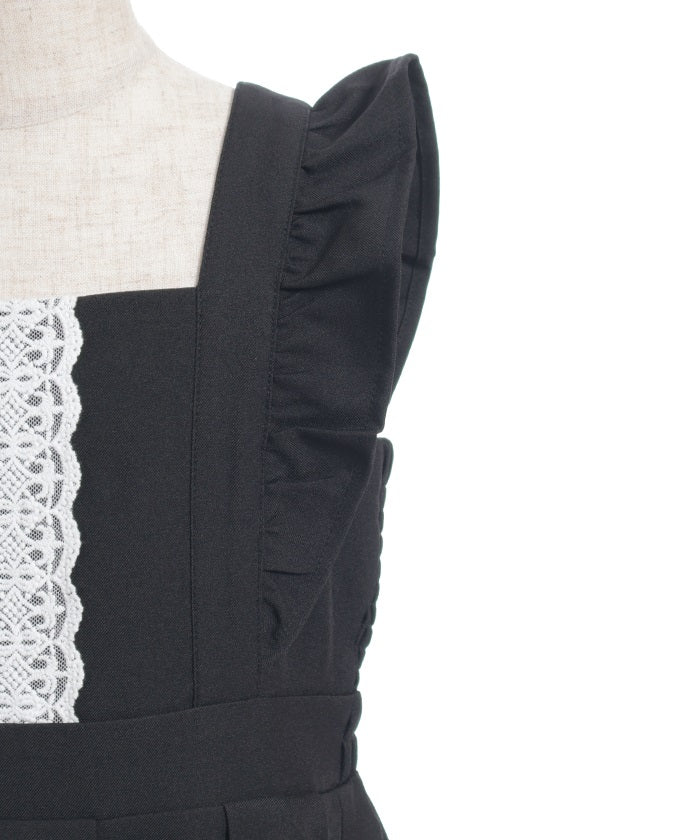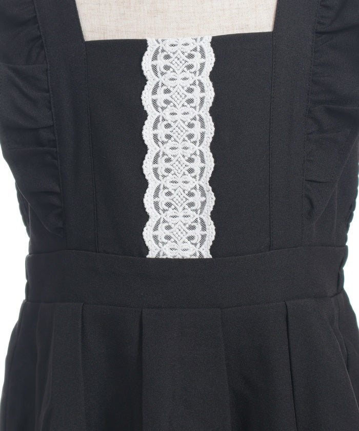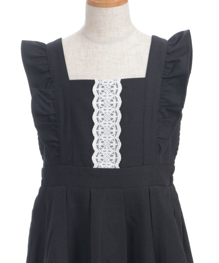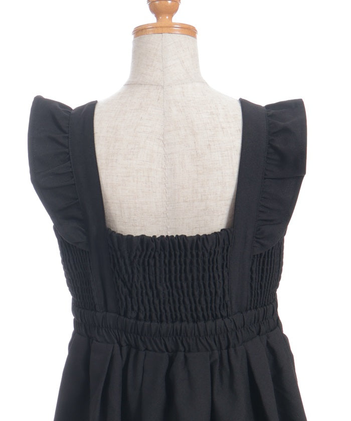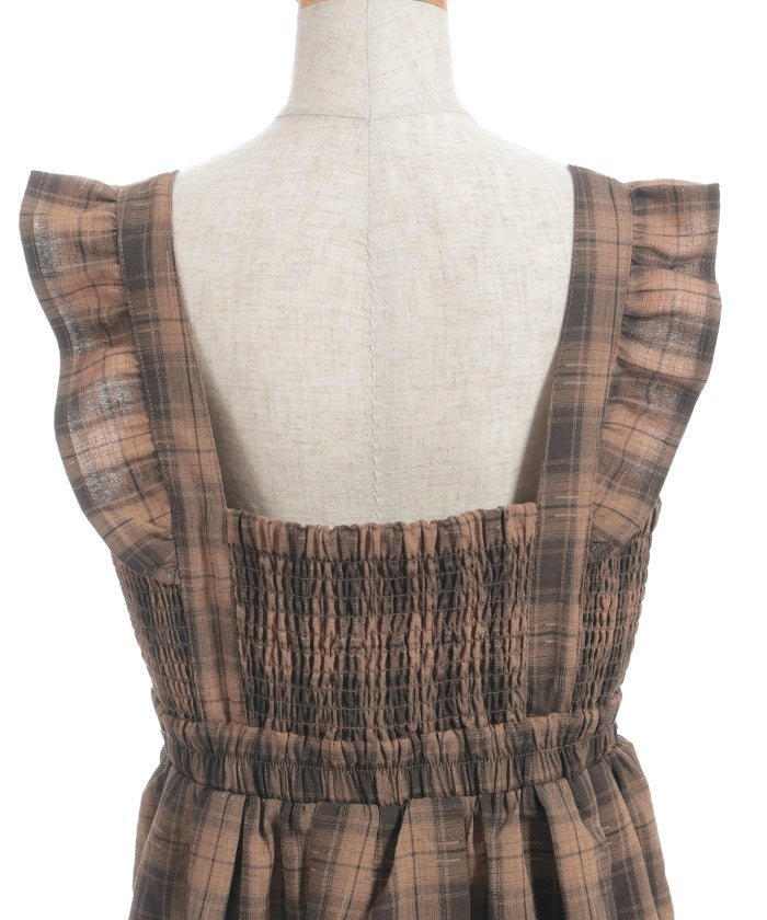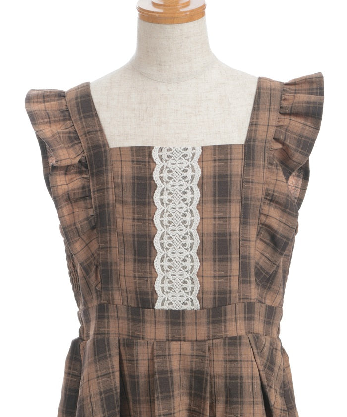 The ruffled shoulders and lace at the chest add a girly touch. The hem features a print of a cat playing with musical notes on the piano keys, making it super cute even from behind. Available in two colors: a classic brown check and a chic, solid black.
