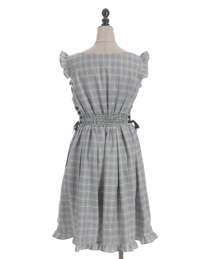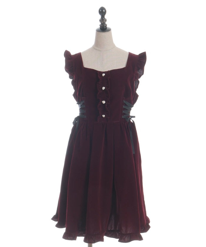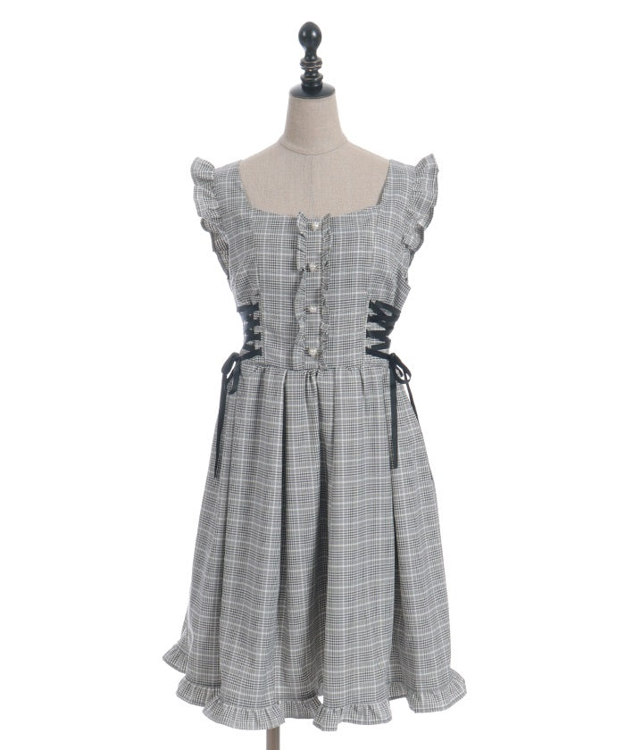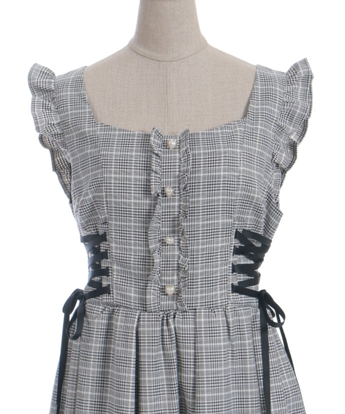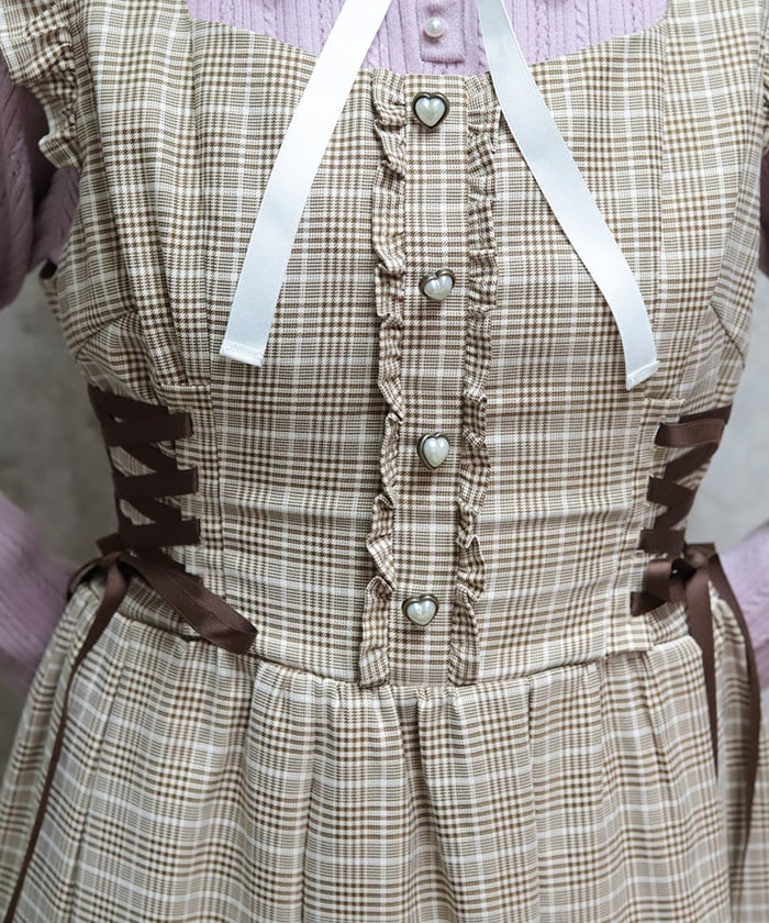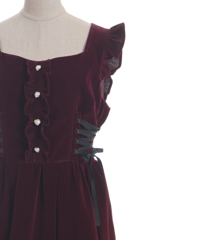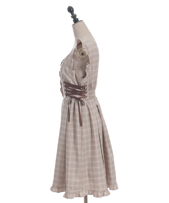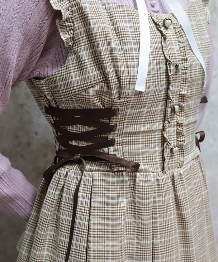 A jumper dress featuring contrasting lace detailing on both sides.