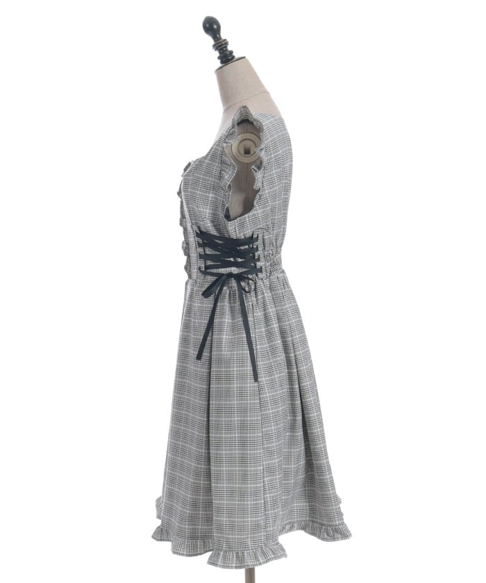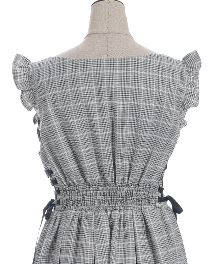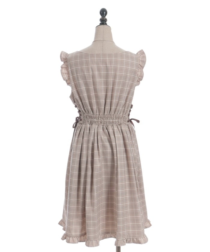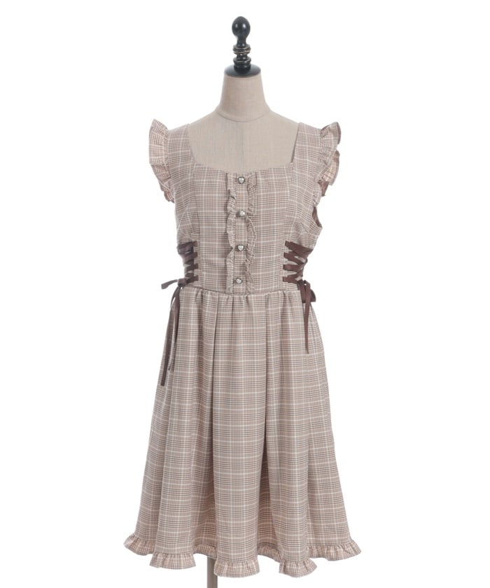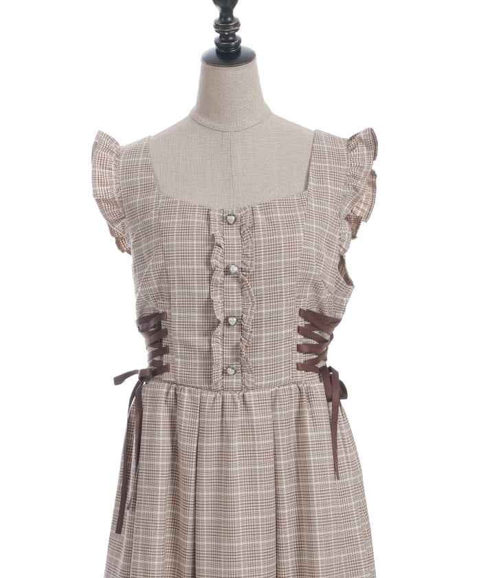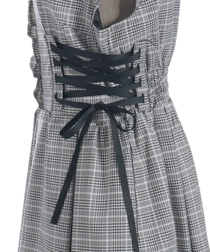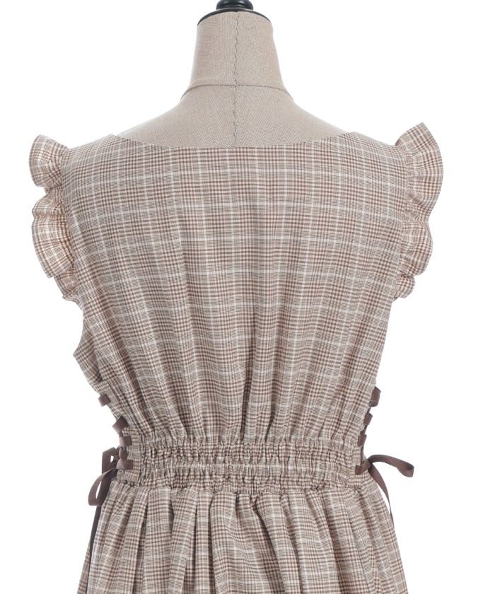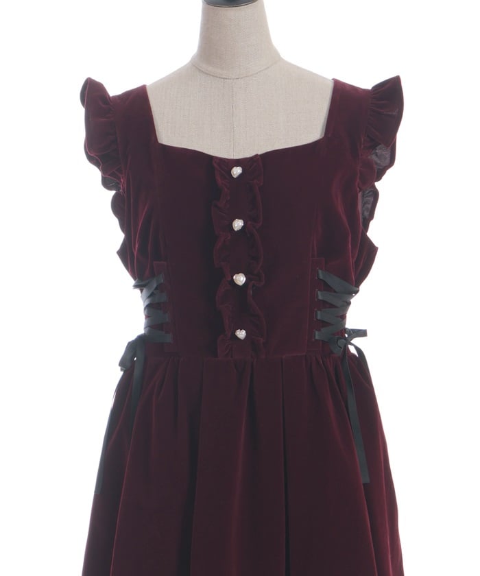 A jumper dress featuring contrasting lace detailing on both sides.