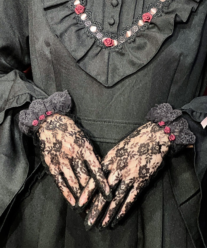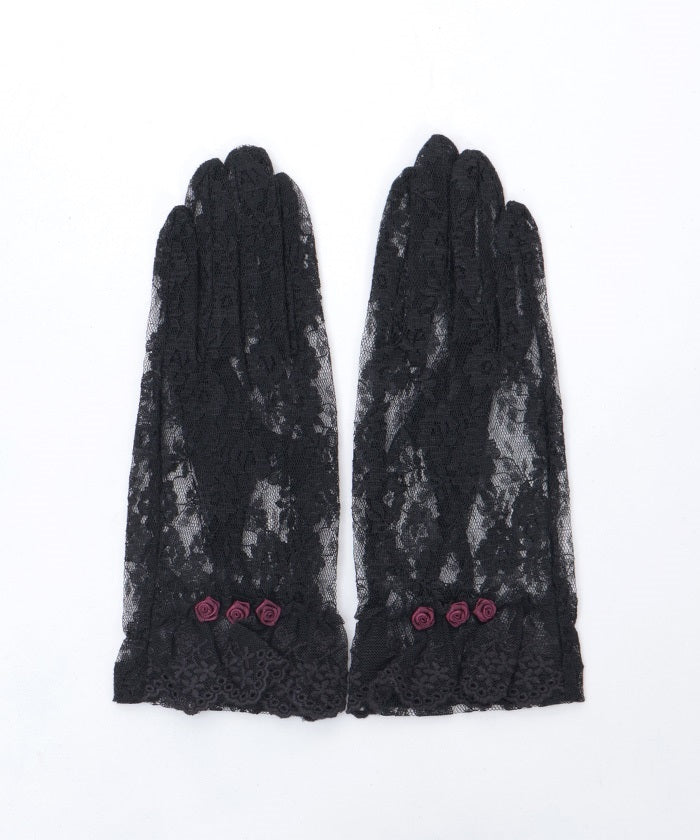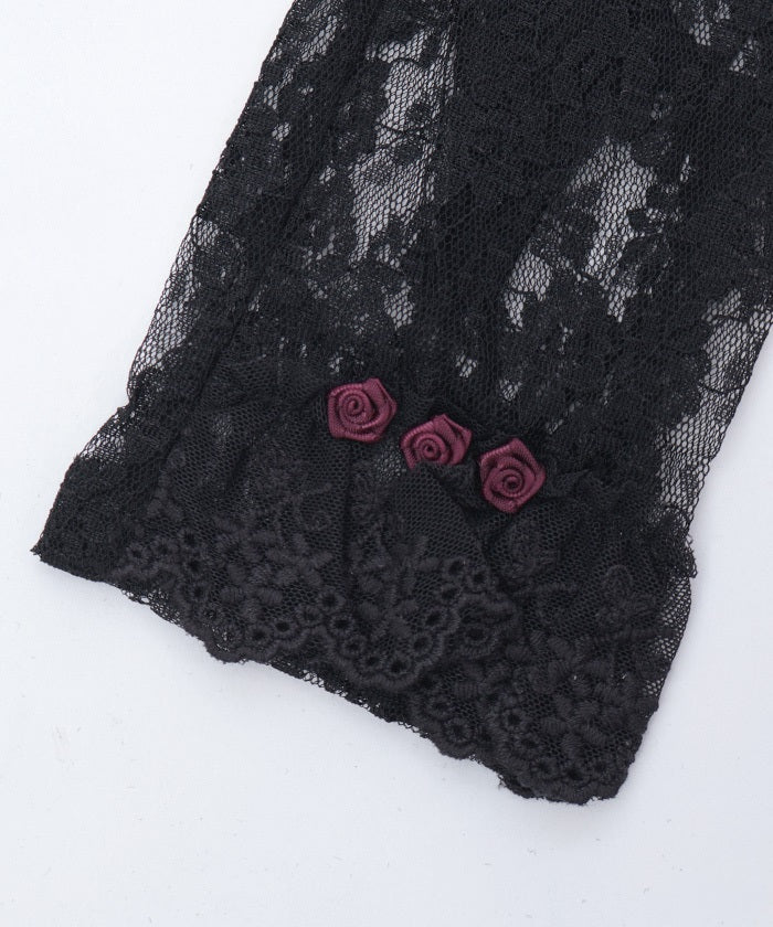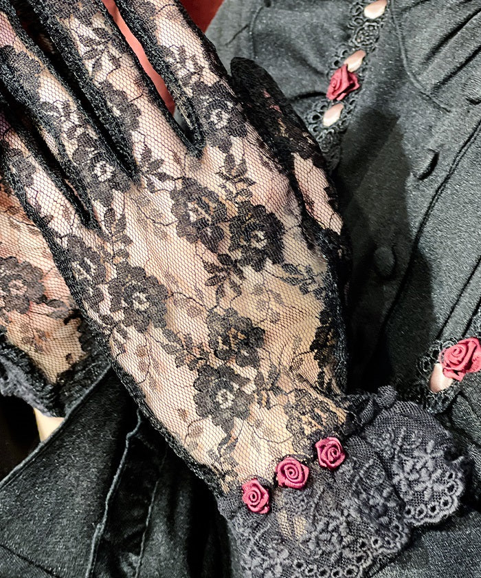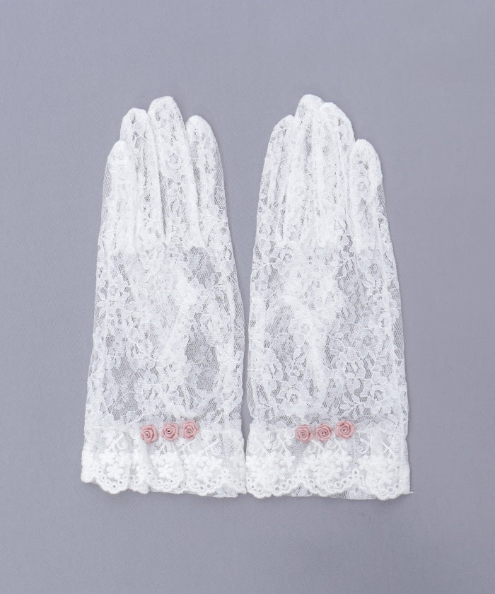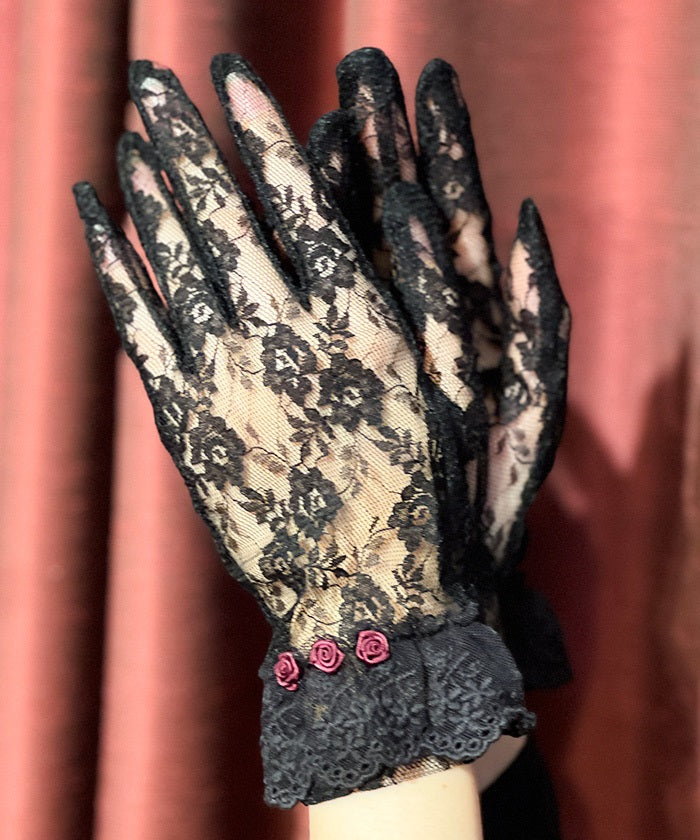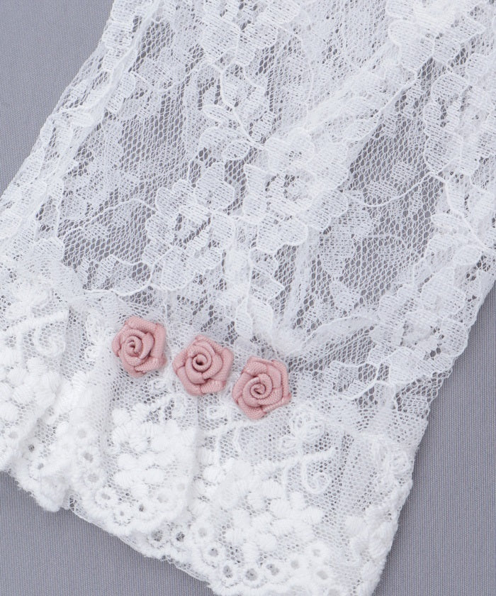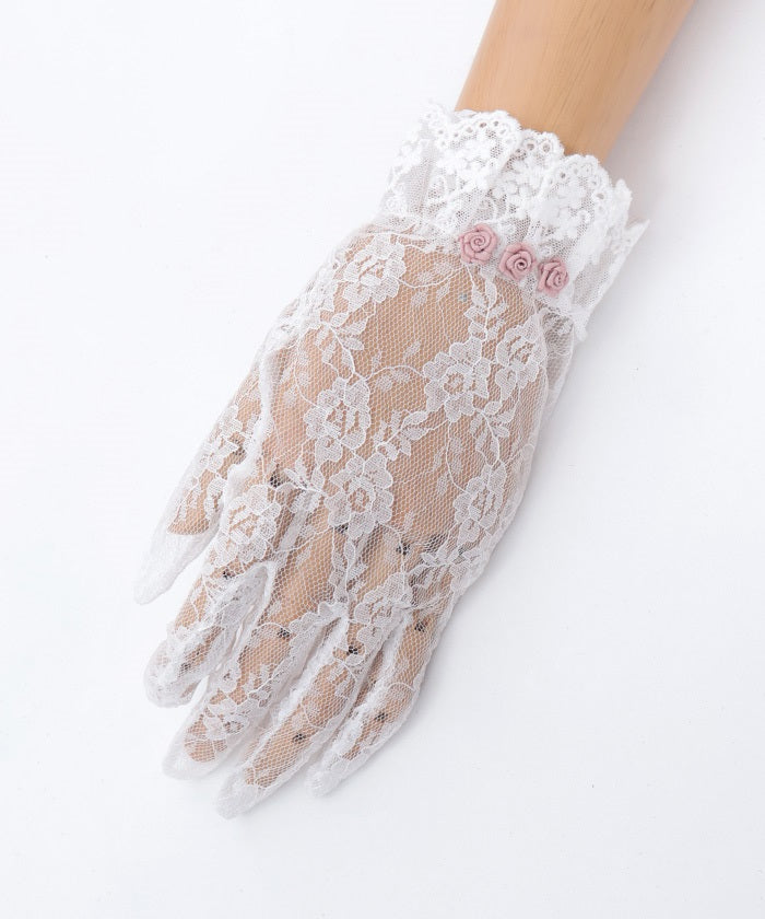 Elegant all-lace gloves with rose embellishments adorn your hands.