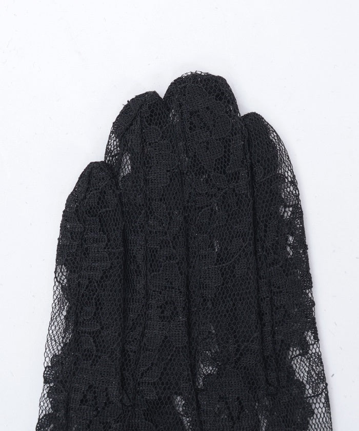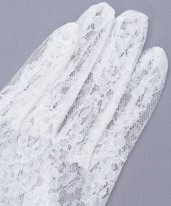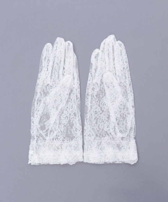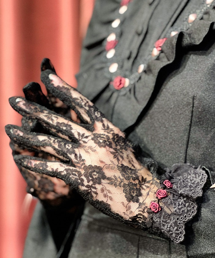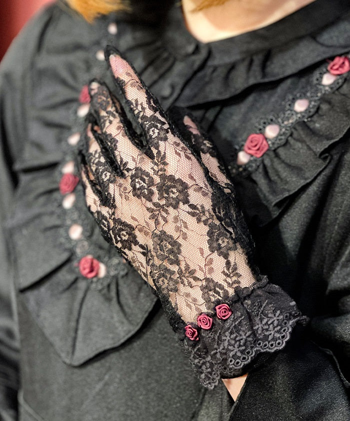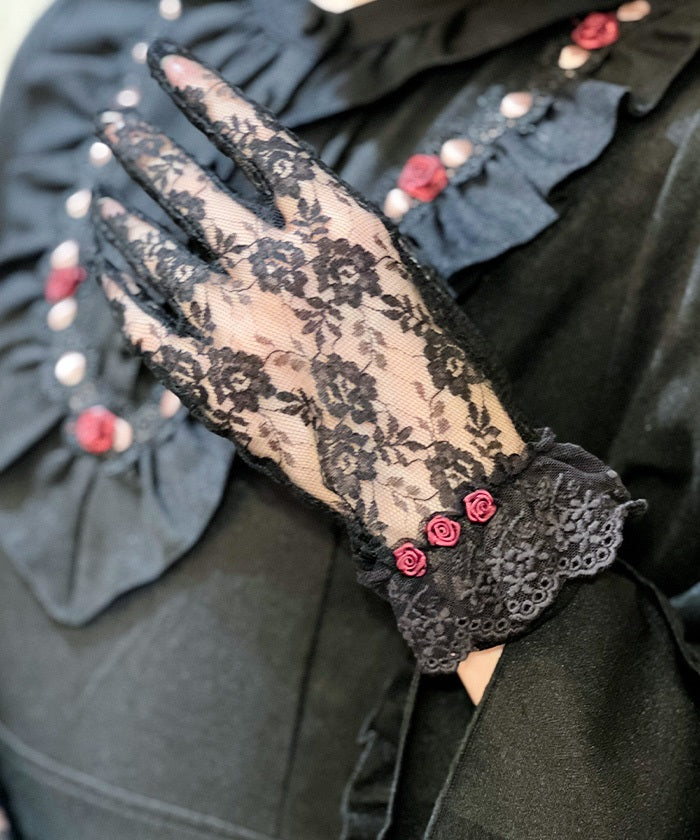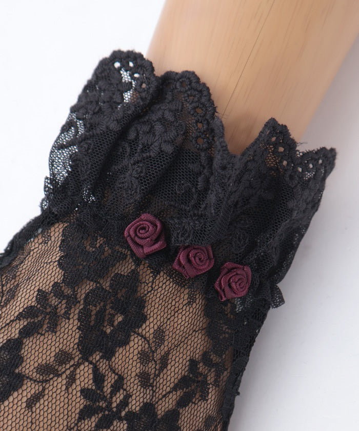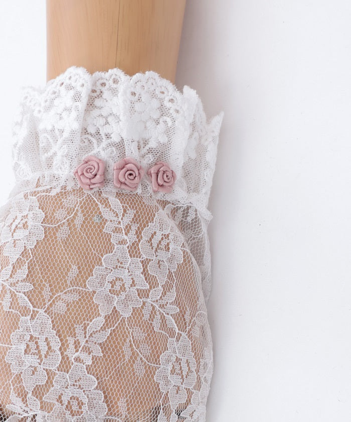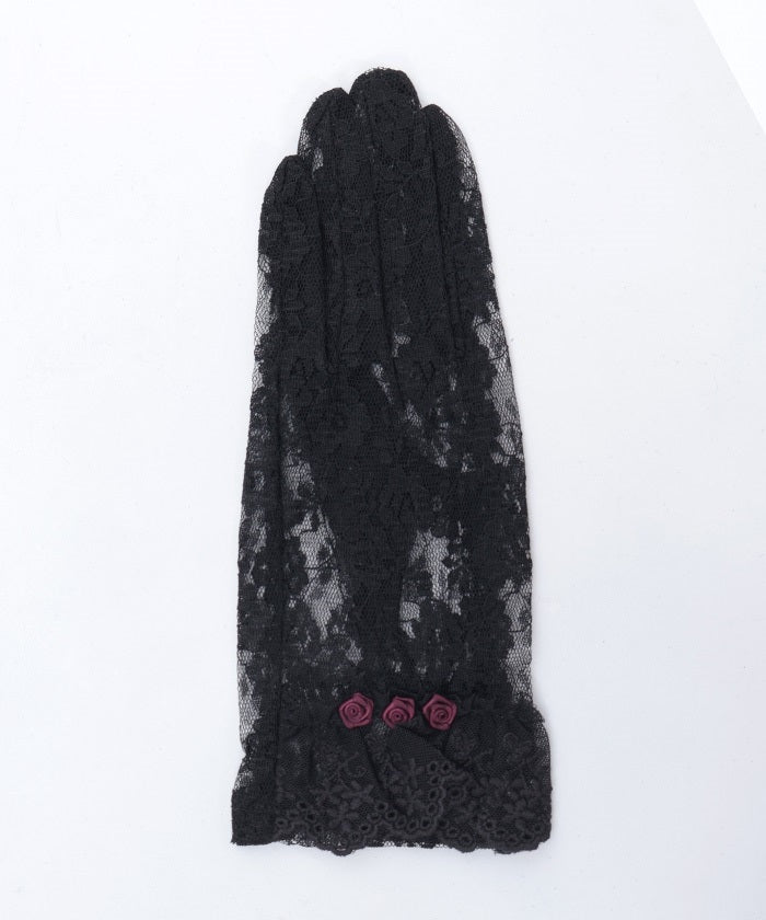 Elegant all-lace gloves with rose embellishments adorn your hands.