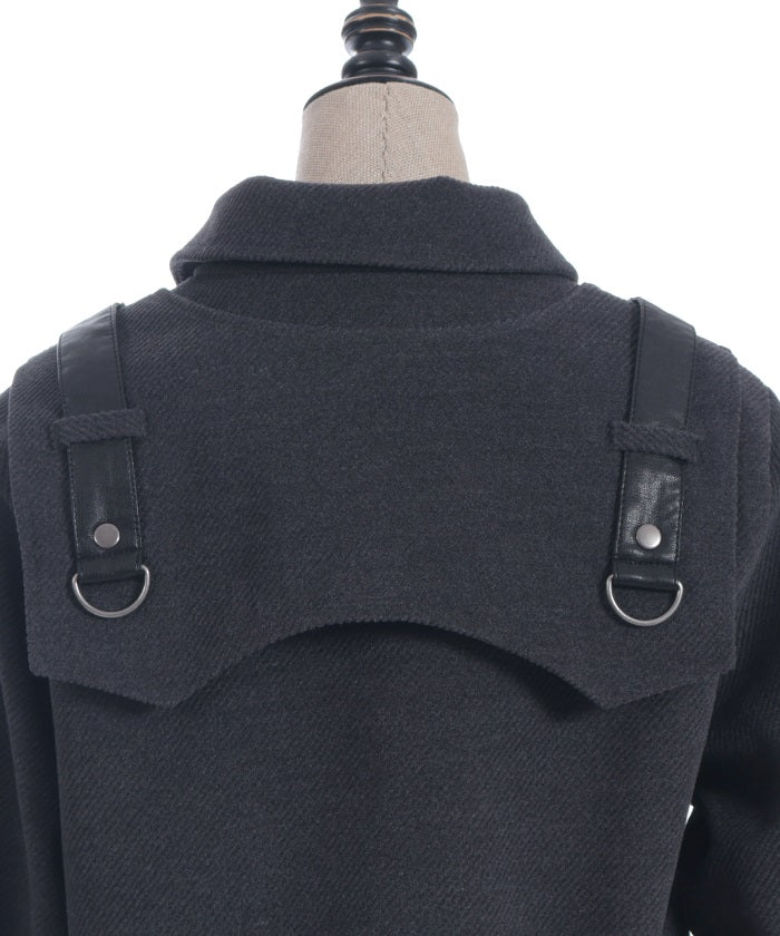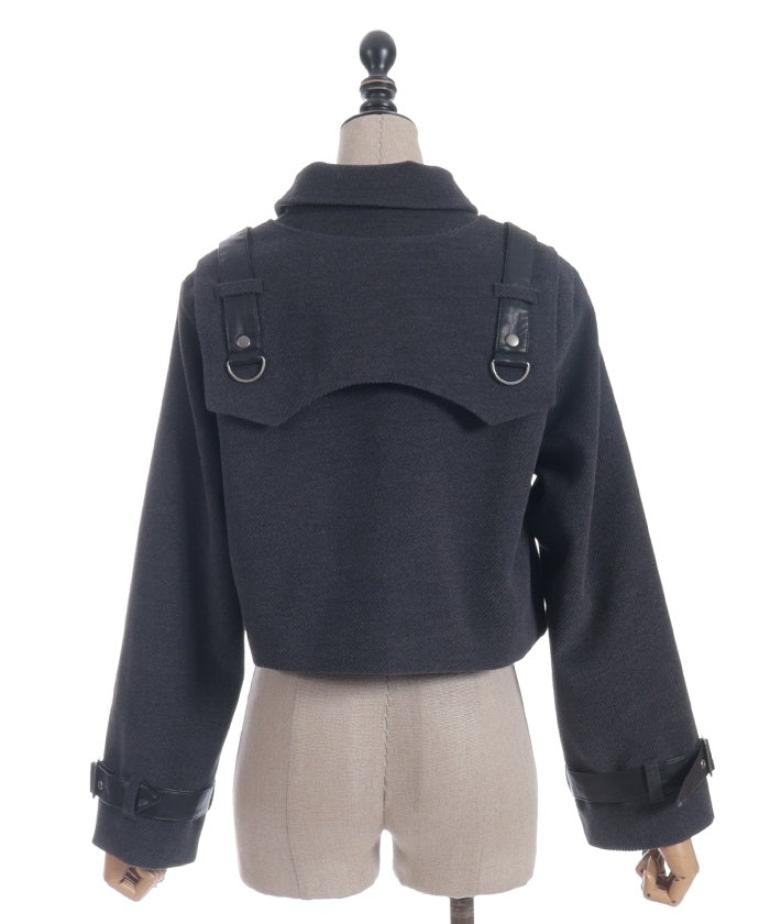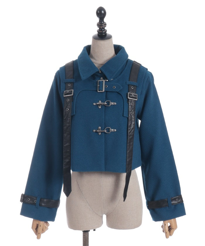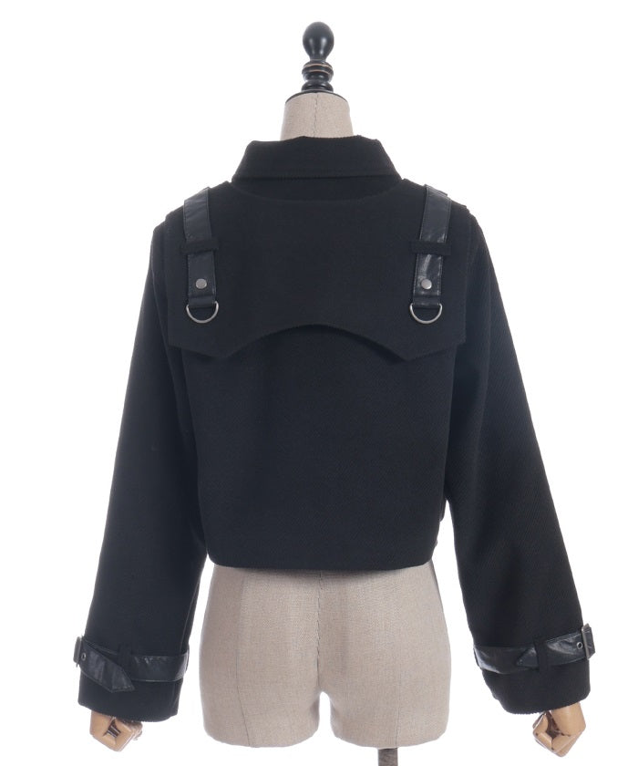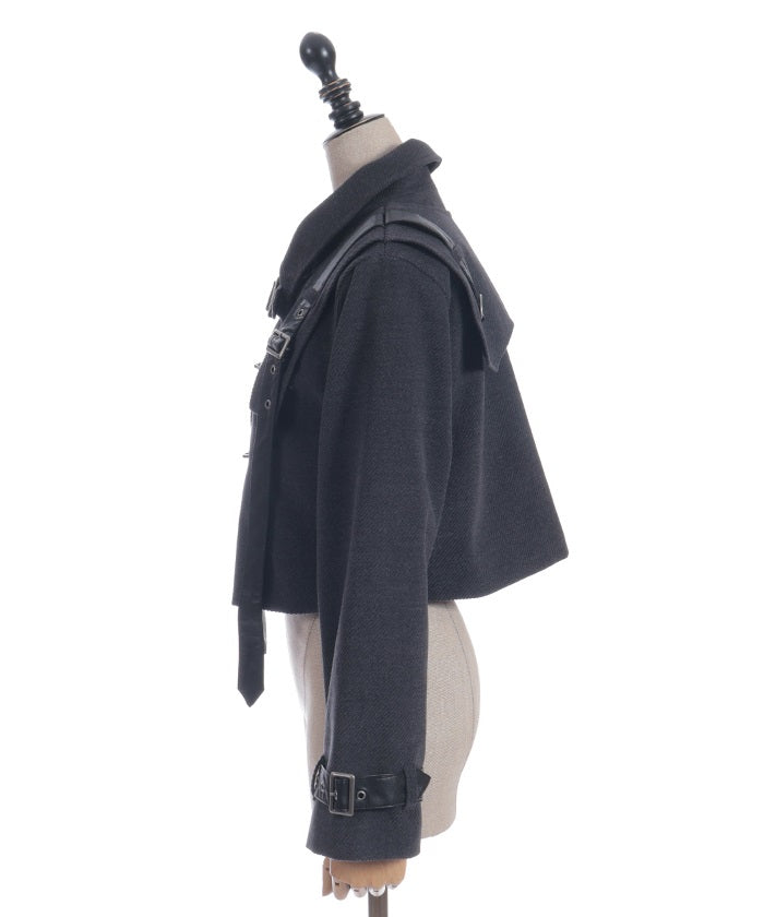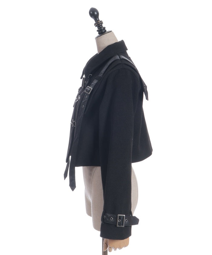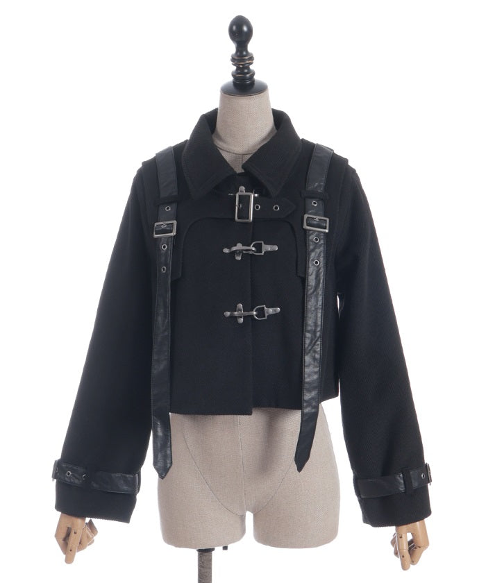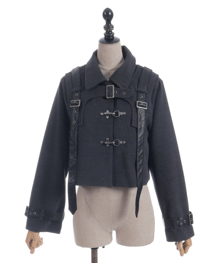 A short coat with a tough finish from its harness-style belts and metal hardware.