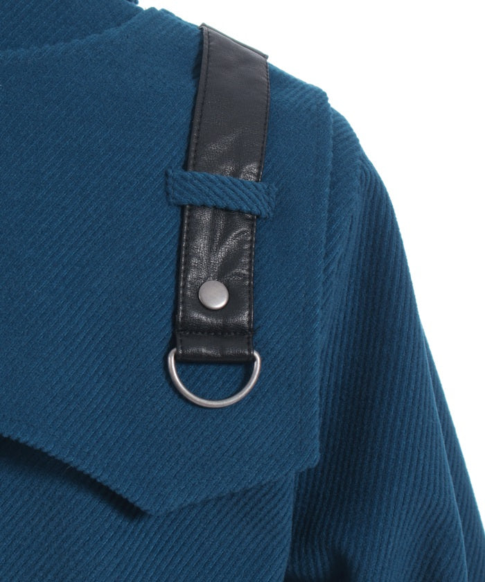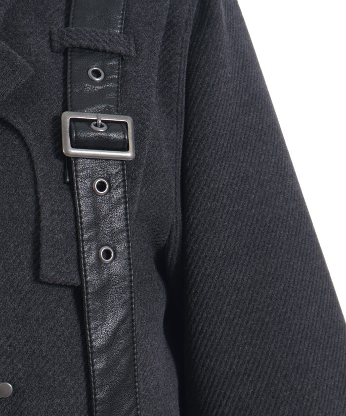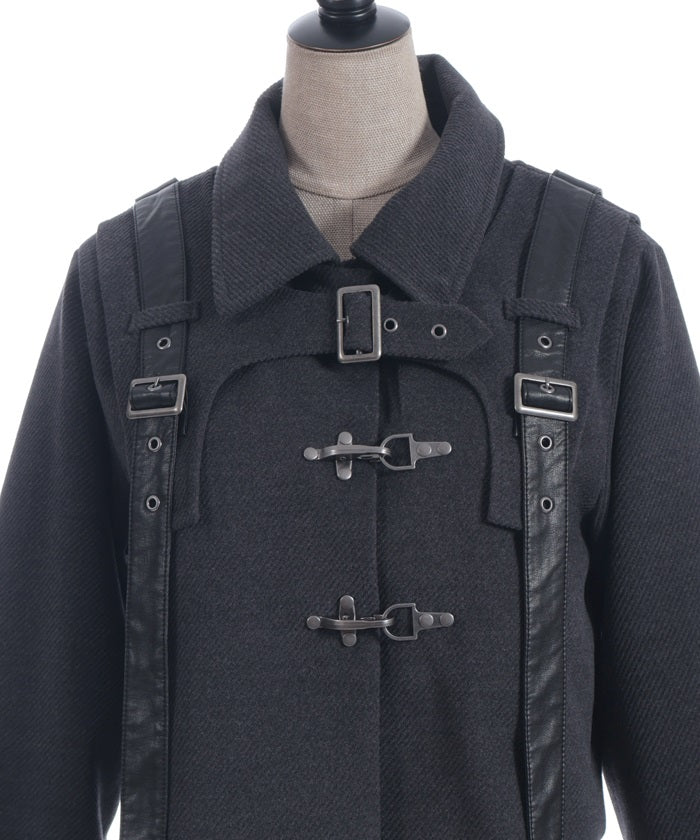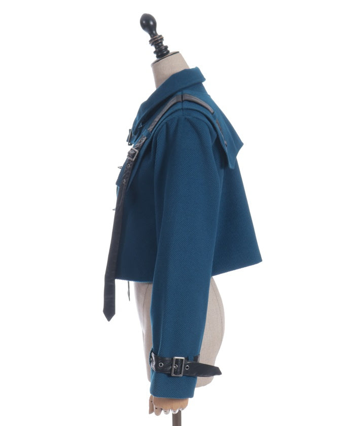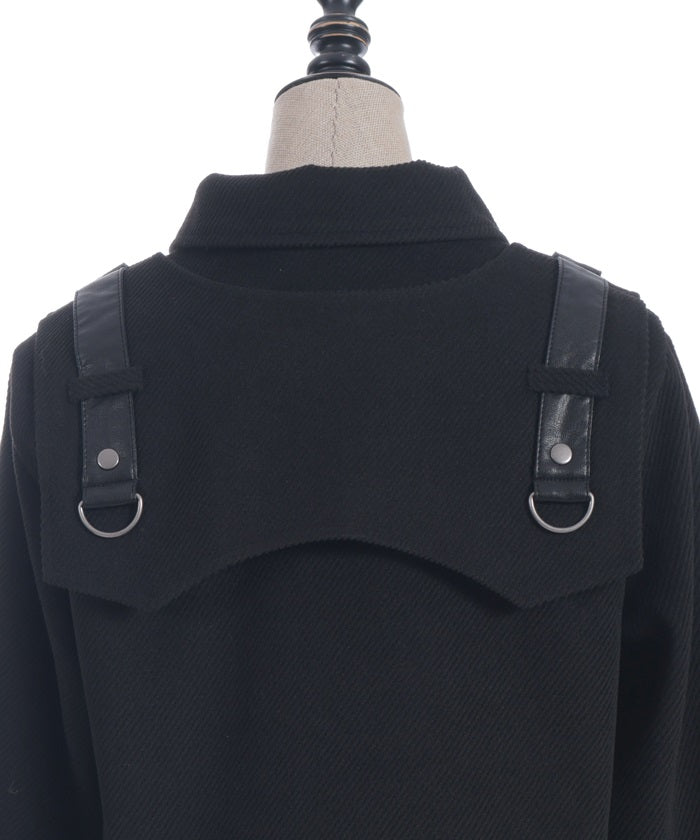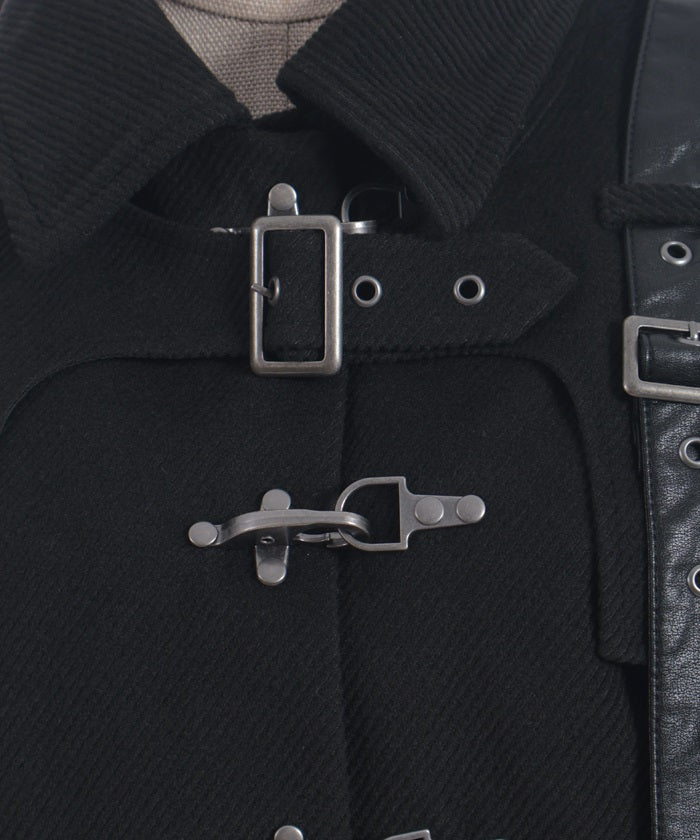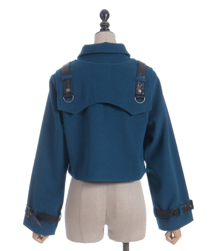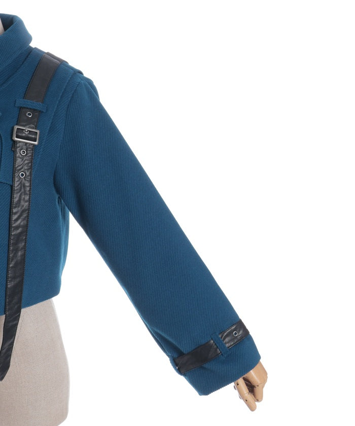 A short coat with a tough finish from its harness-style belts and metal hardware.