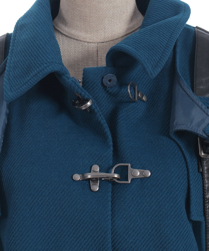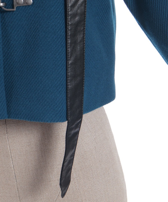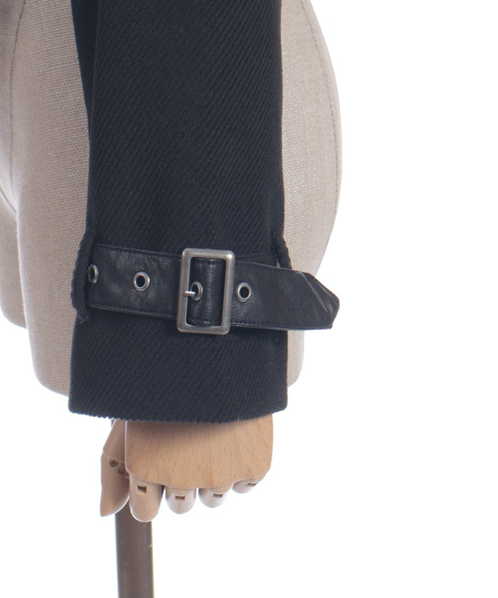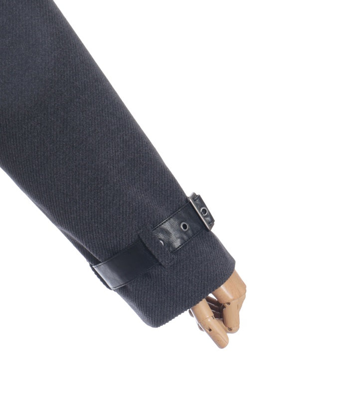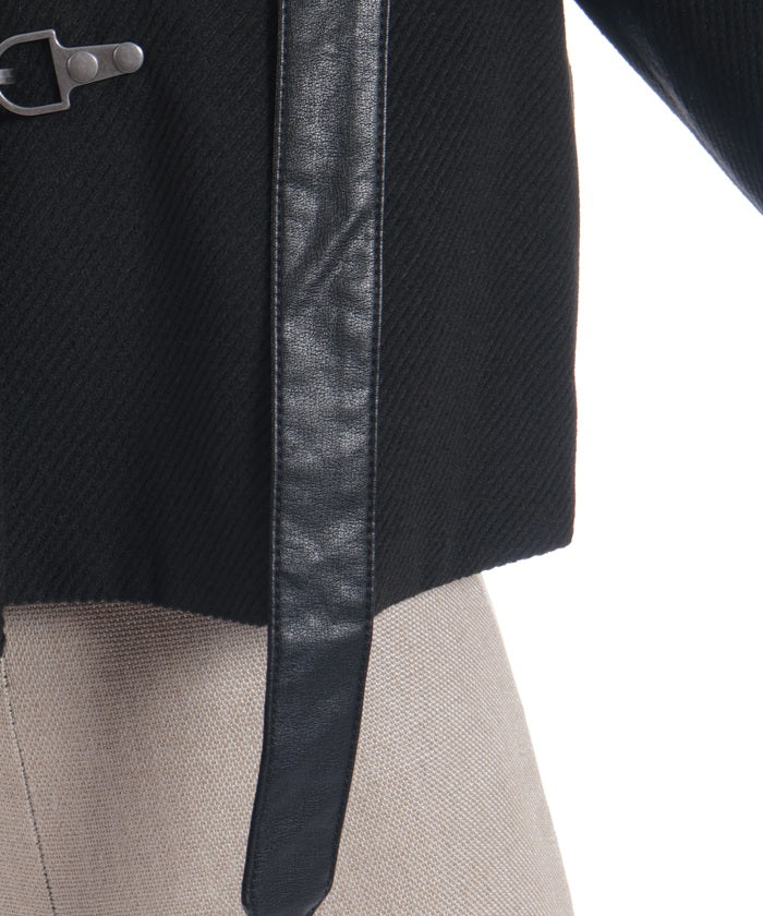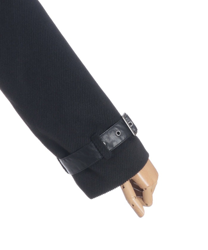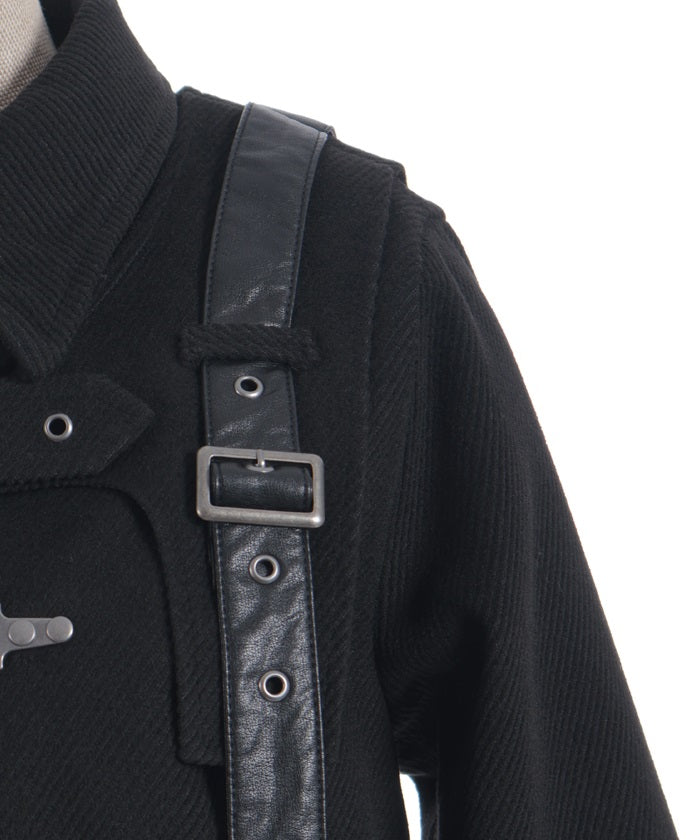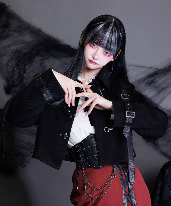 A short coat with a tough finish from its harness-style belts and metal hardware.
