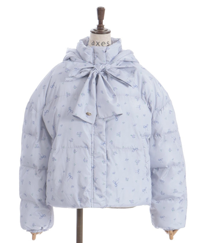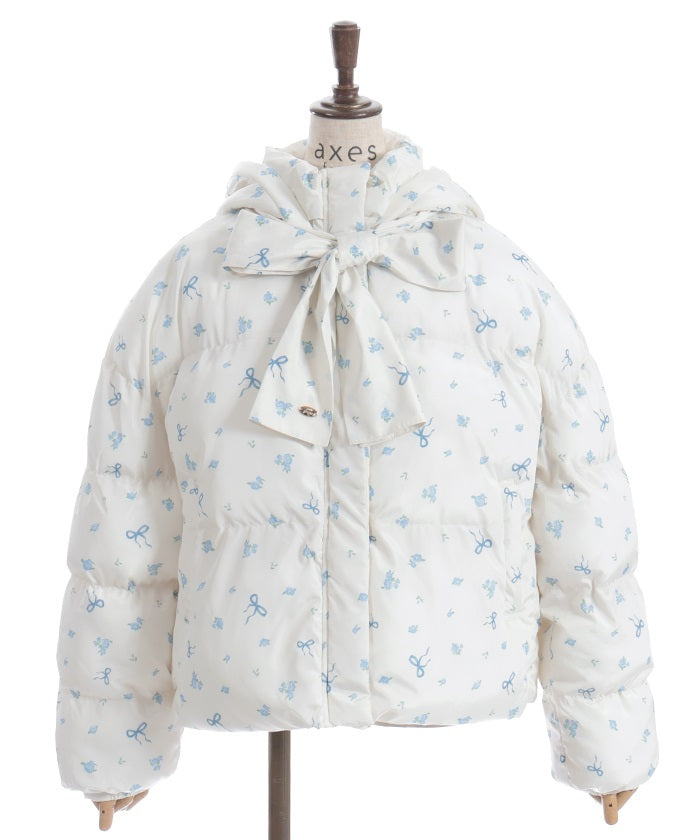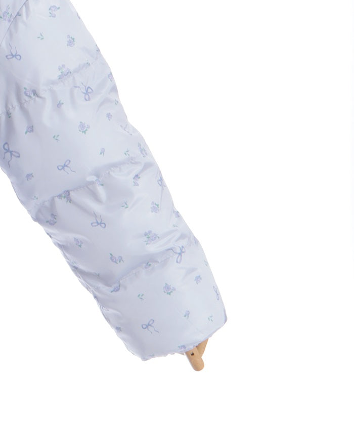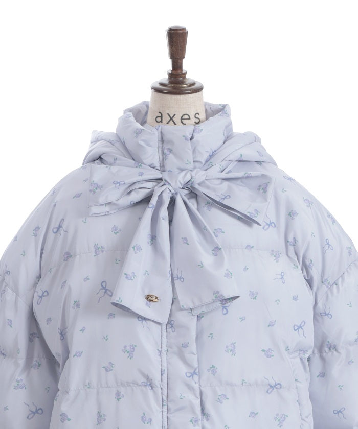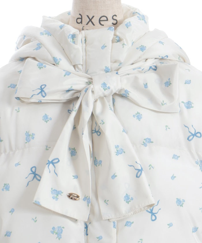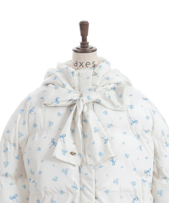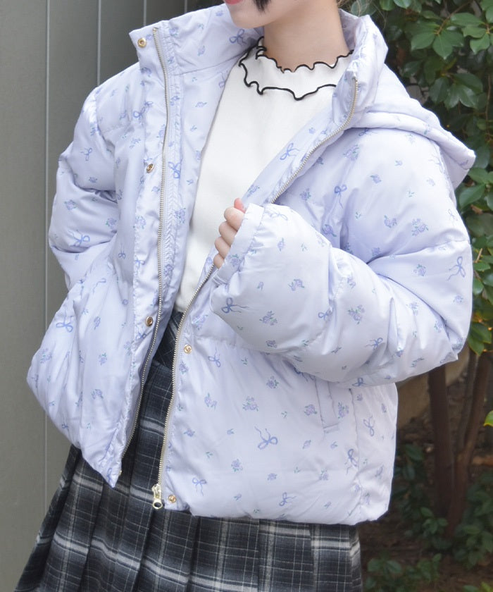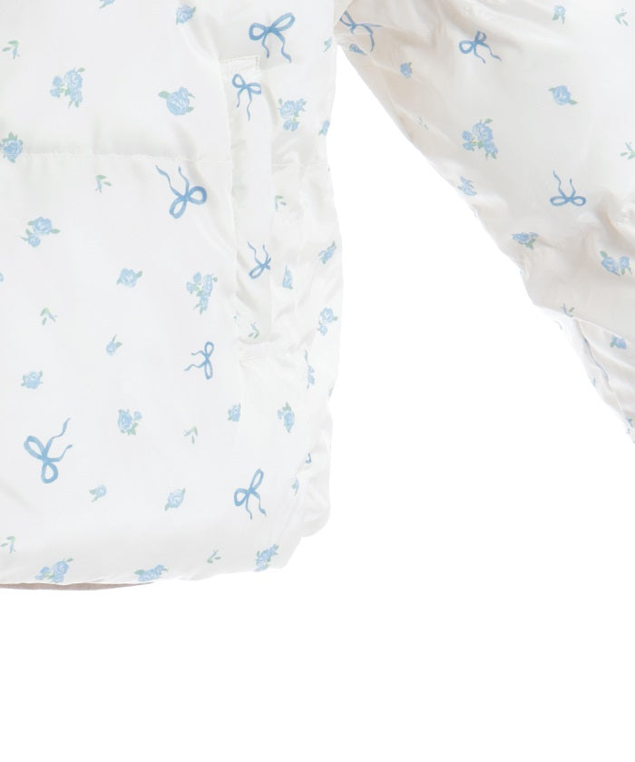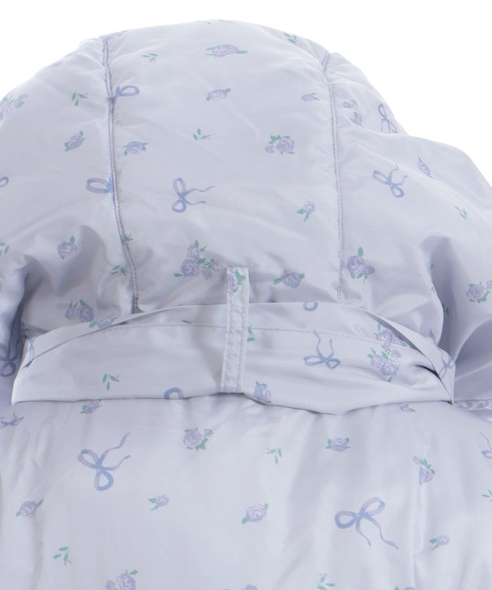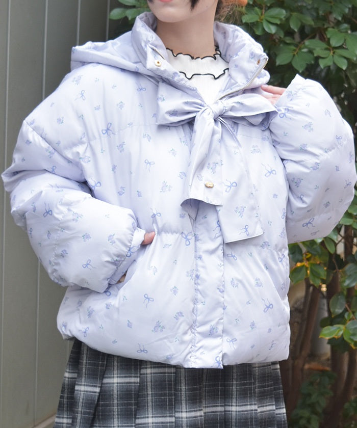 The all-over small floral pattern adds a touch of sweetness, and closing the front and tying the ribbon adds an even more glamorous touch. The rounded silhouette creates a soft and gentle impression.
