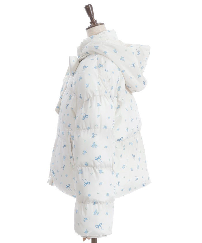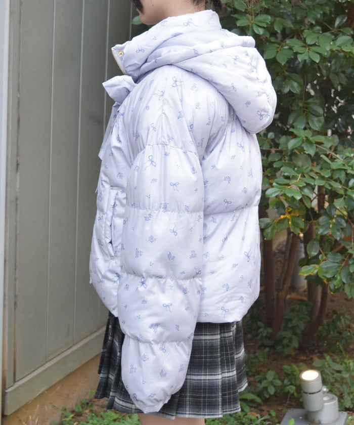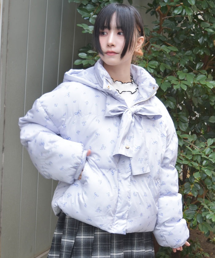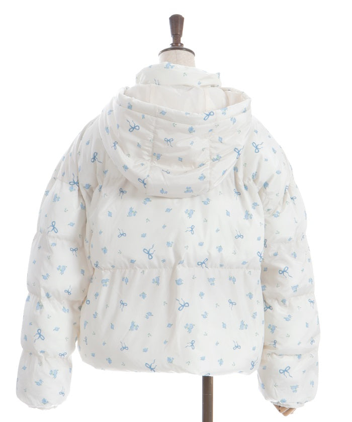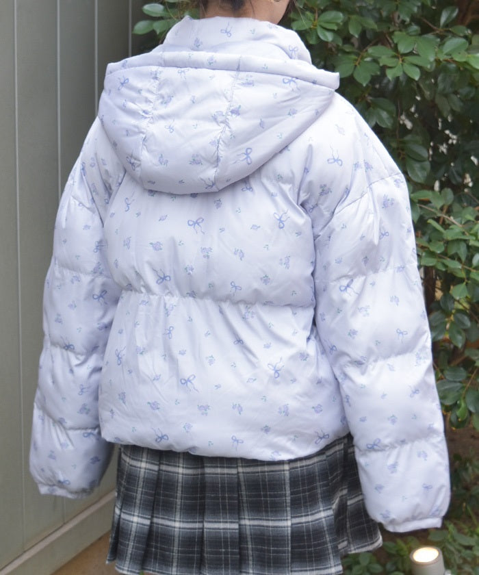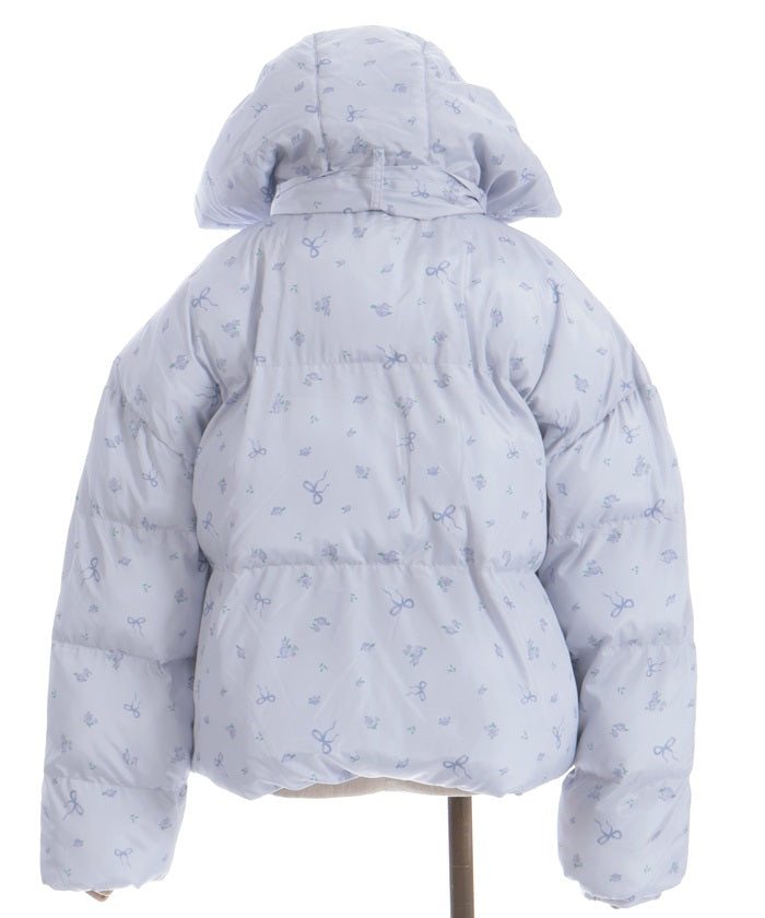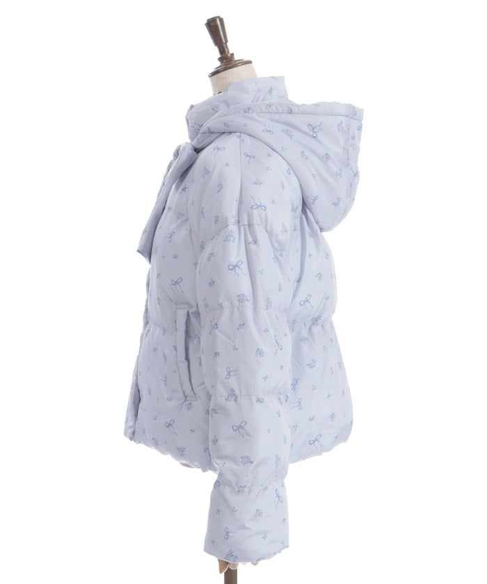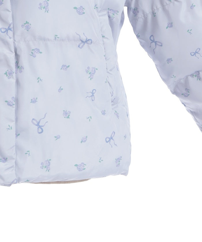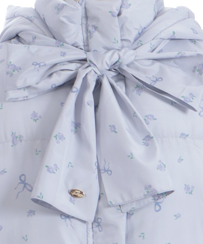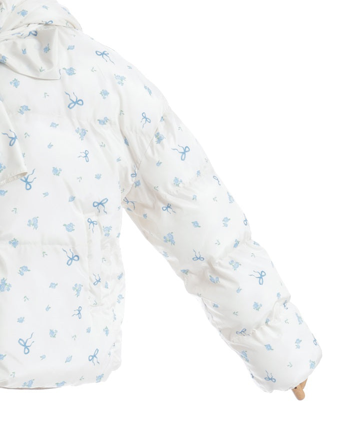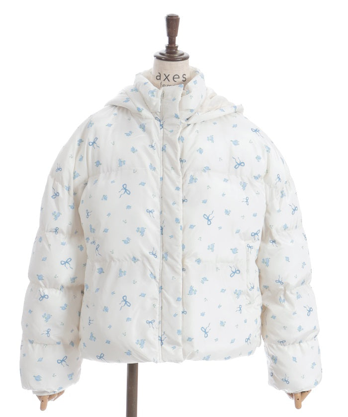 The all-over small floral pattern adds a touch of sweetness, and closing the front and tying the ribbon adds an even more glamorous touch. The rounded silhouette creates a soft and gentle impression.