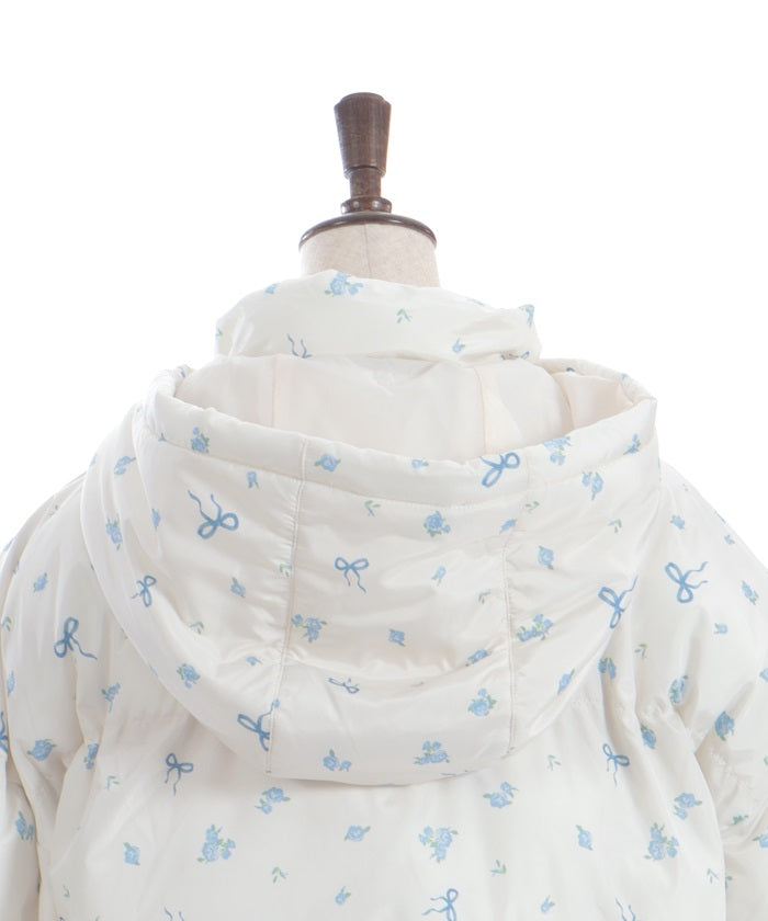 This feminine, original, small floral-print padded coat offers just the right amount of volume while remaining lightweight and comfortable. The hood provides excellent warmth, making it both practical and adorable.