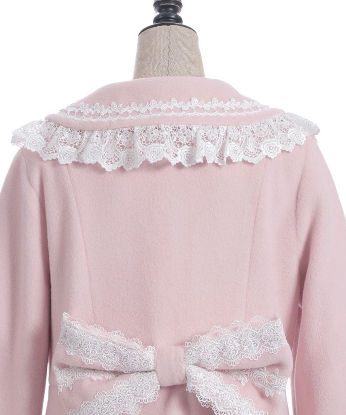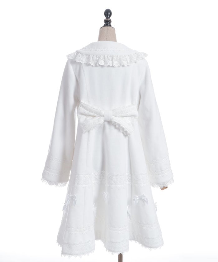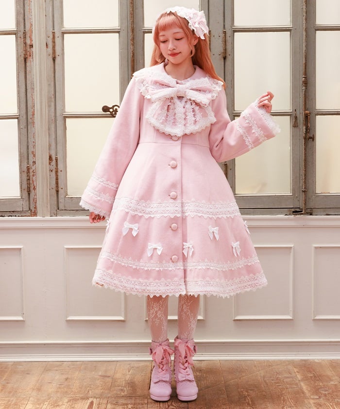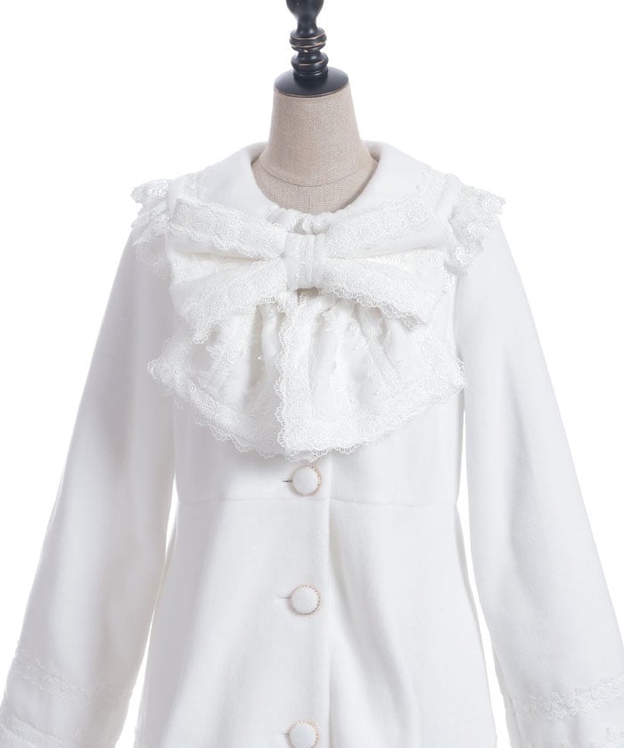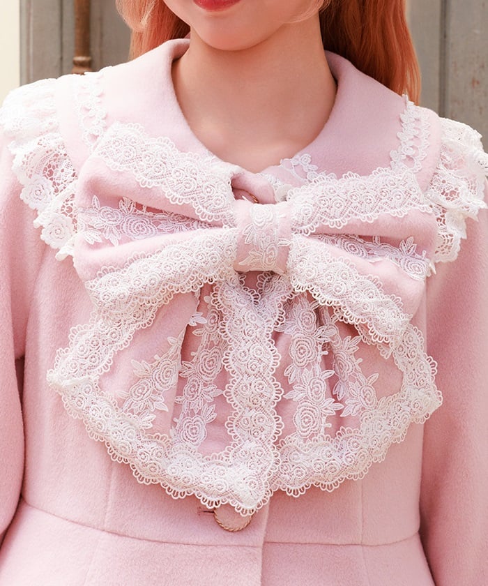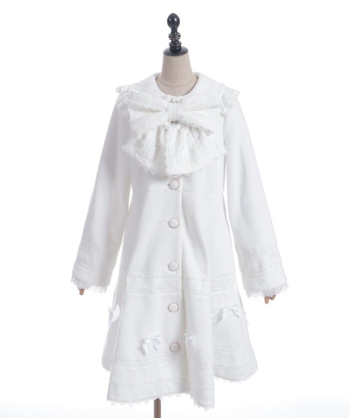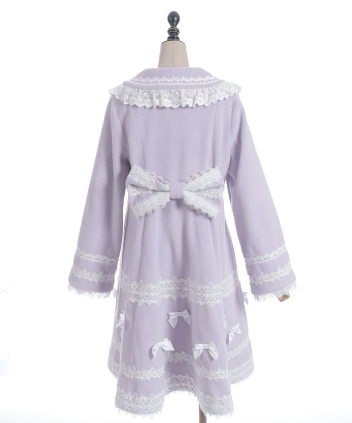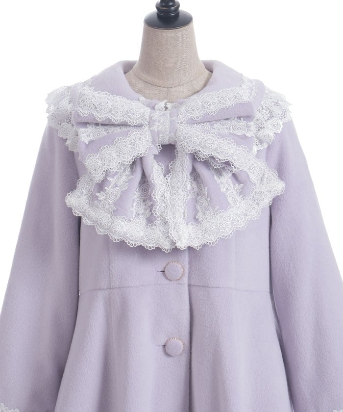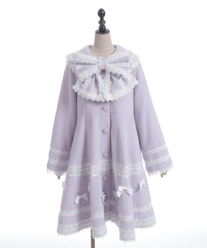 This long coat features a large, lace-trimmed ribbon at the collar. The ribbon is detachable with buttons, and even without it, the coat's round collar remains a charming design. The hem is also adorned with numerous ribbons, making it a piece you'll want to wear all day long!