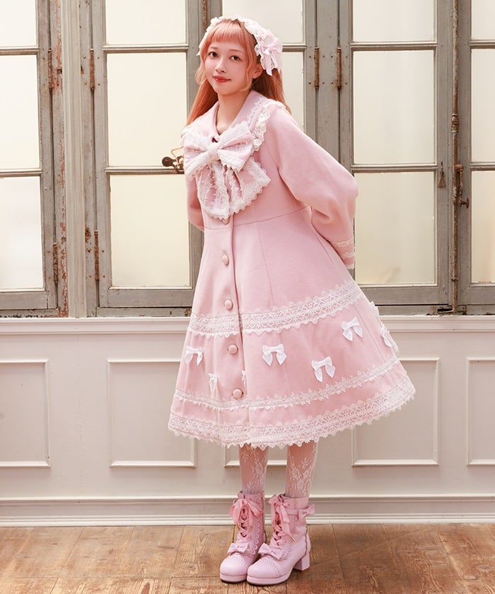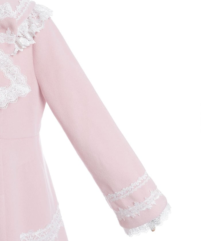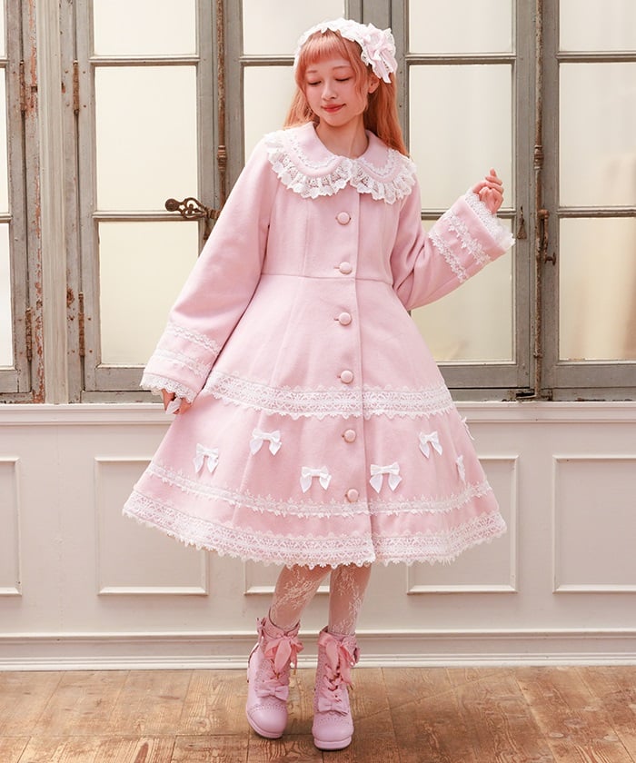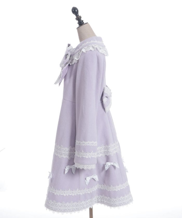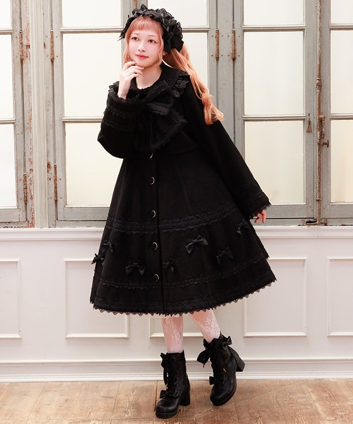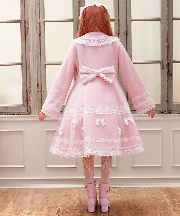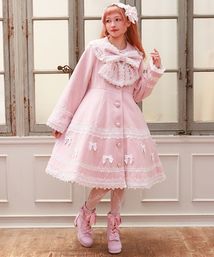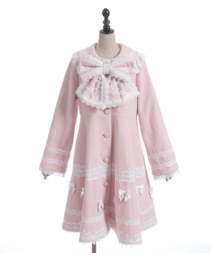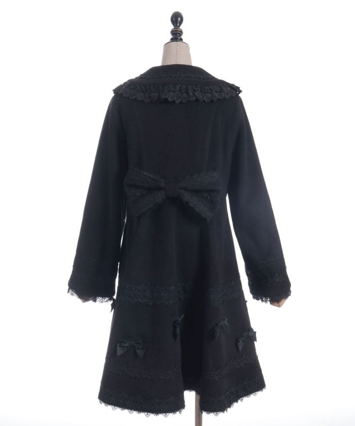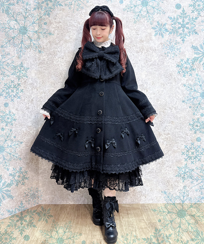 This long coat features a large, lace-trimmed ribbon at the collar. The ribbon is detachable with buttons, and even without it, the coat's round collar remains a charming design. The hem is also adorned with numerous ribbons, making it a piece you'll want to wear all day long!