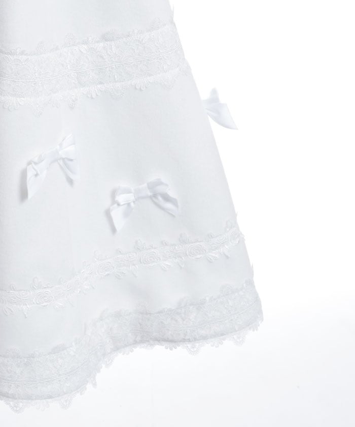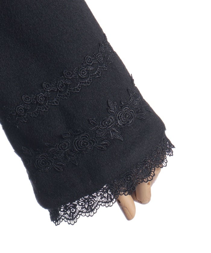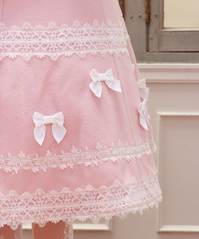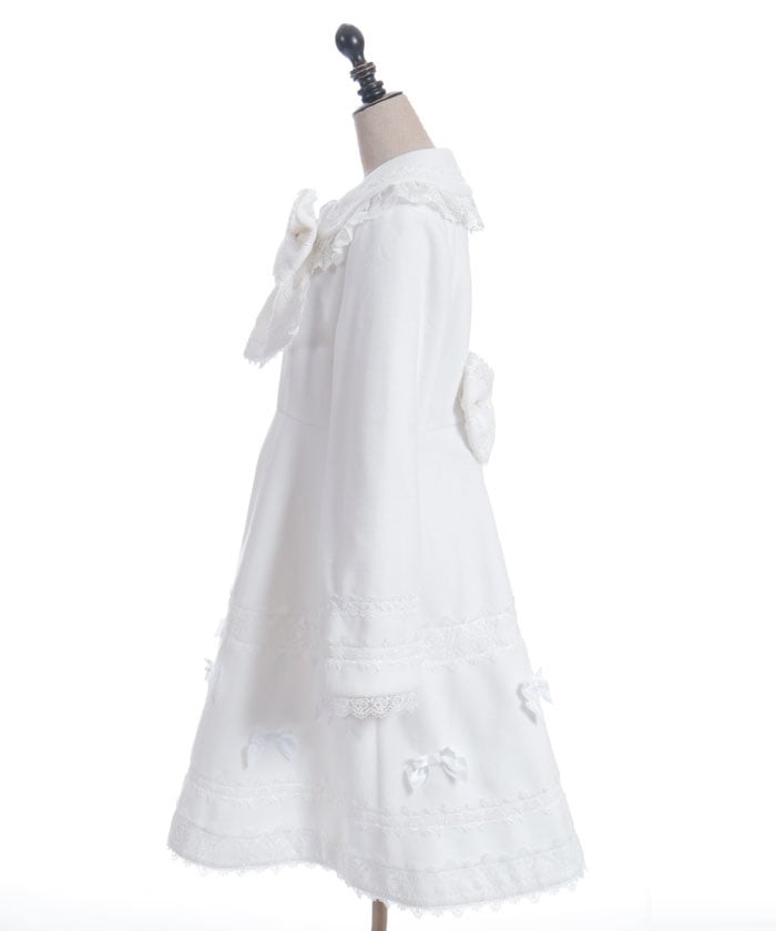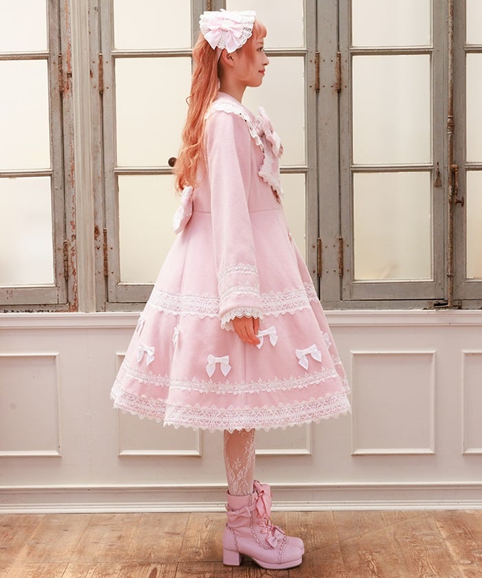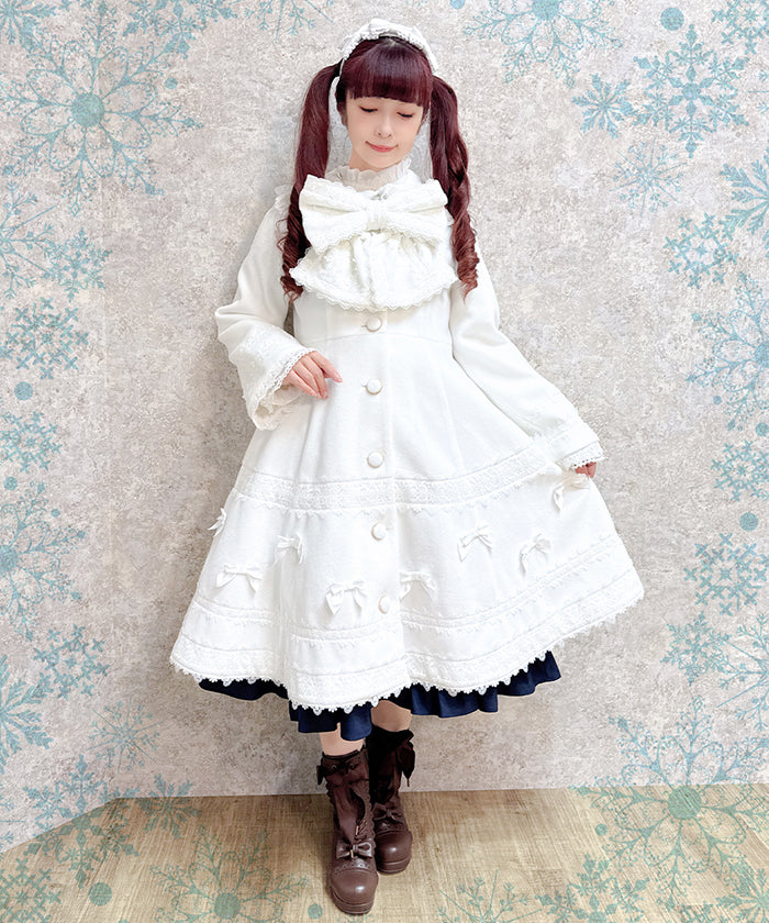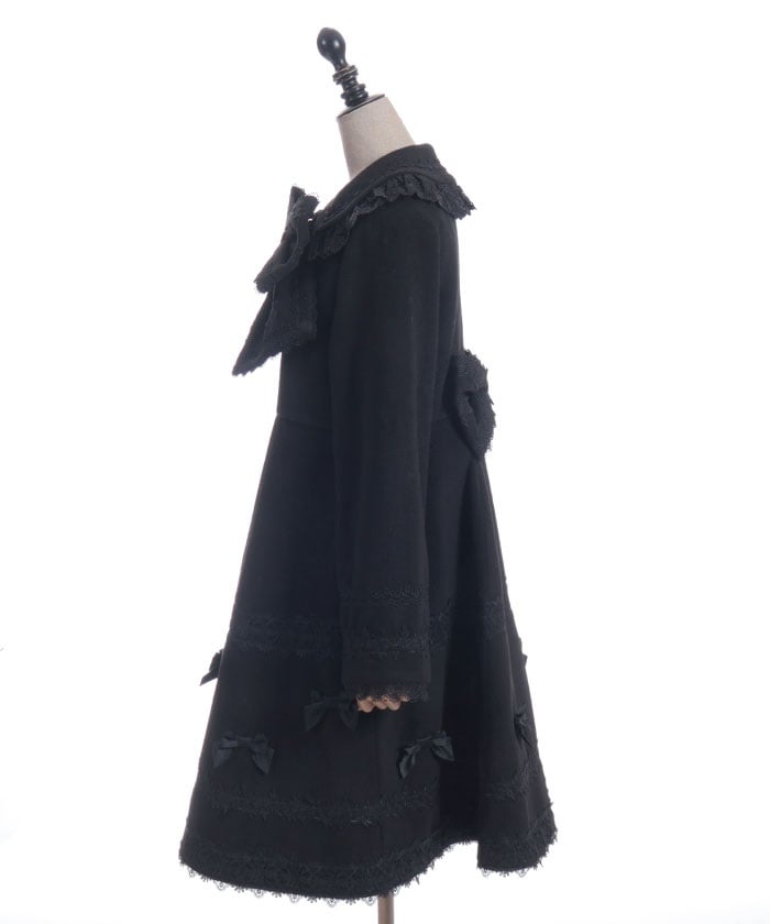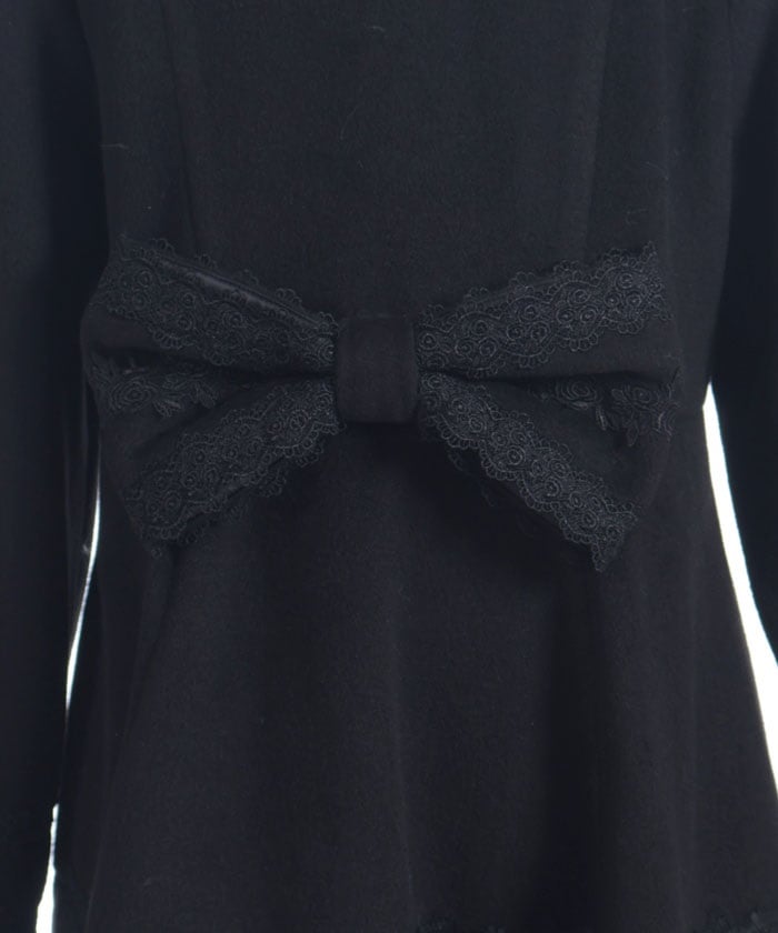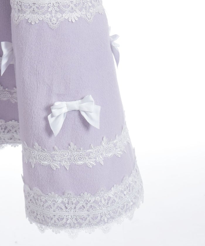 This long coat features a large, lace-trimmed ribbon at the collar. The ribbon is detachable with buttons, and even without it, the coat's round collar remains a charming design. The hem is also adorned with numerous ribbons, making it a piece you'll want to wear all day long!