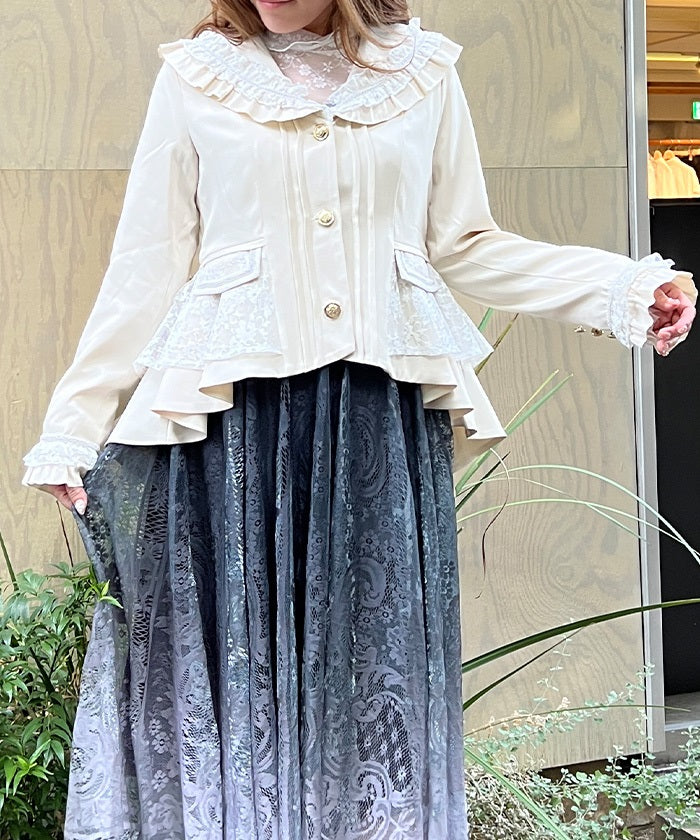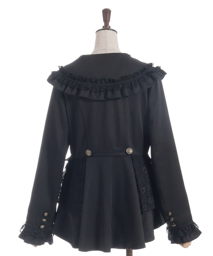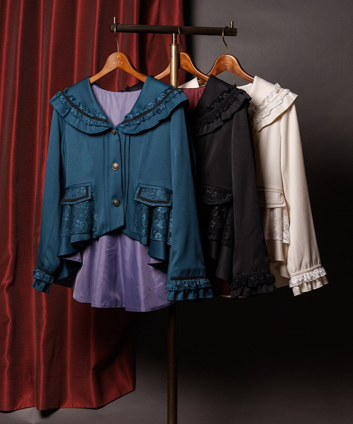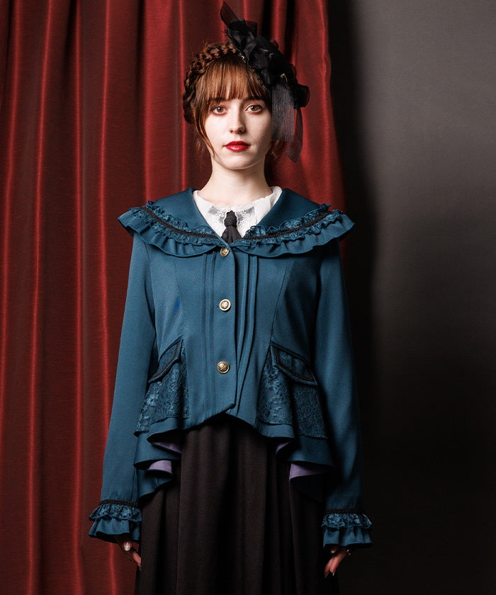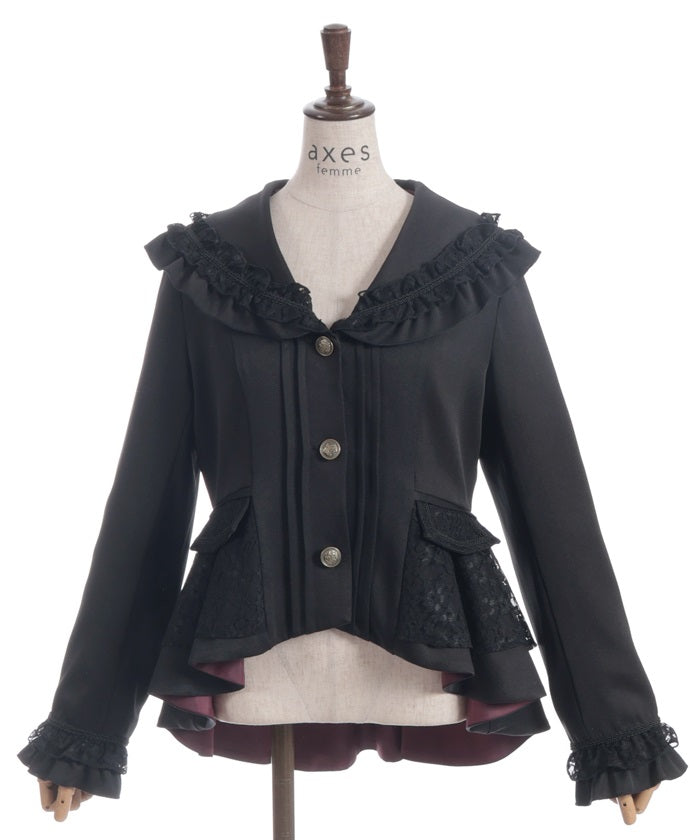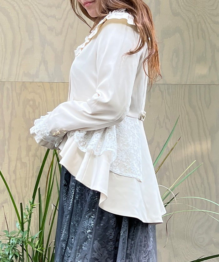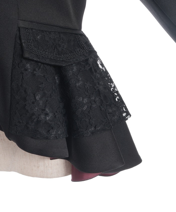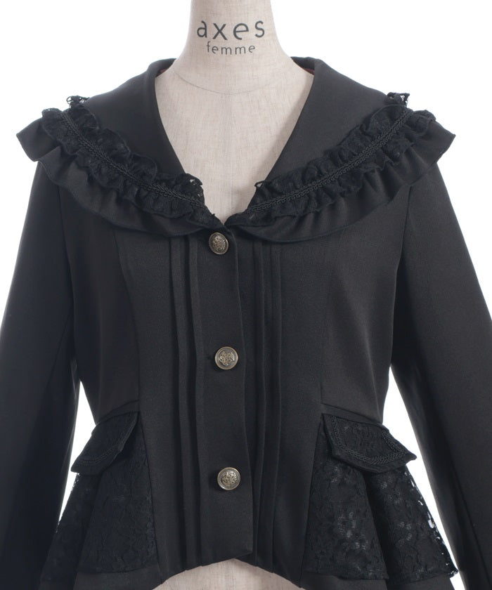 A shawl-collar jacket featuring eye-catching frills and lace.