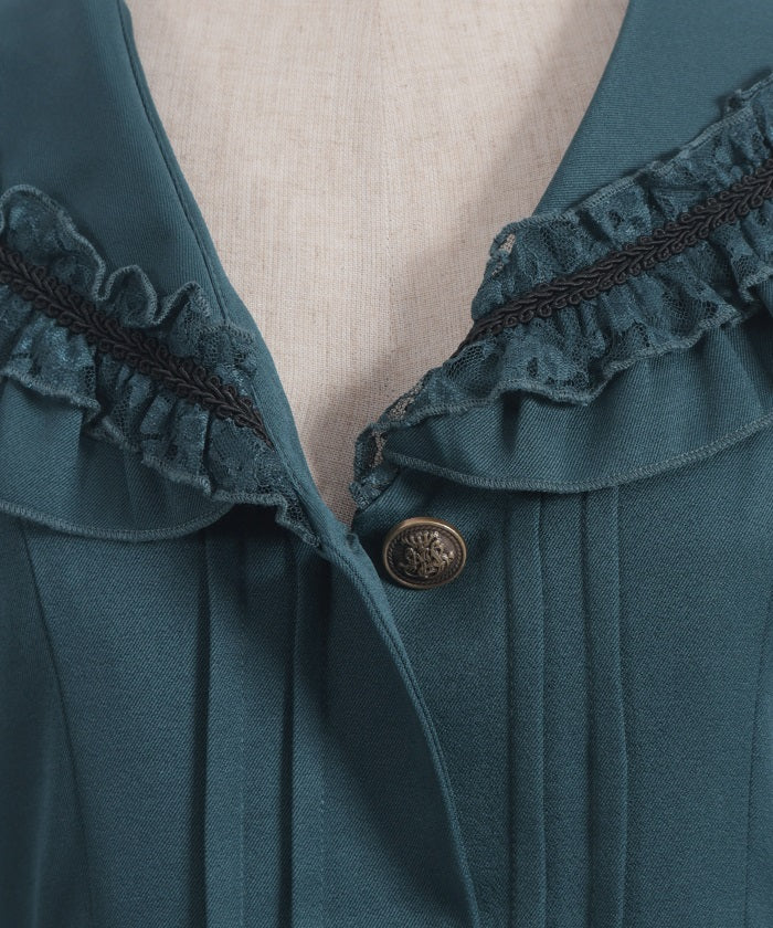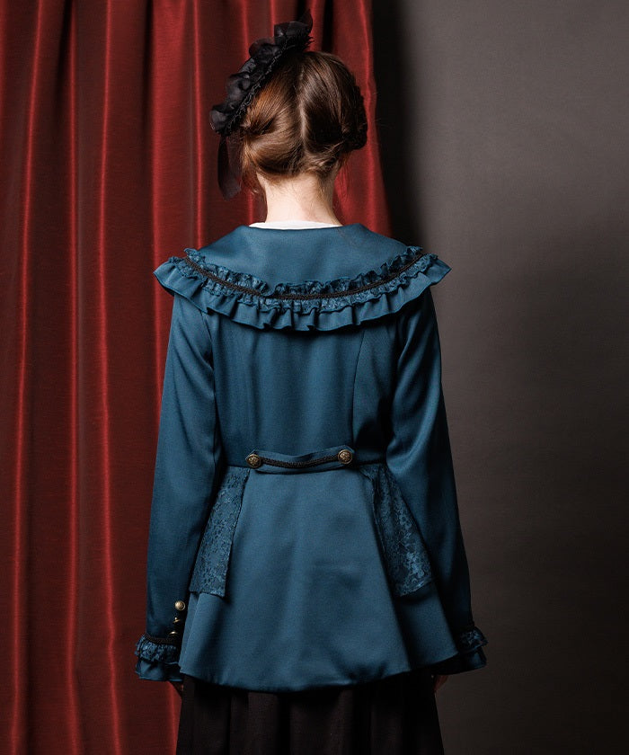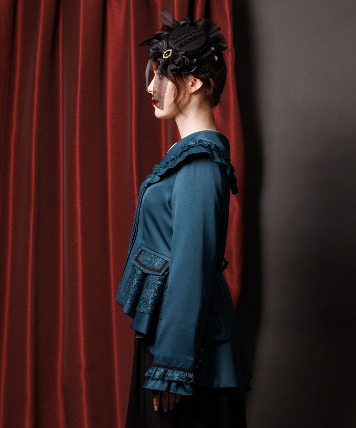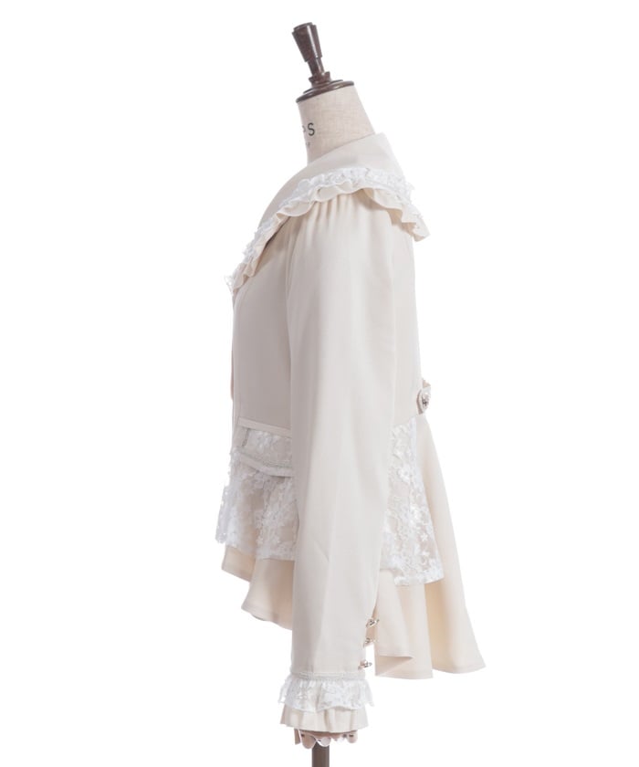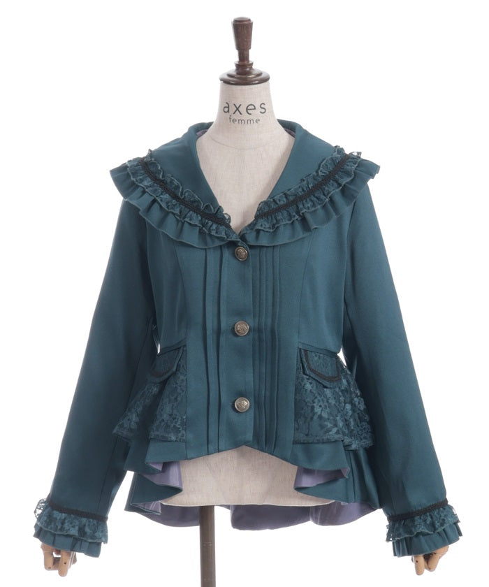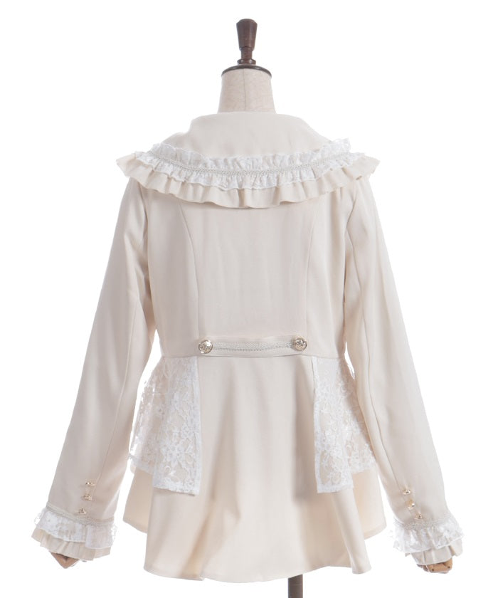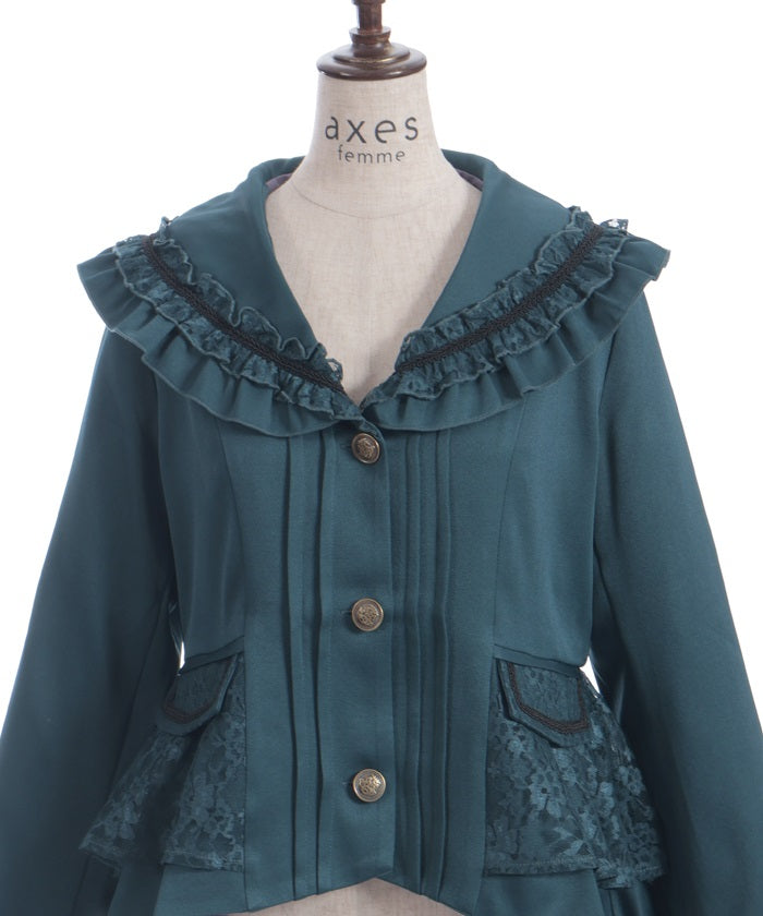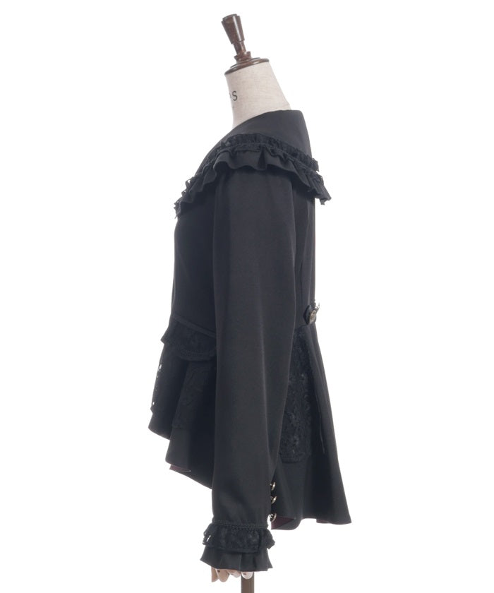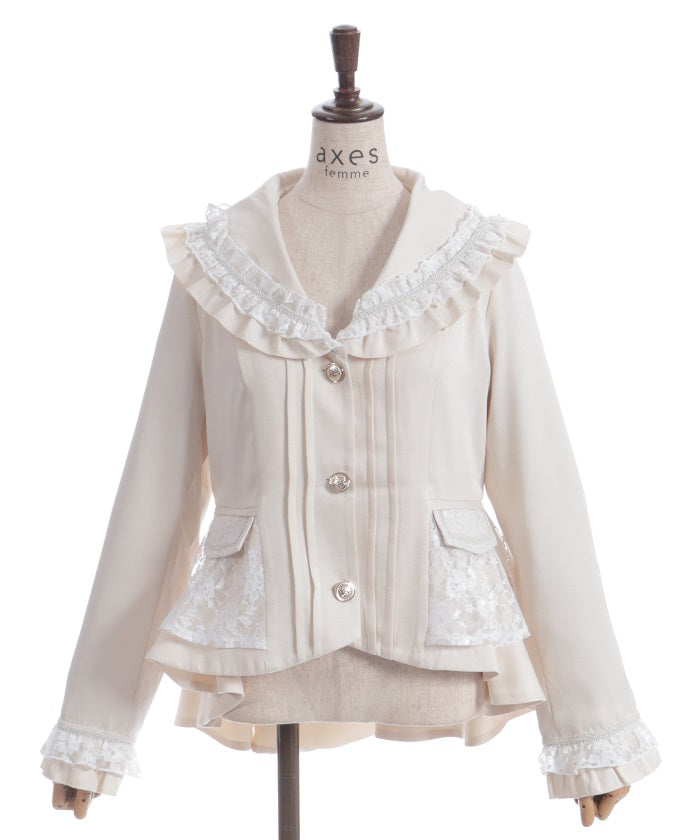 A shawl-collar jacket featuring eye-catching frills and lace.