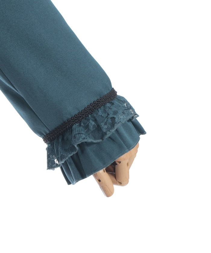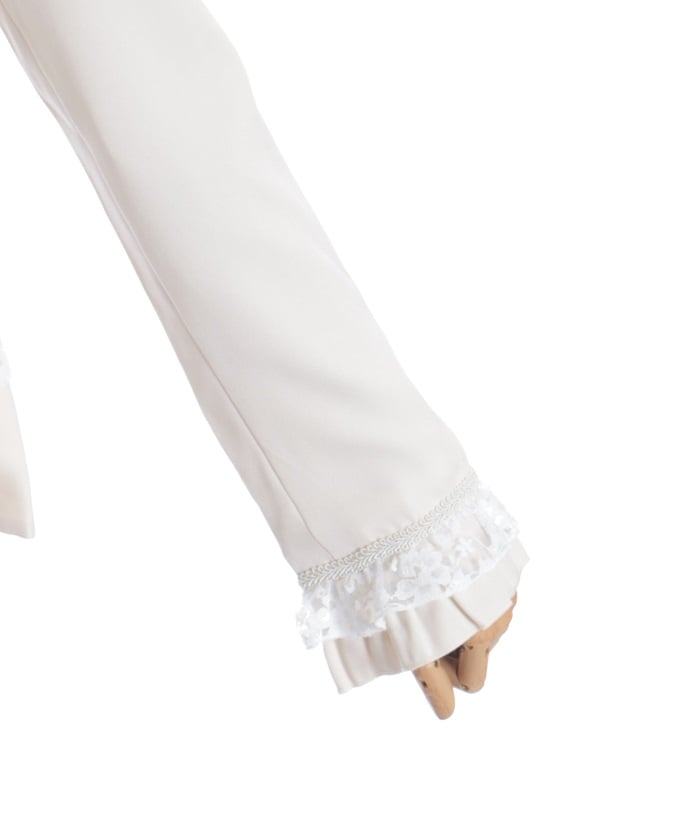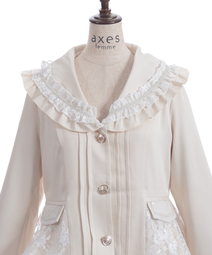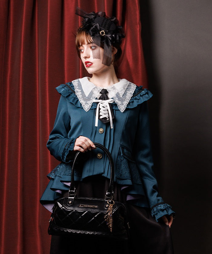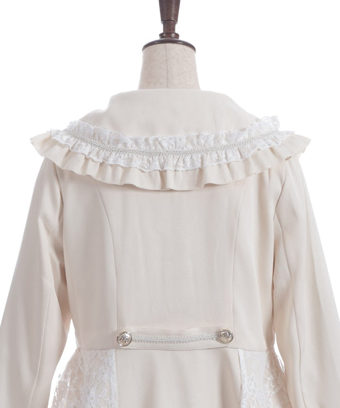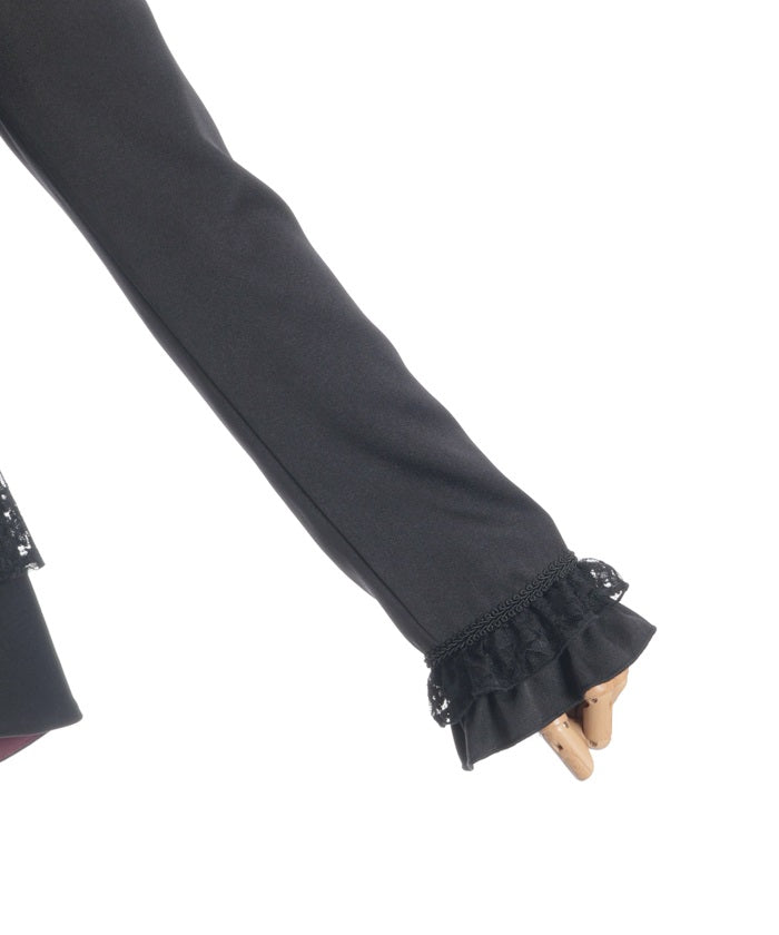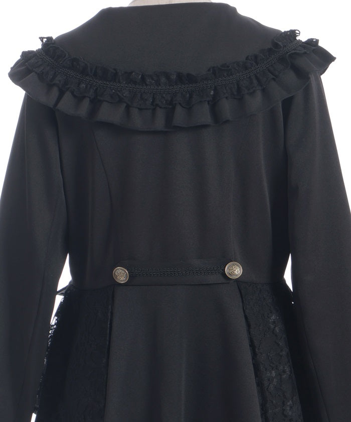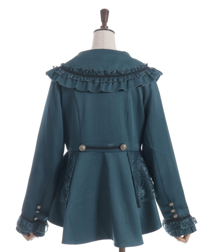 A shawl-collar jacket featuring eye-catching frills and lace.
