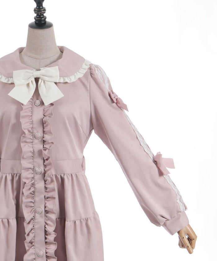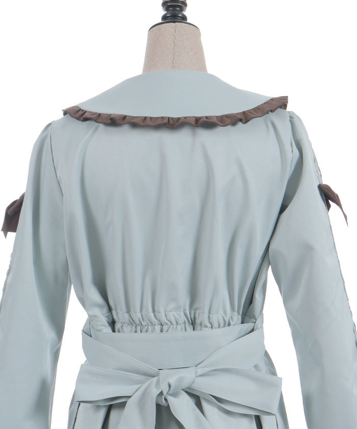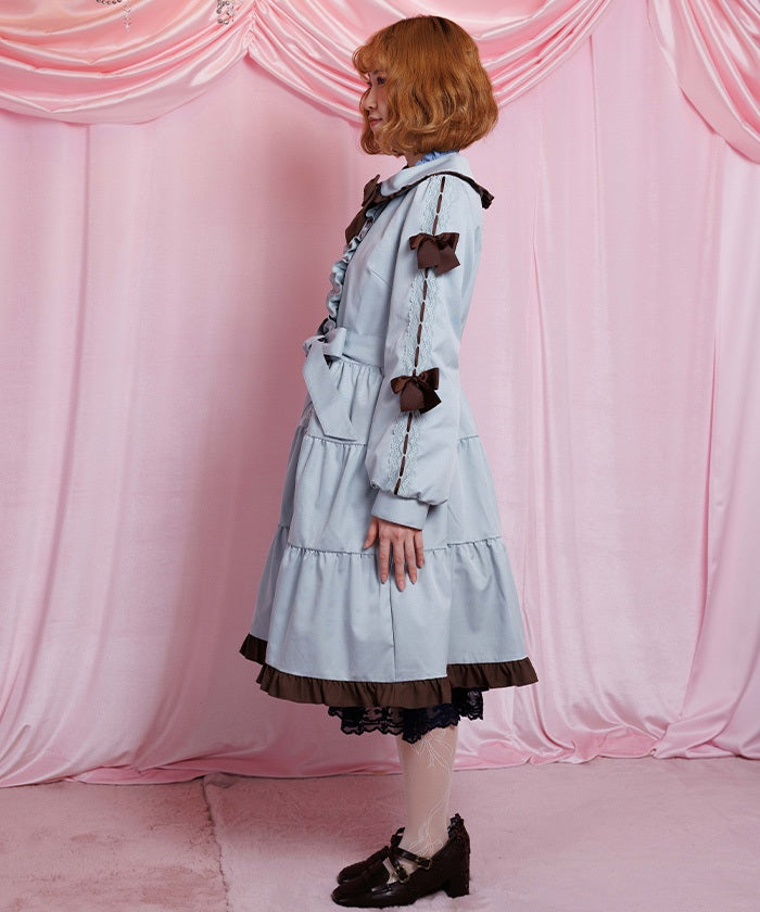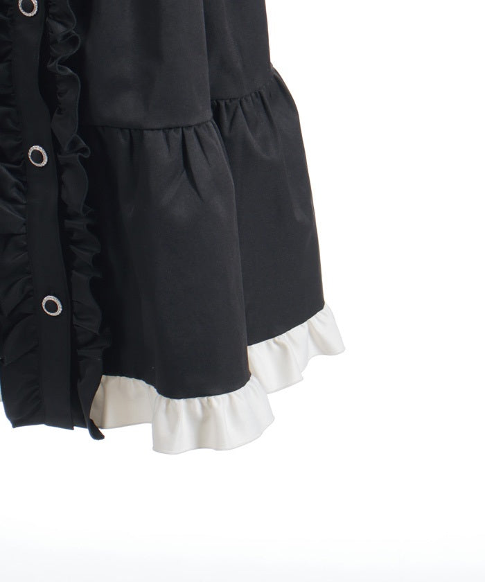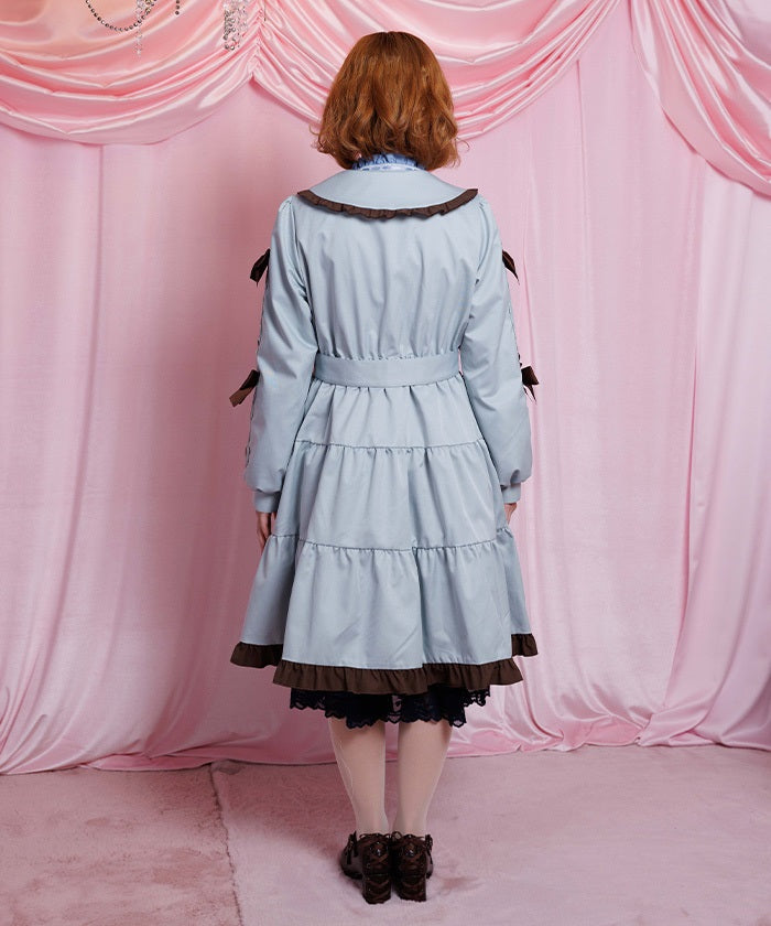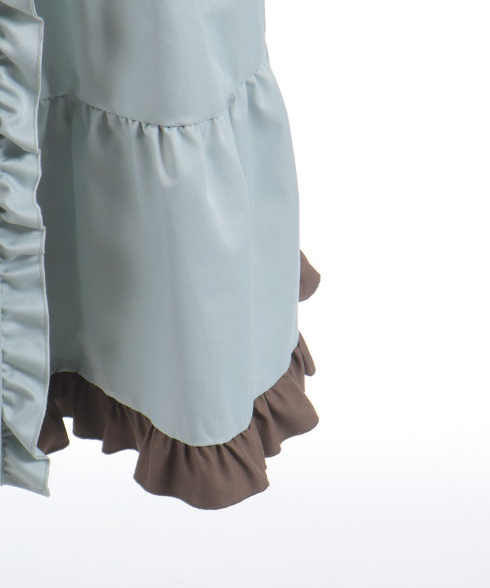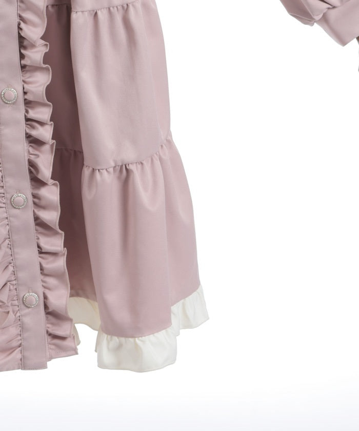 This one-piece coat features two-tone ruffles and a brooch.
