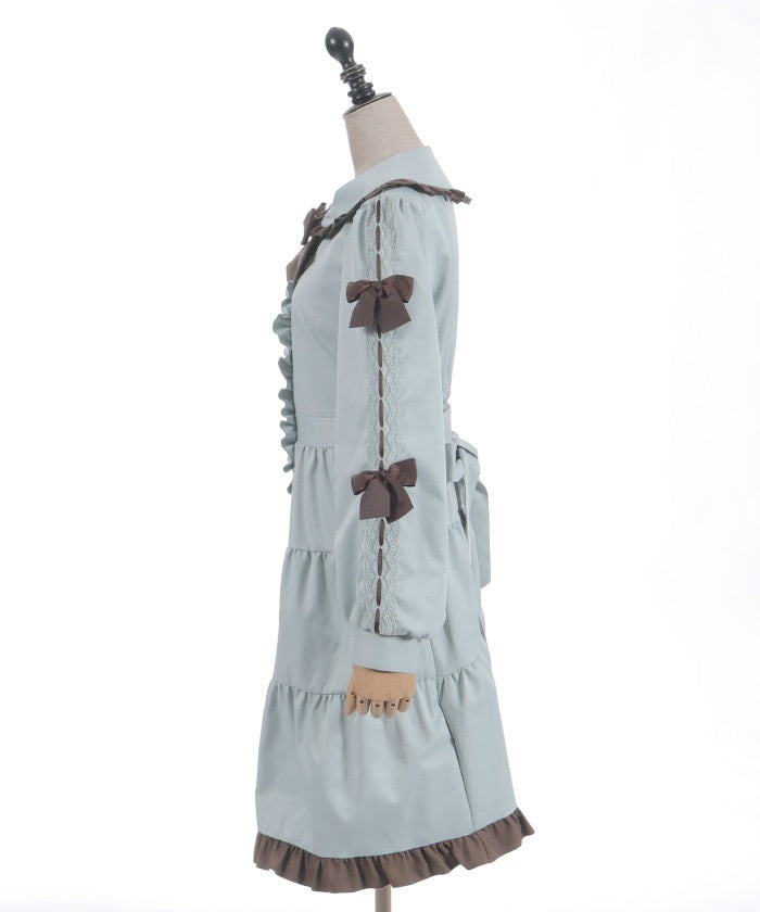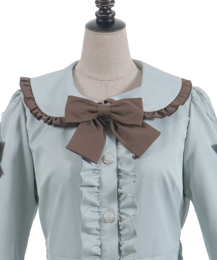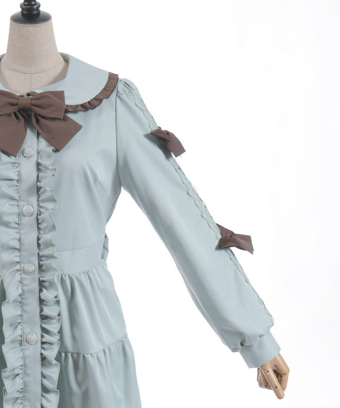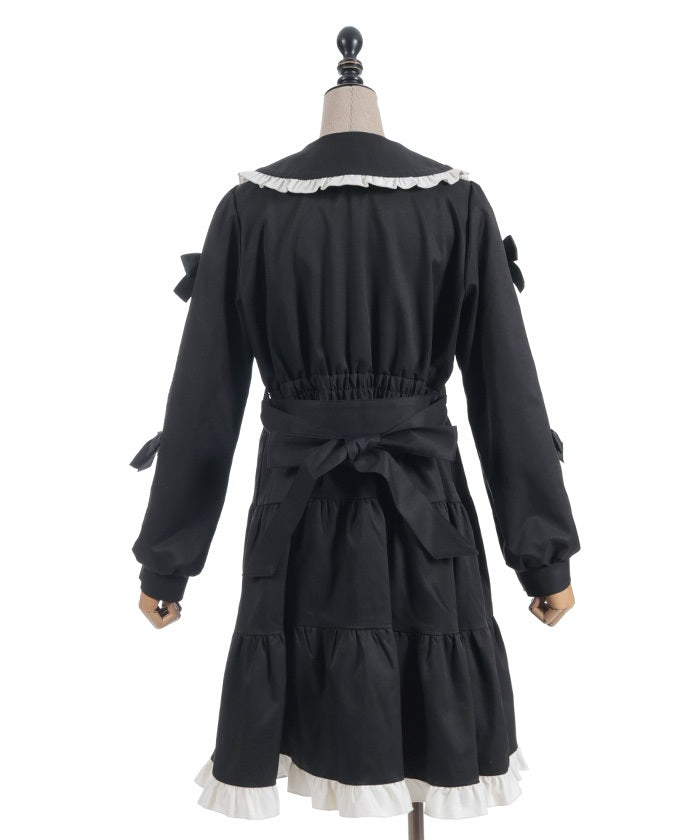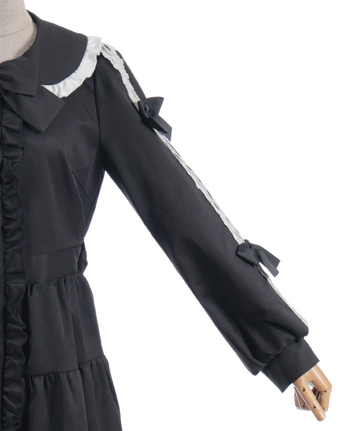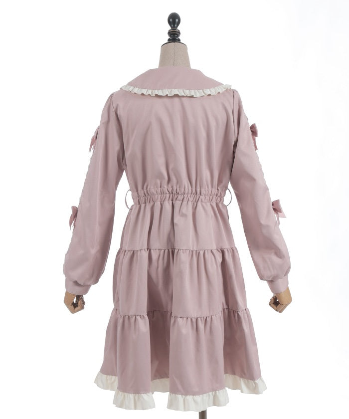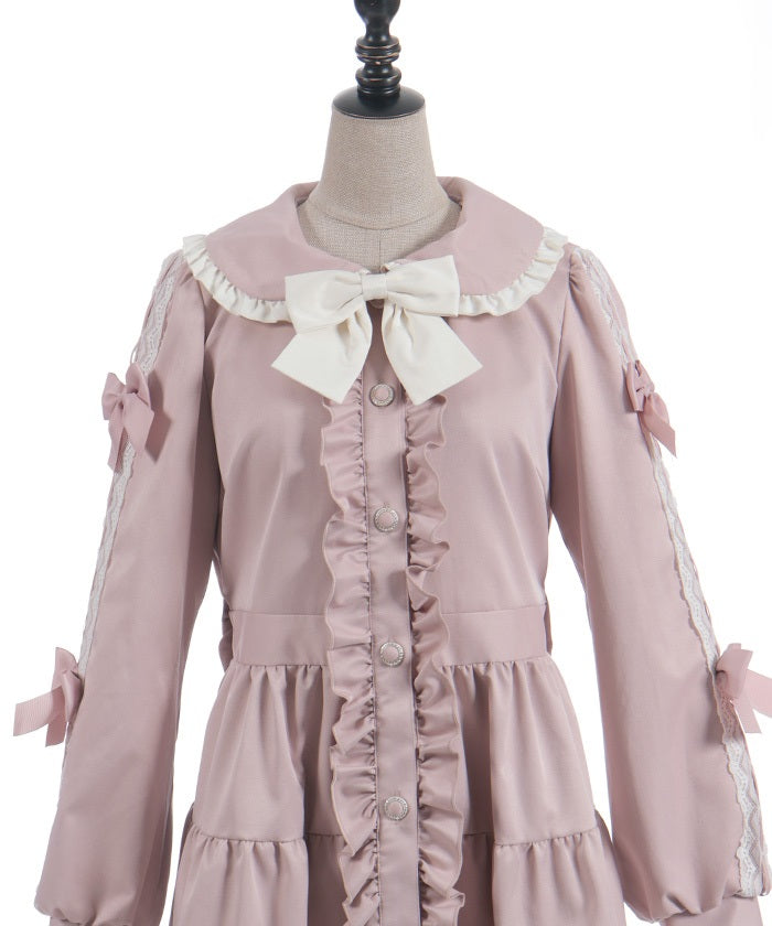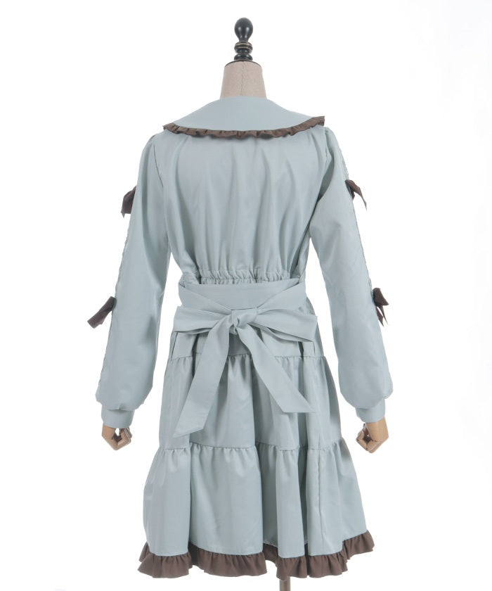 This one-piece coat features two-tone ruffles and a brooch.