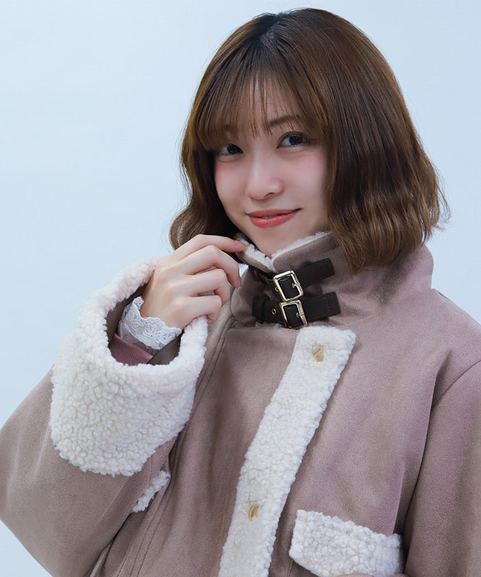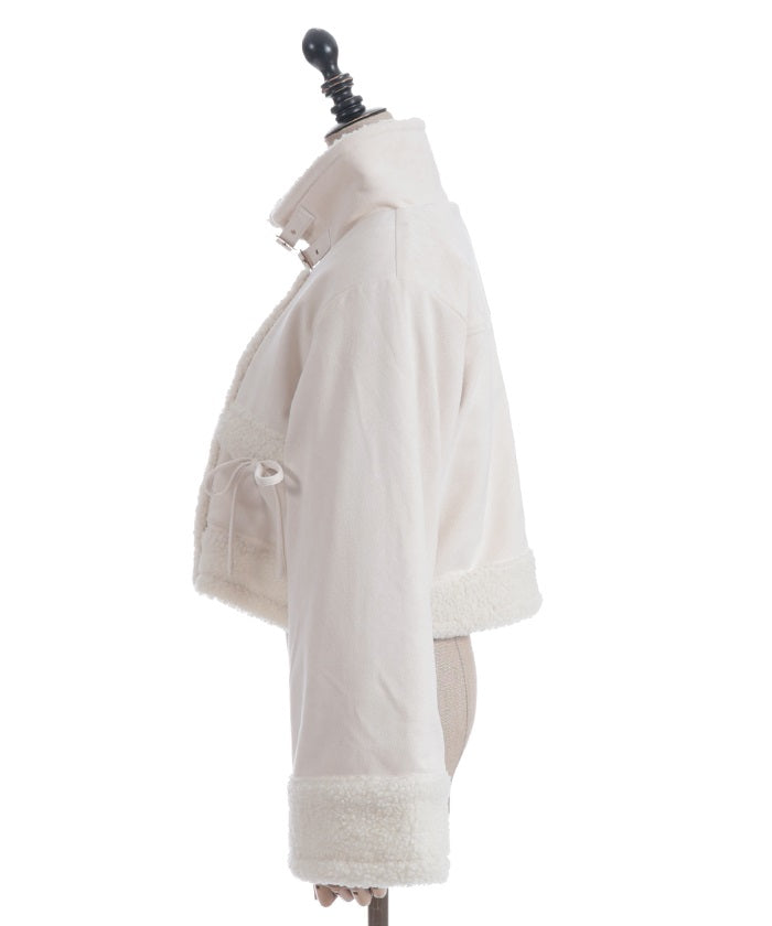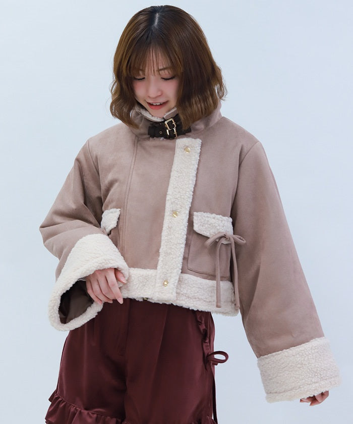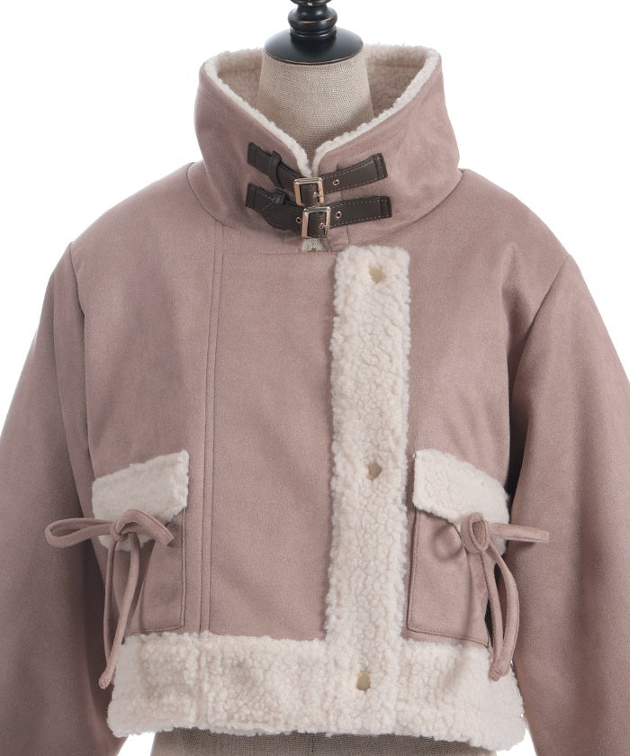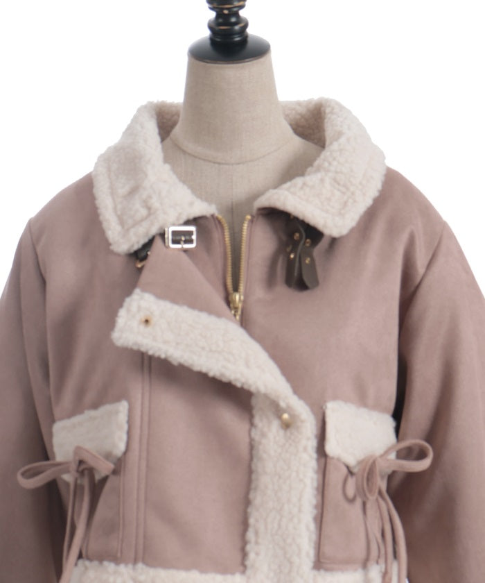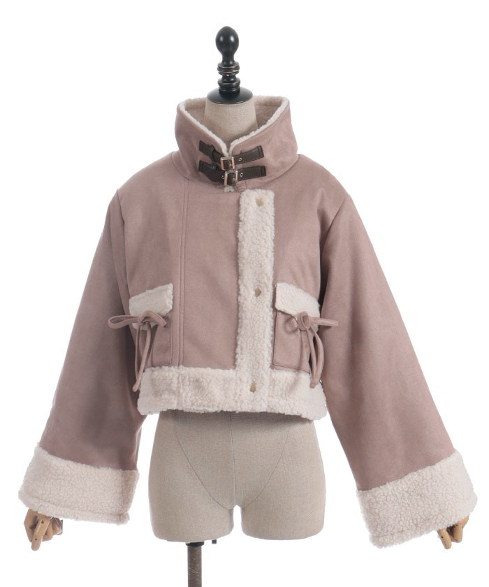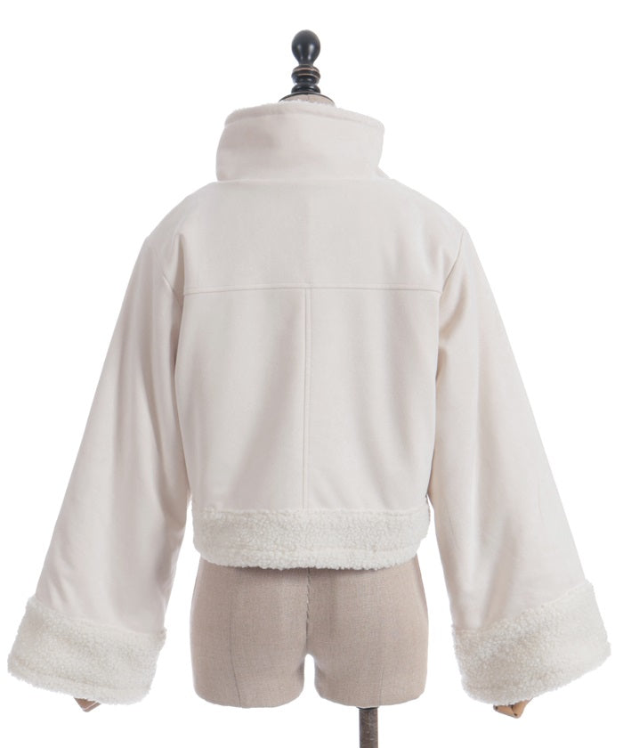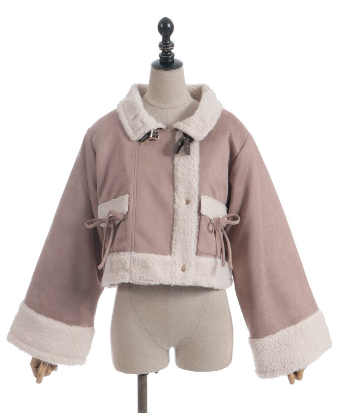A trendy short coat combining suede and fleece.