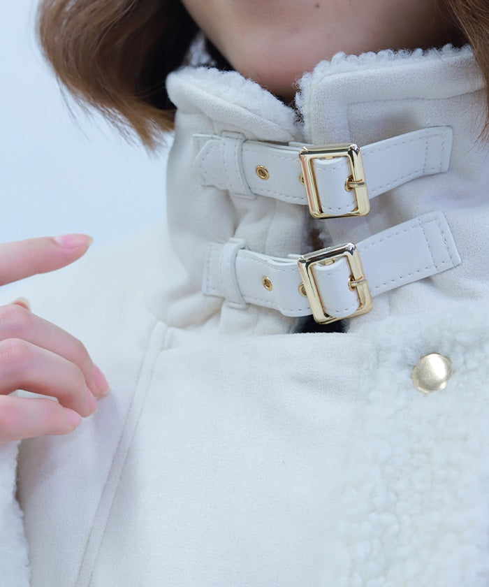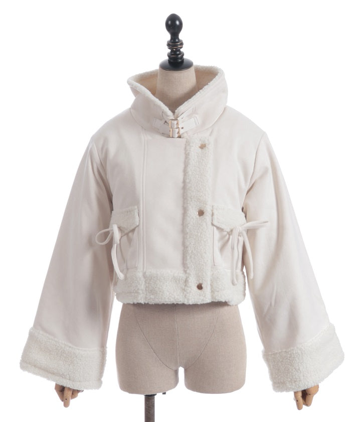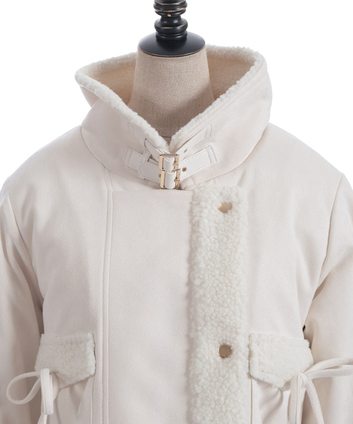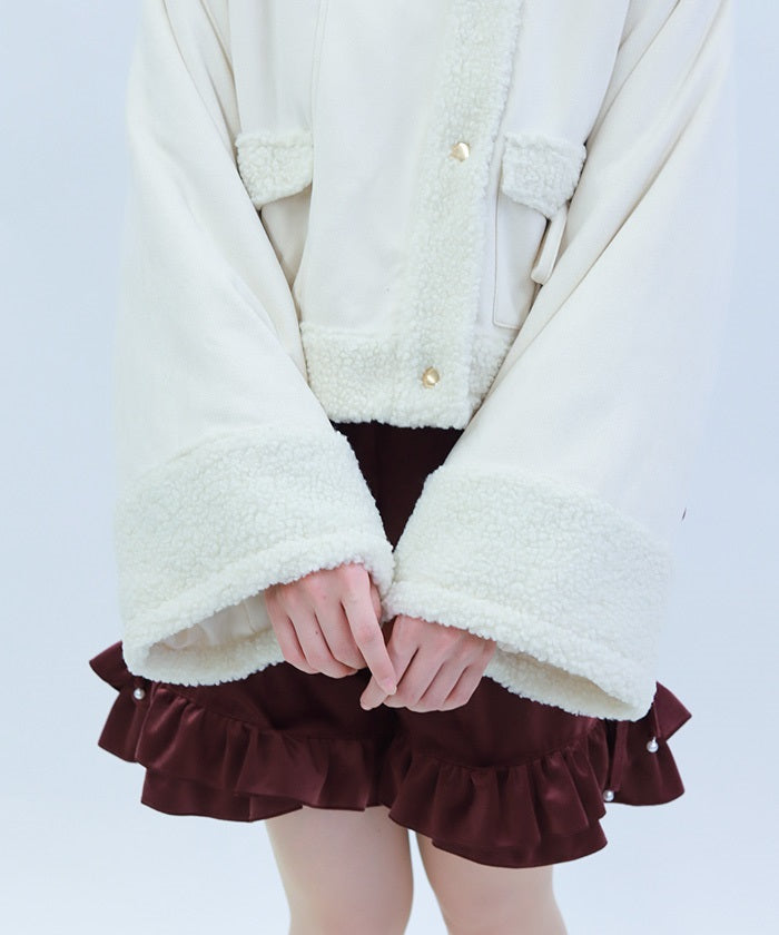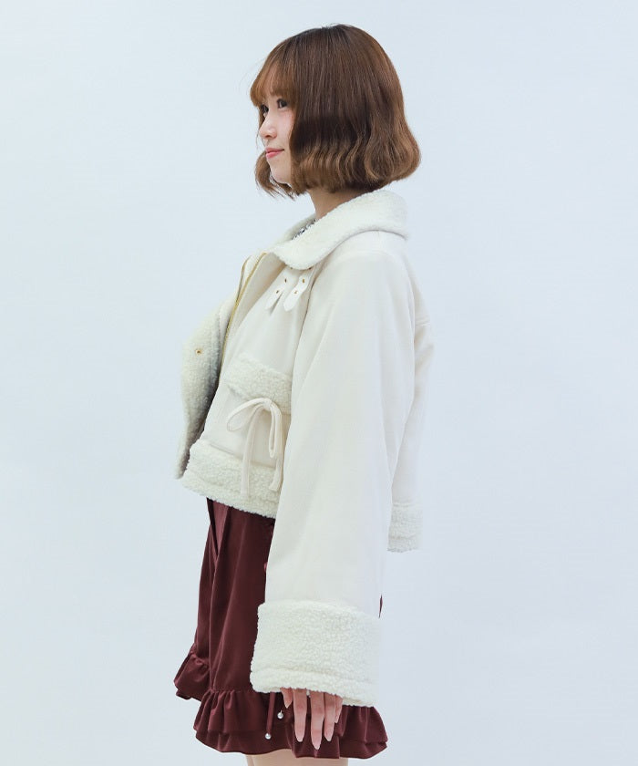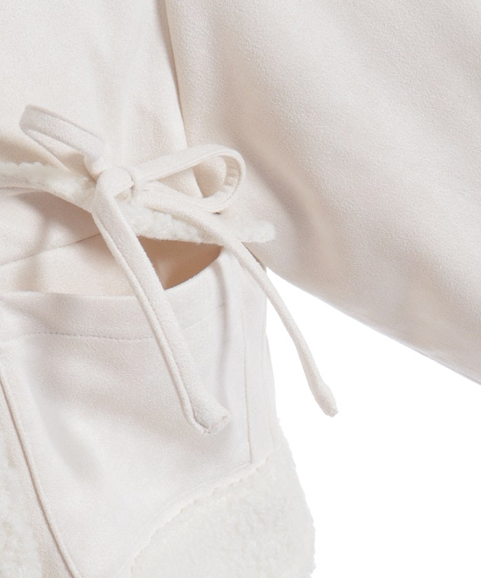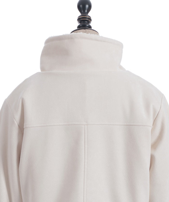 A trendy short coat combining suede and fleece.