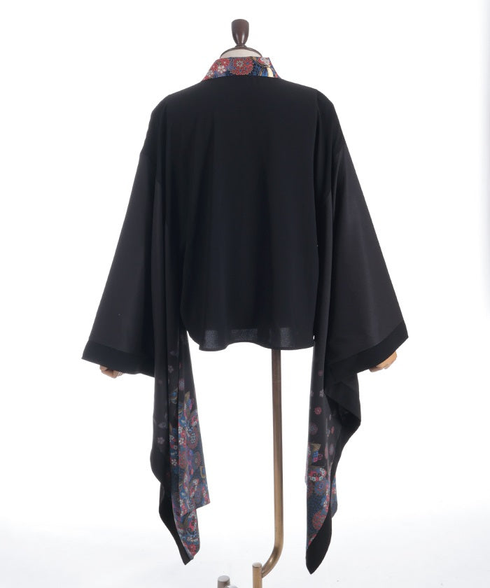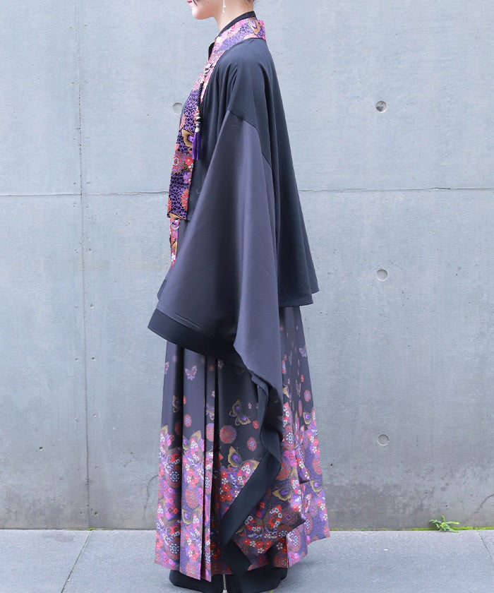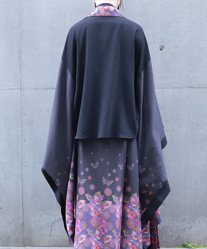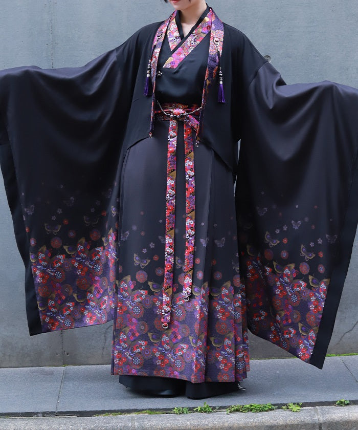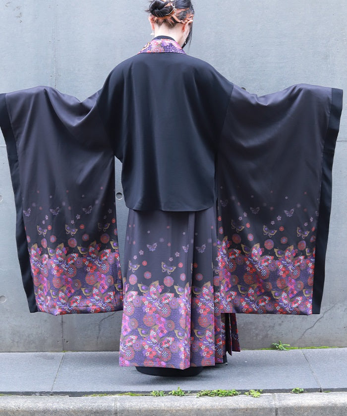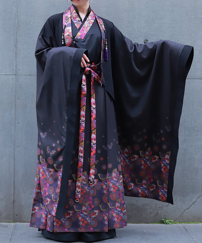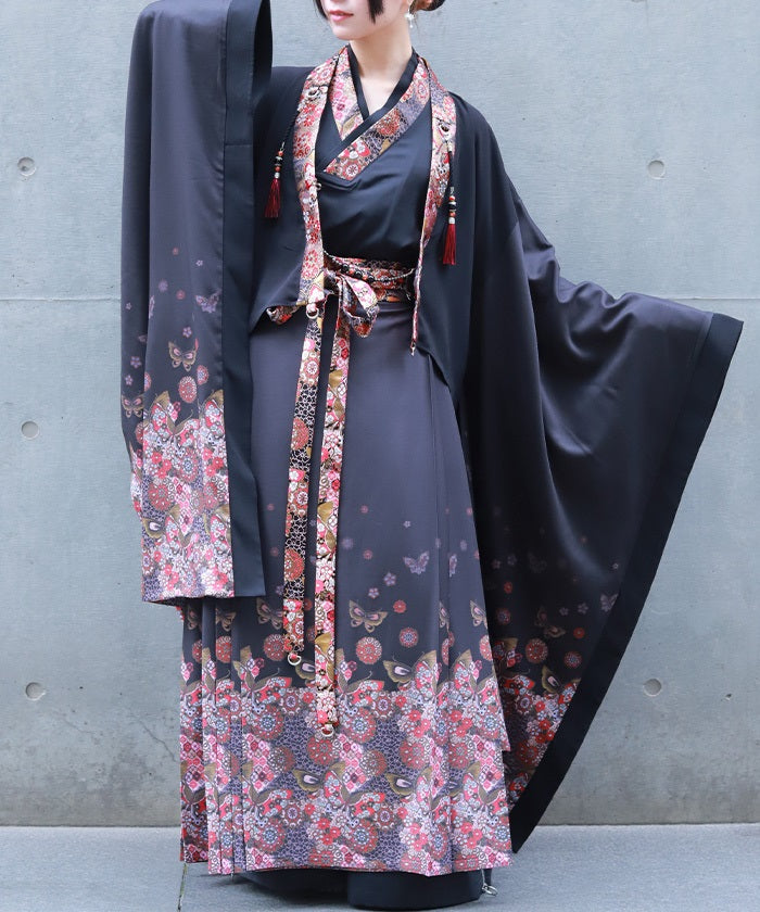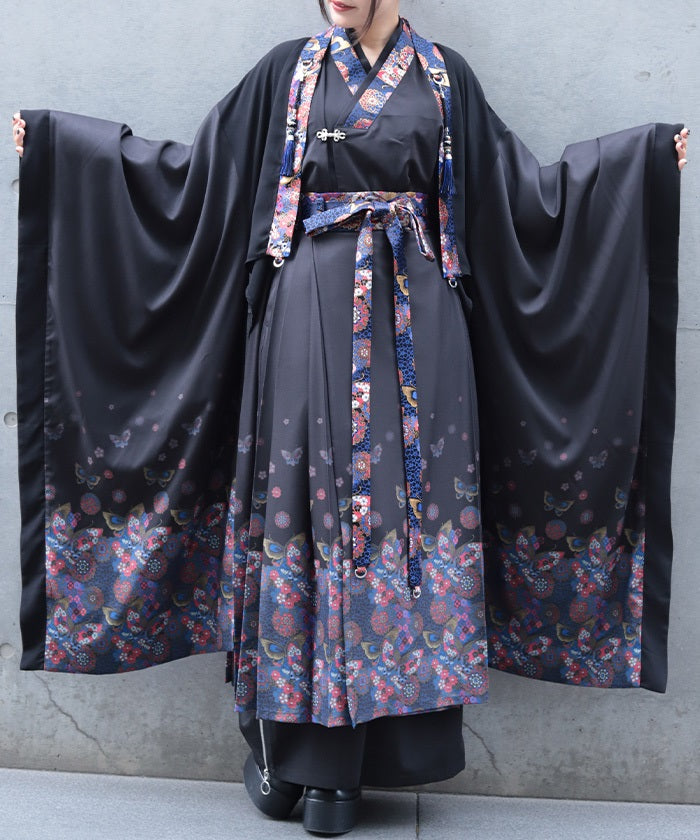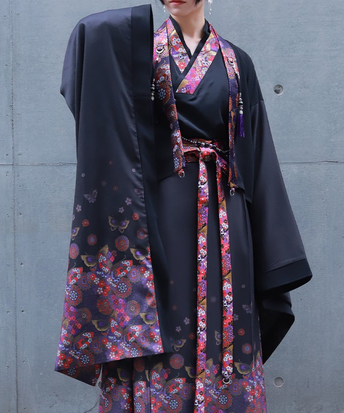 The vibrantly colored jacquard fabric, depicting blooming flowers and dancing butterflies, creates a striking presence.